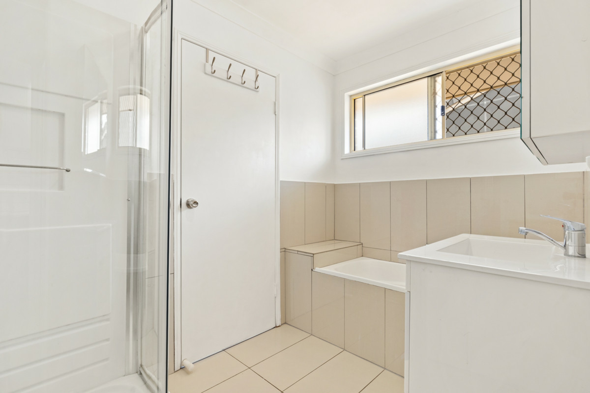 There is an updated two-way bathroom with a neutral colour palette, stone bench top, a separate bathtub, shower and a new separate toilet.