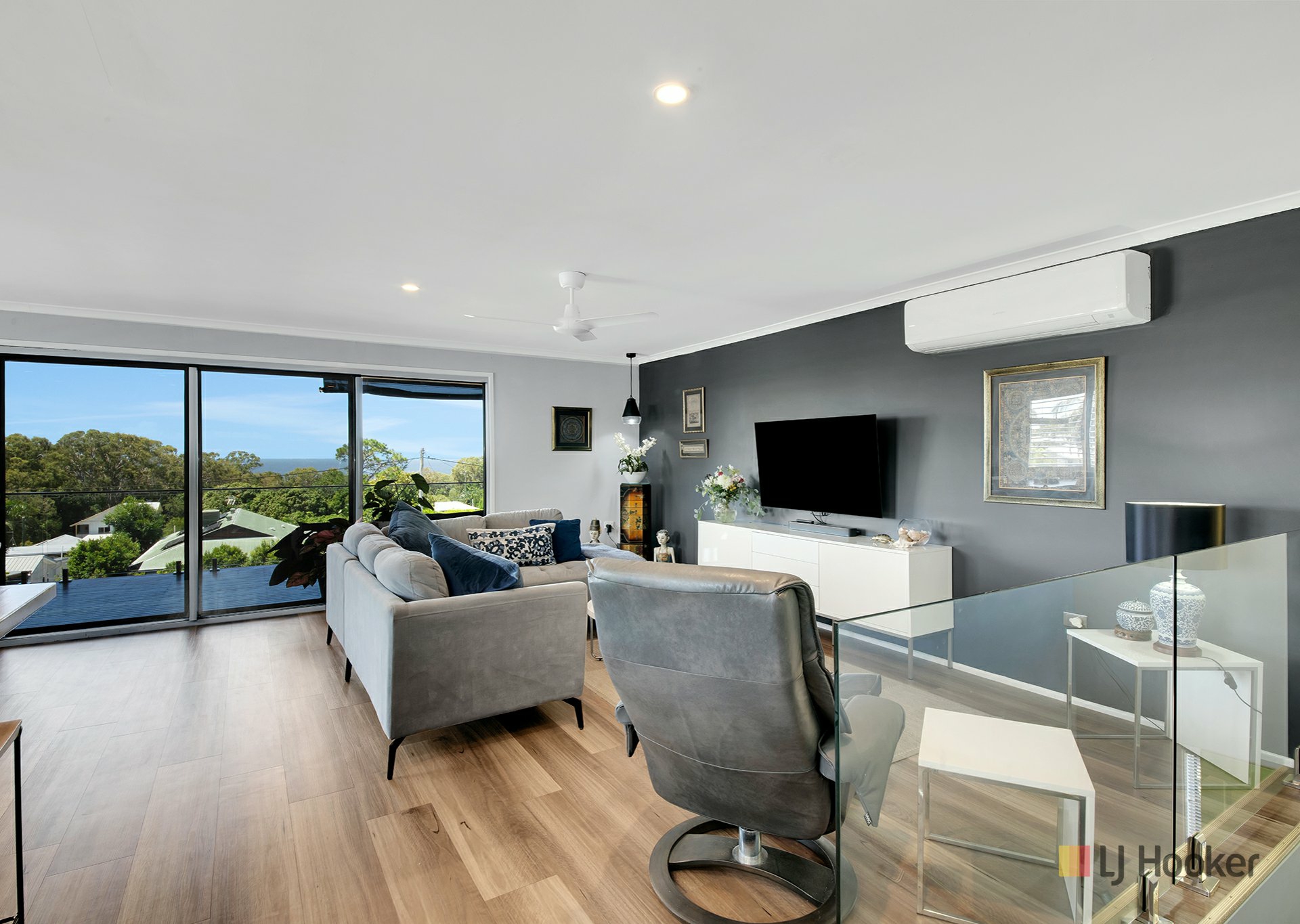 The property boasts a solid brick-rendered construction, featuring an upper level that offers an open-plan, air-conditioned living space. The seamless flow through stacker doors leads you to a charming front timber patio—an ideal spot for relaxation or entertaining family and friends while soaking in the stunning ocean vistas.
