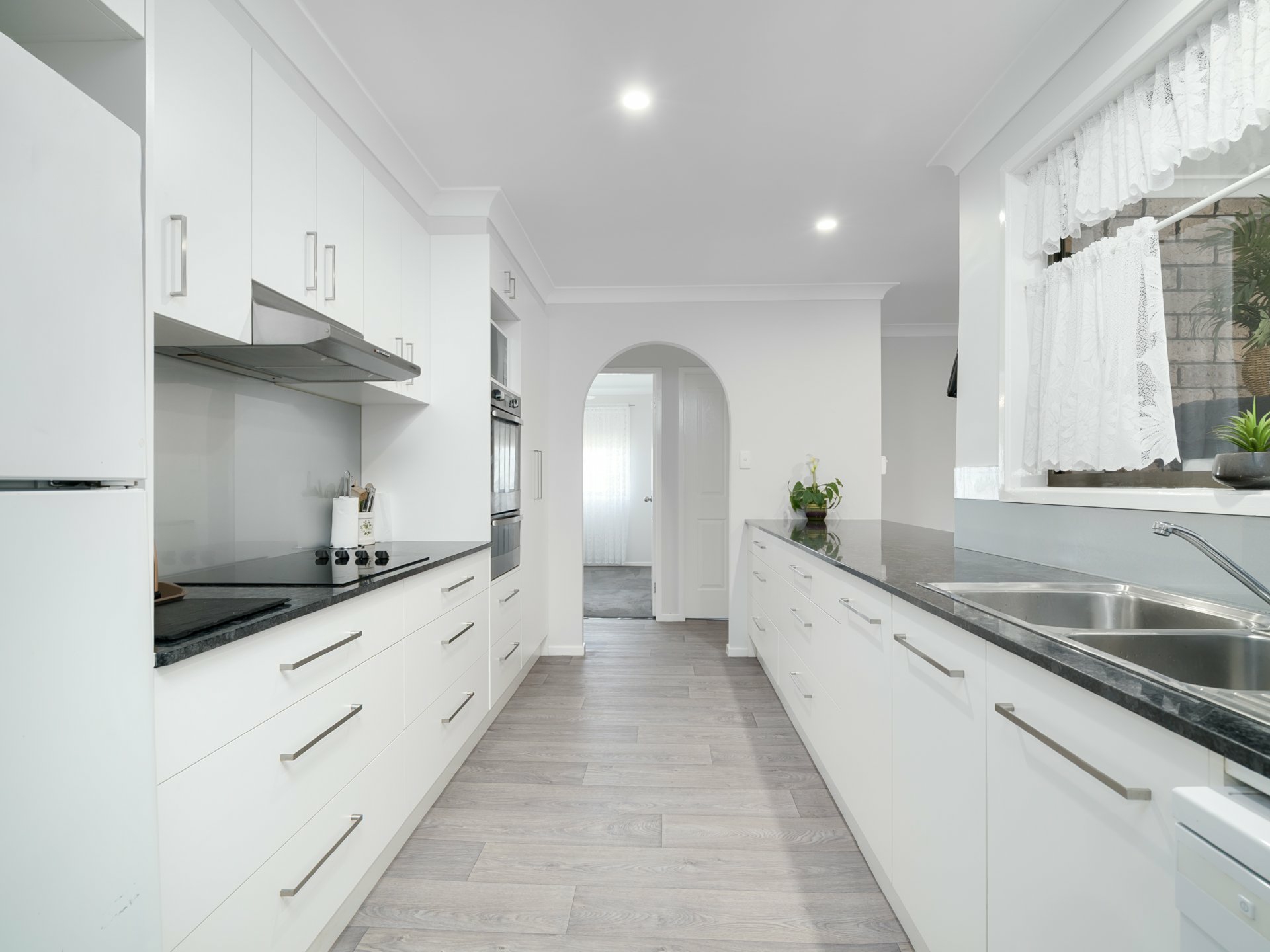 - Galley-style kitchen in charcoal and white tones, featuring ample bench and storage space, a breakfast bench, dishwasher, wall oven, and ceramic cooktop