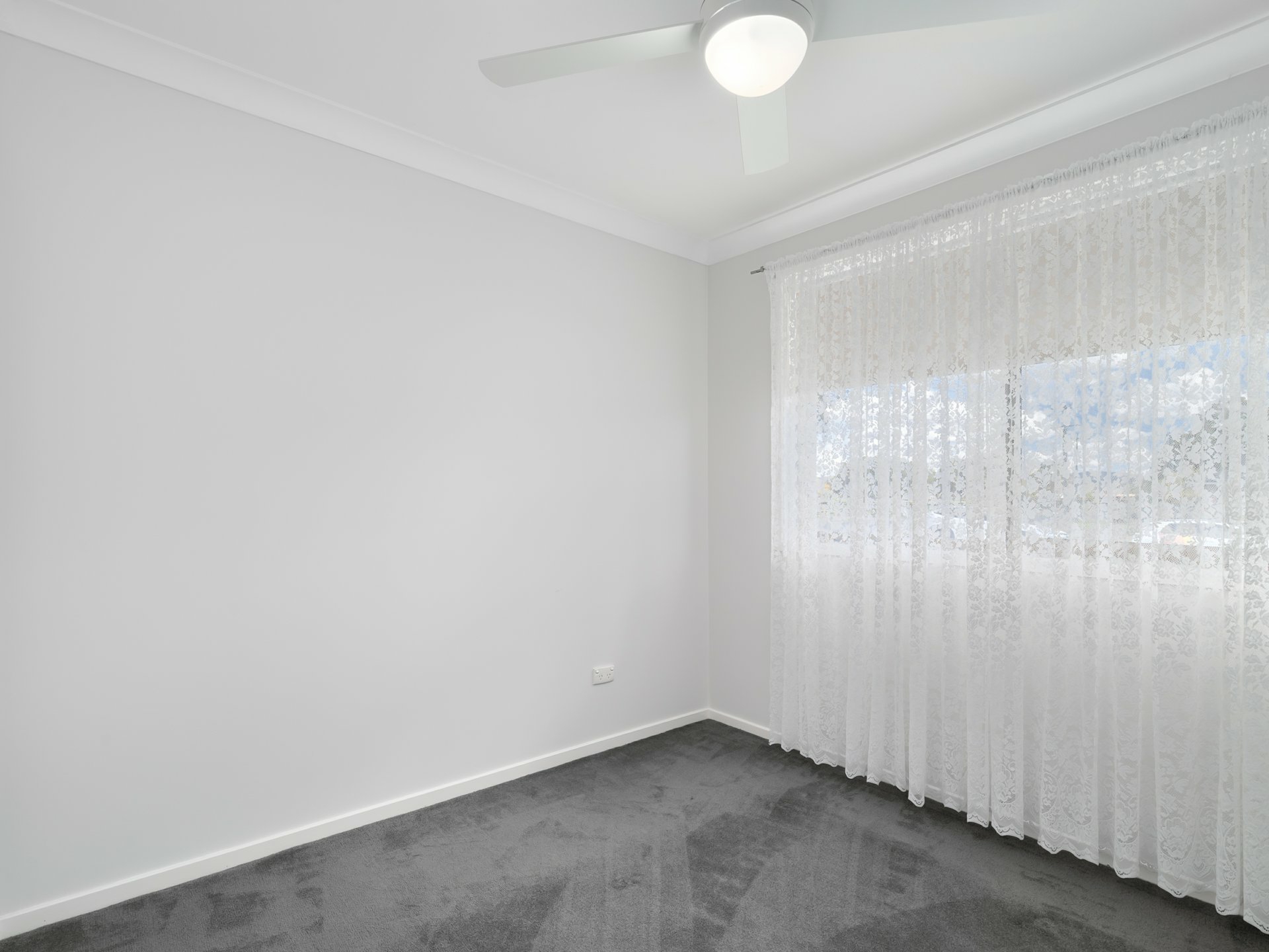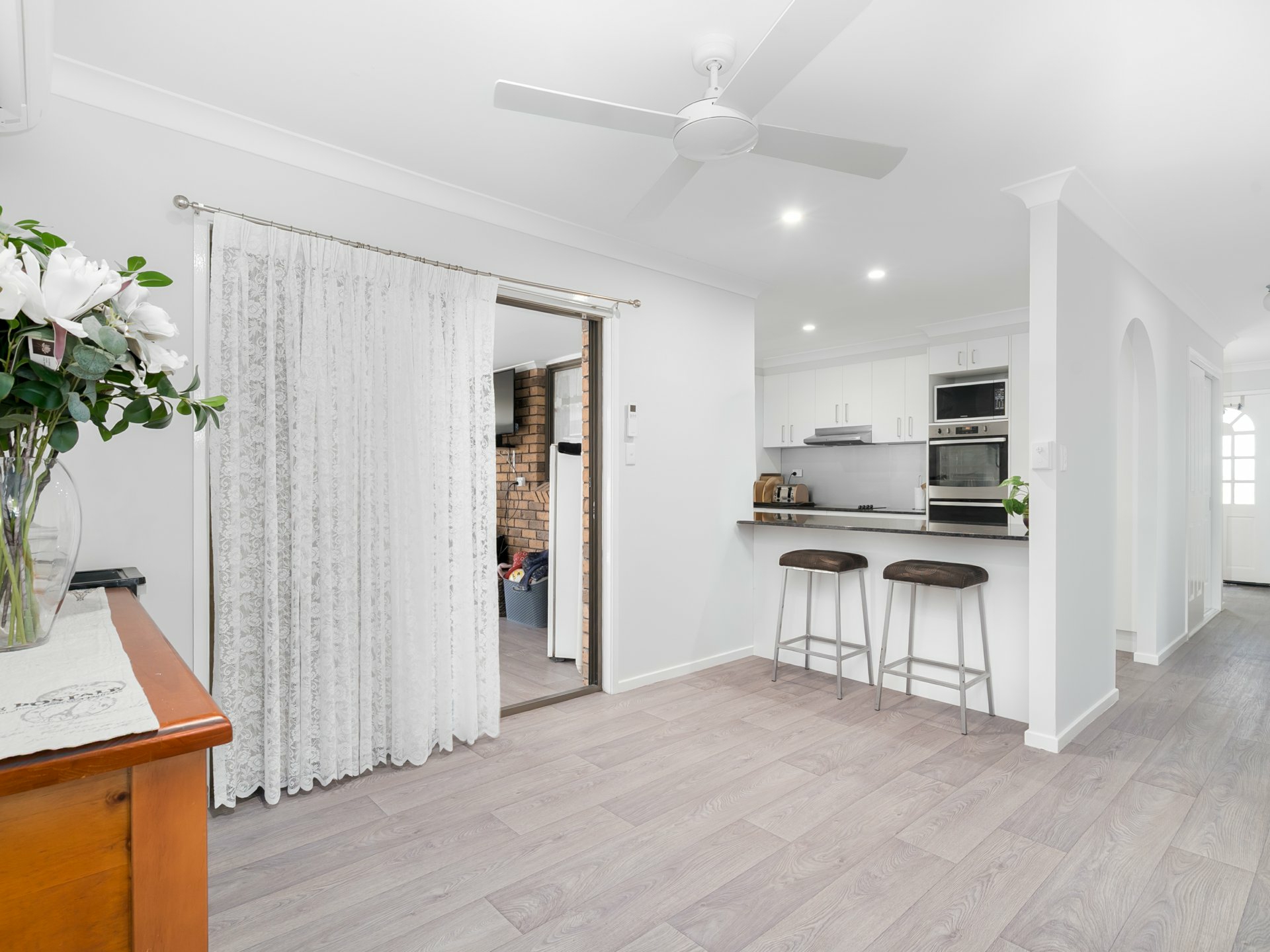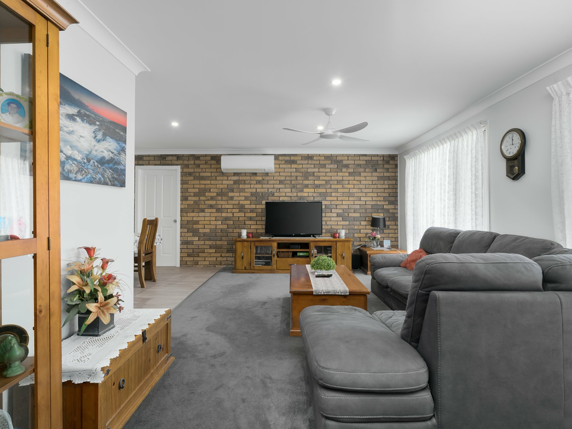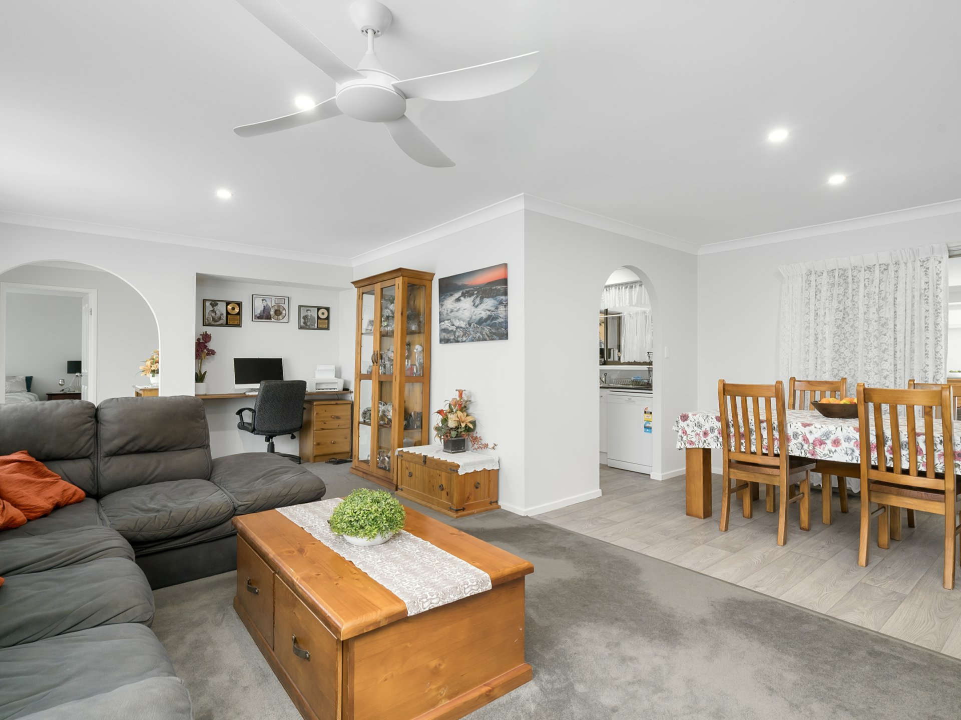 - The lounge room features stylish charcoal carpeting, air conditioning, a ceiling fan, large windows that invite natural light, a convenient study nook, and an adjoining dining area for seamless living