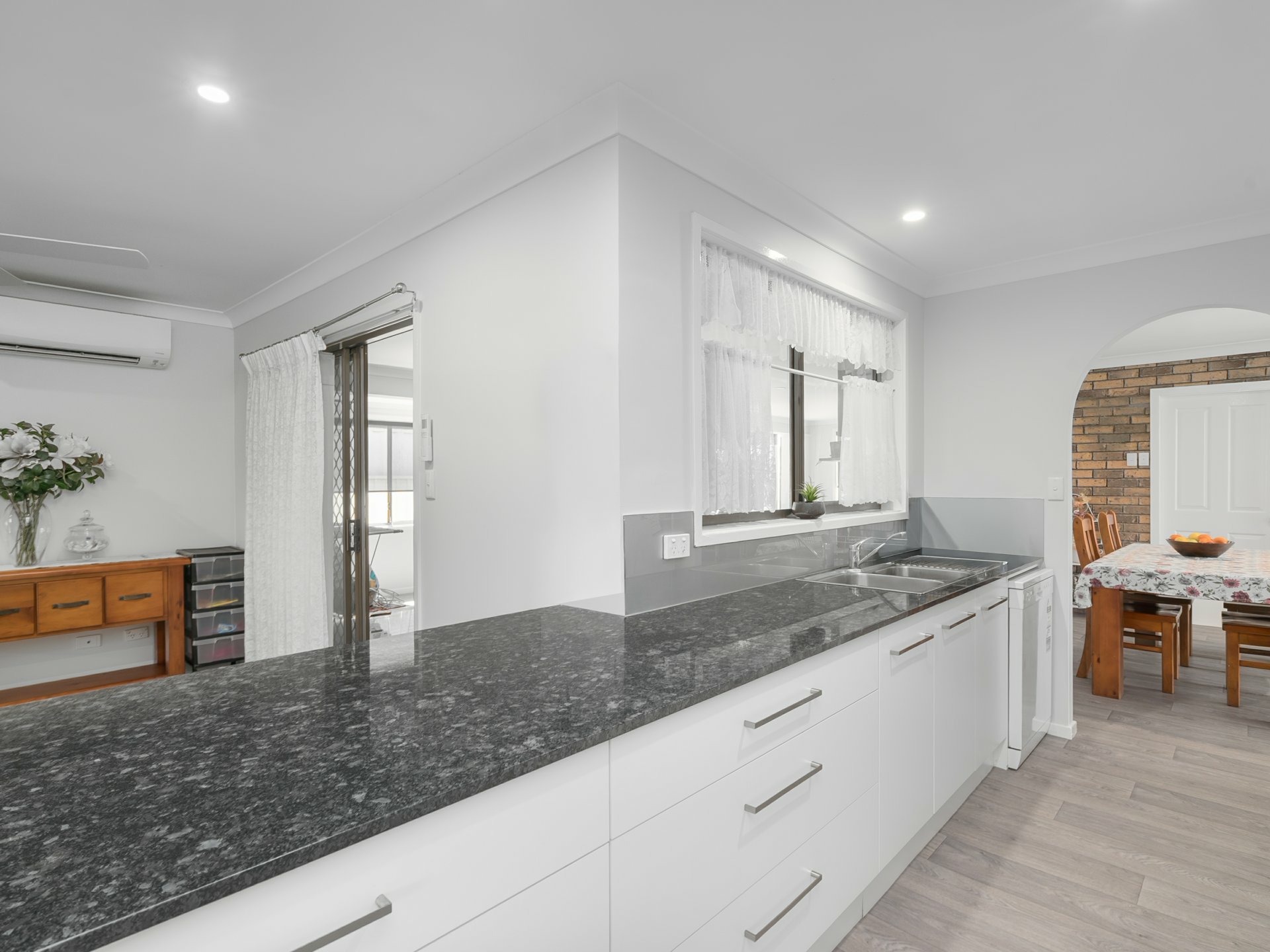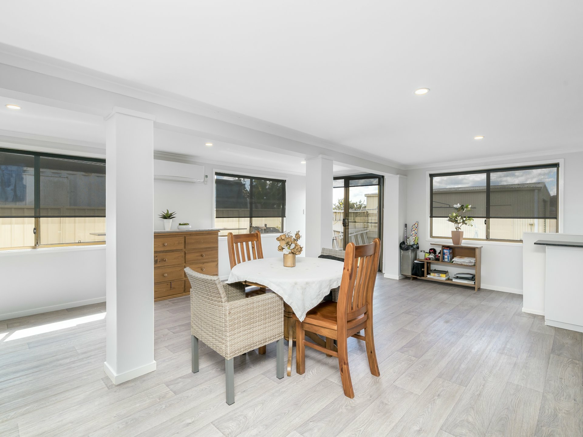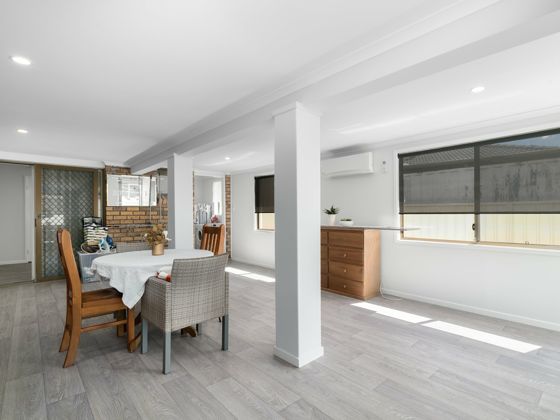 - Additional living areas include a space adjacent to the kitchen that opens onto a large sunroom with air conditioning, which also provides access to the laundry