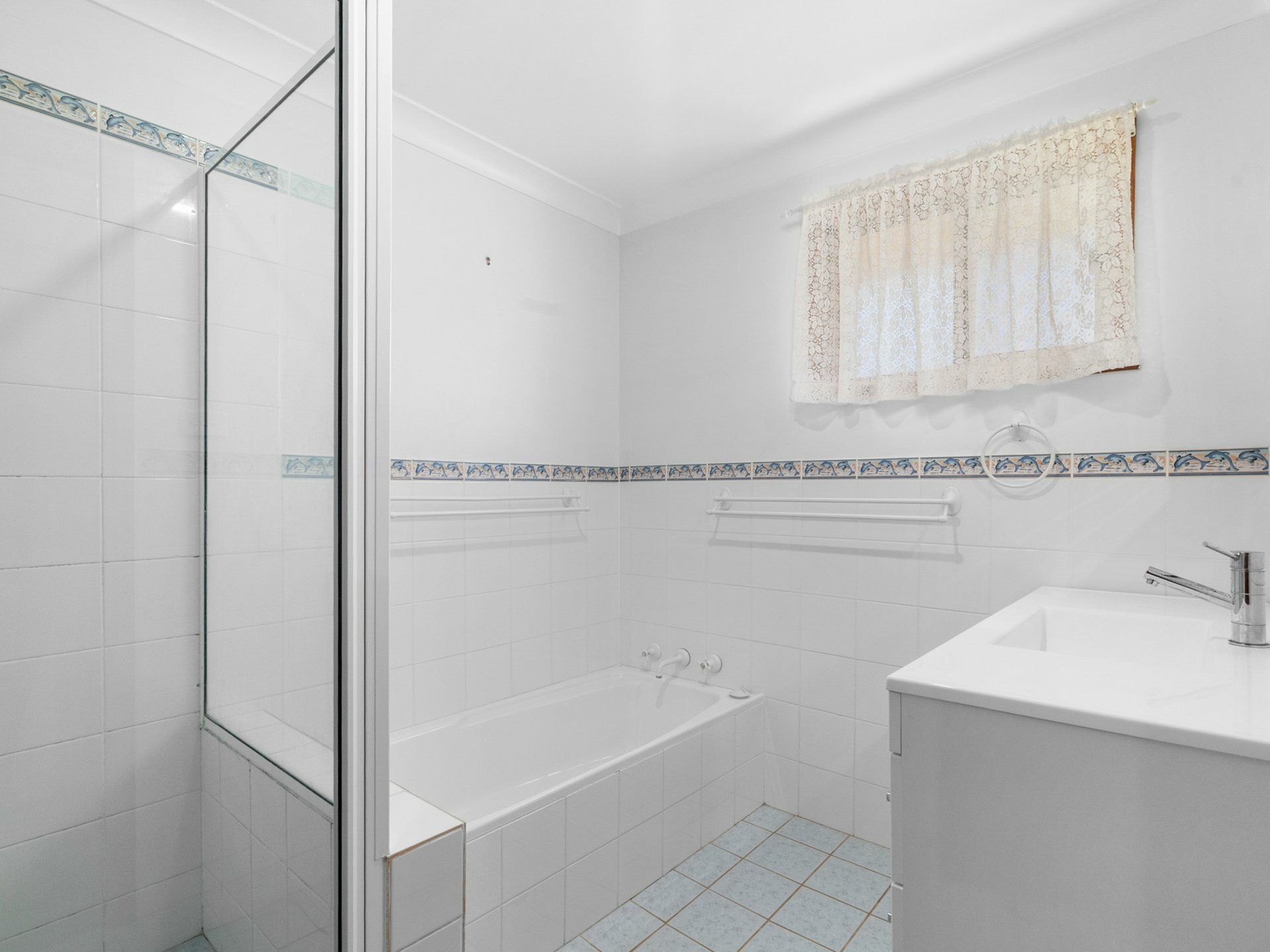 - The tidy main bathroom features a neutral colour palette and includes a separate toilet