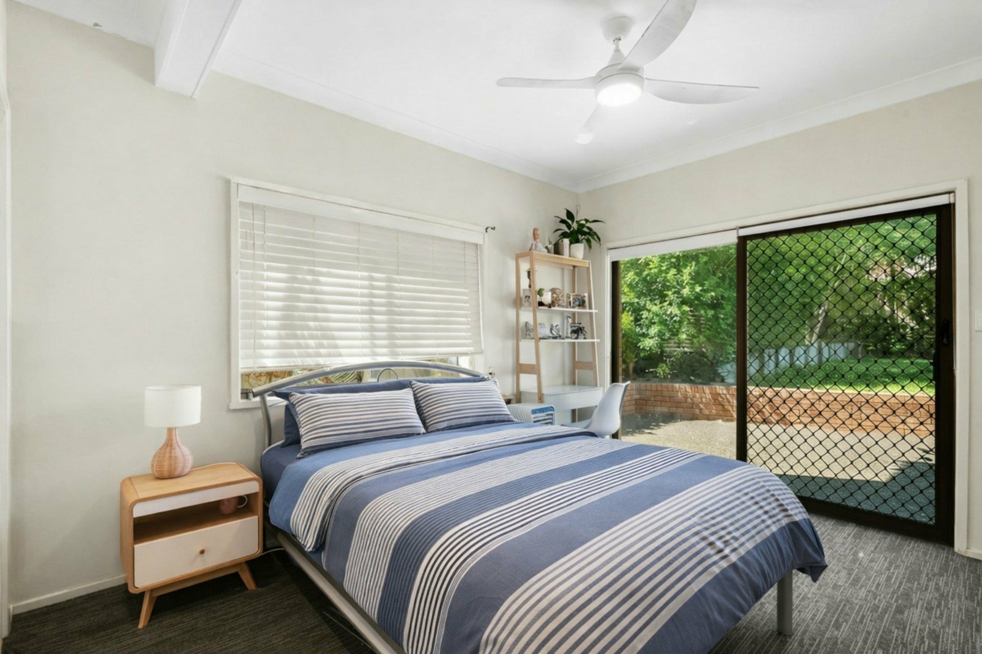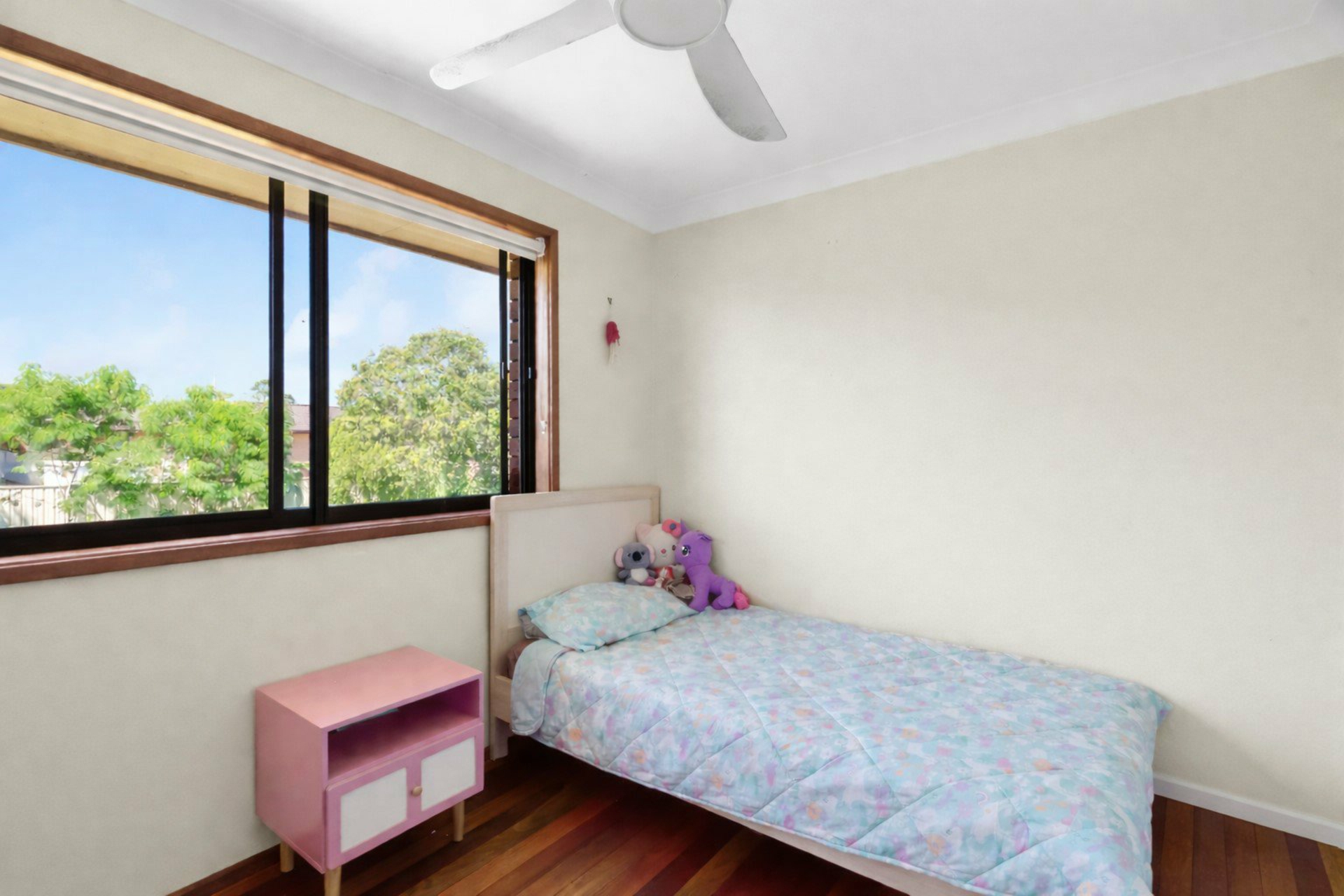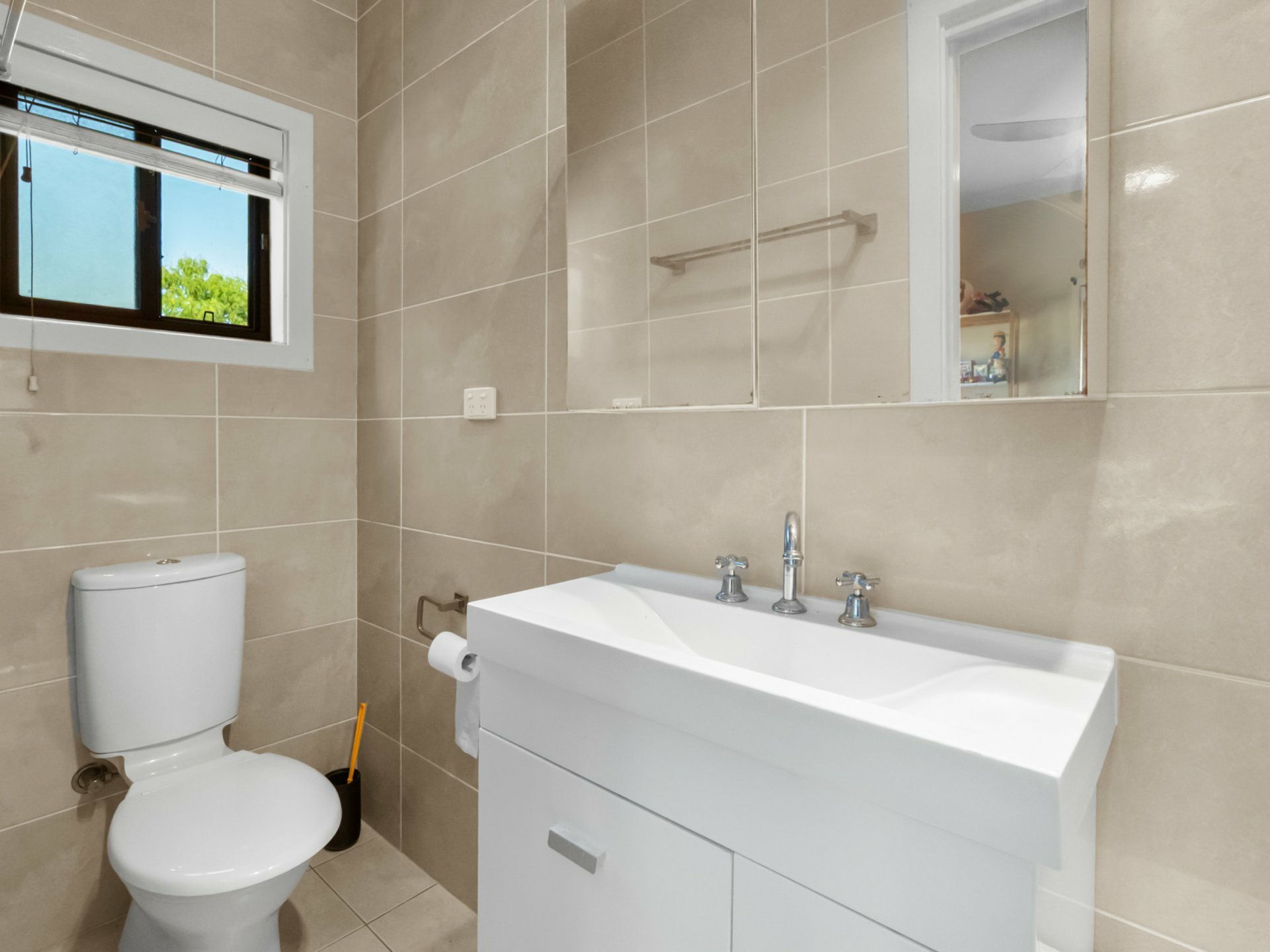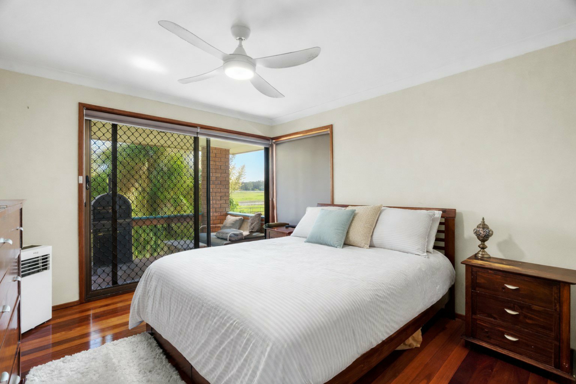 All bedrooms include ceiling fans, with four featuring built-in storage. The master suite is privately positioned upstairs, complete with its own ensuite bathroom and private balcony. Two of the bedrooms are located on the lower level, one equipped with air conditioning and another featuring a fully renovated ensuite, offering added flexibility for guests or extended family. The main bathroom services the upper level and is generous in size, presented in original condition with scope to update over time if desired.