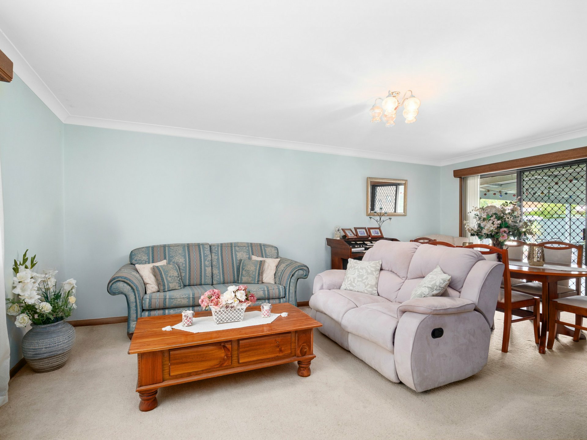 - The home features multiple living spaces, including a formal lounge and dining room with carpet and sliding door access to the outdoor entertaining area