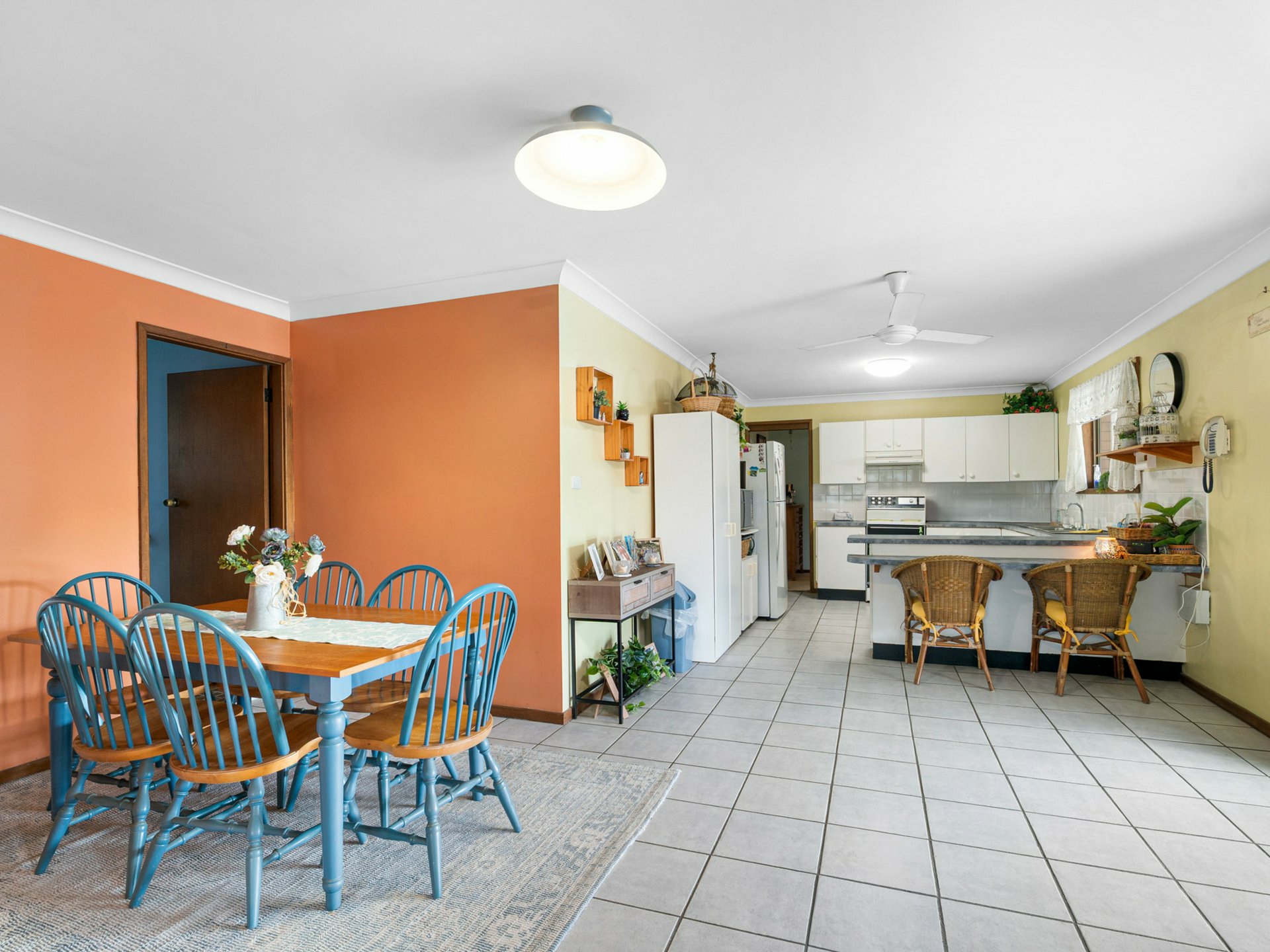 - Flowing from the kitchen and dining area is the second living space, complete with carpet, air conditioning, and a cosy wood fire for Winter