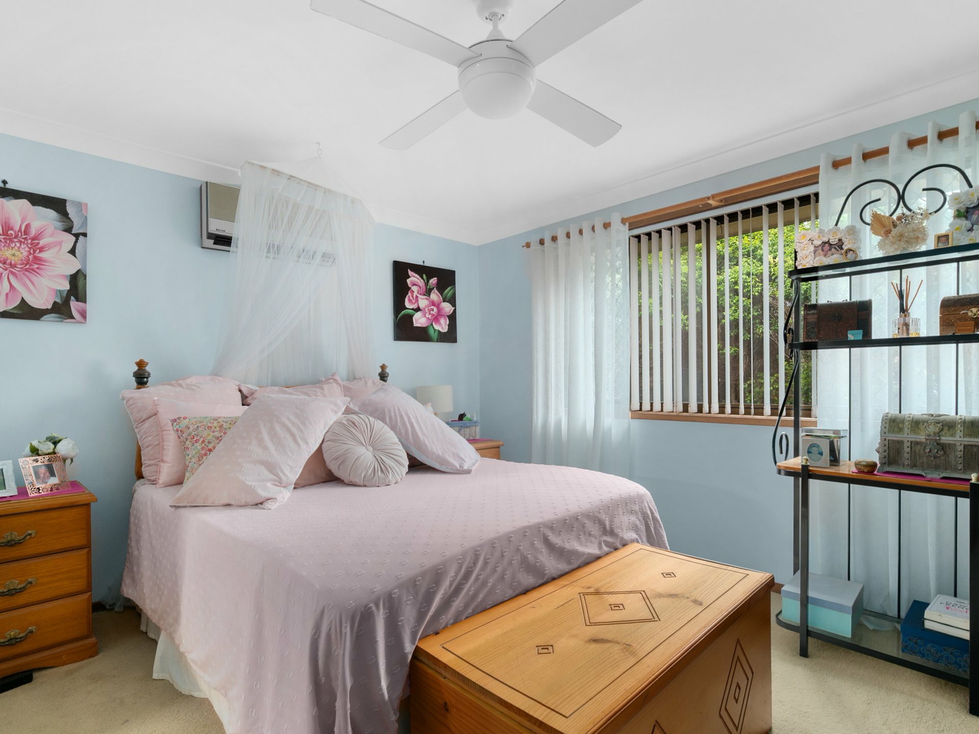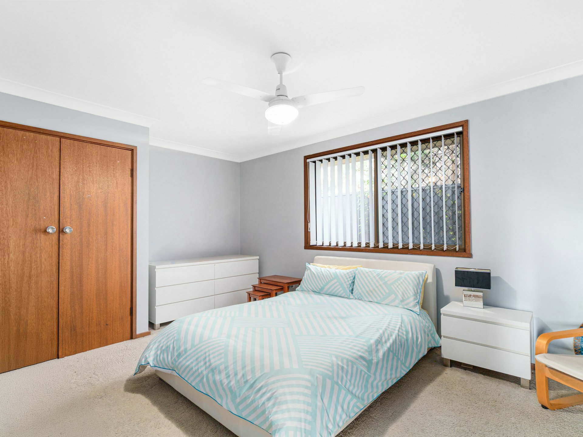 - Four bedrooms with built-in storage and ceiling fans