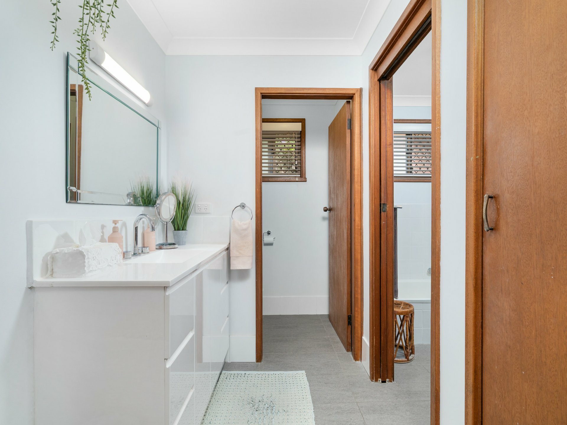 - The three-way main bathroom has been updated in neutral tones and features a bathtub, walk-in shower, vanity and a separate toilet