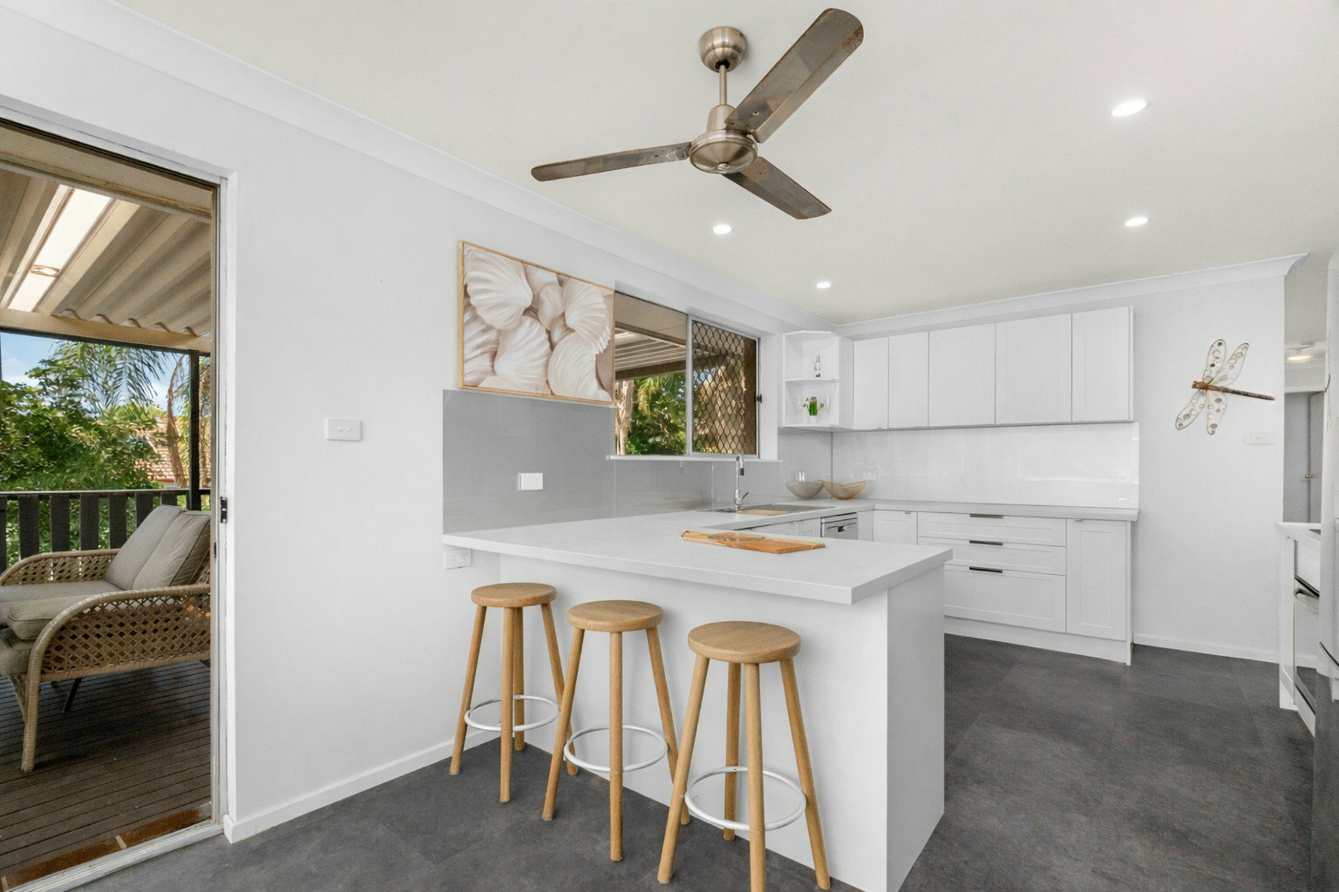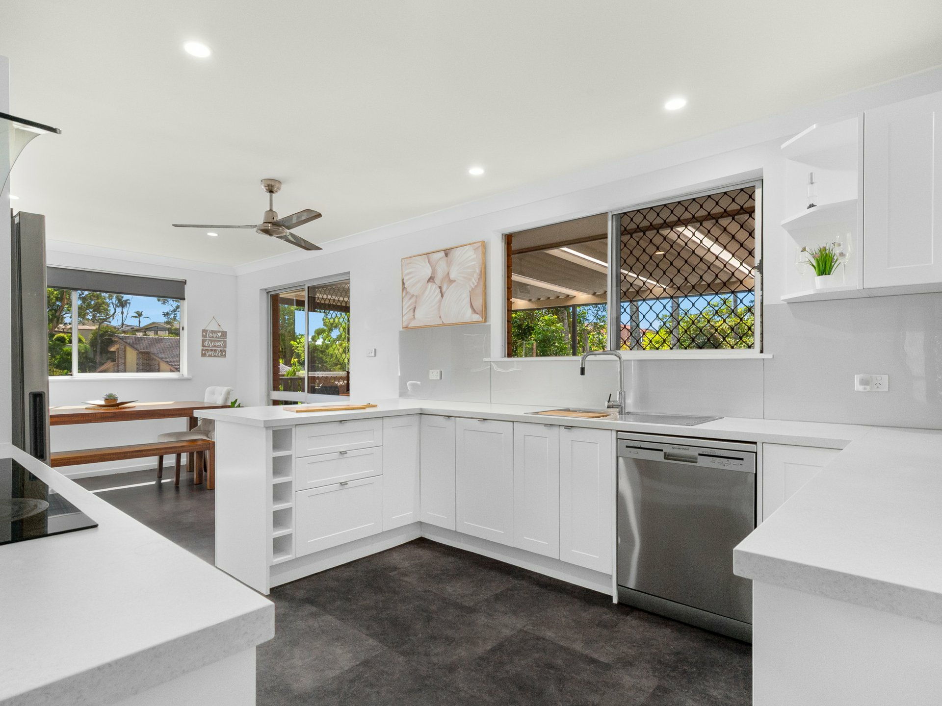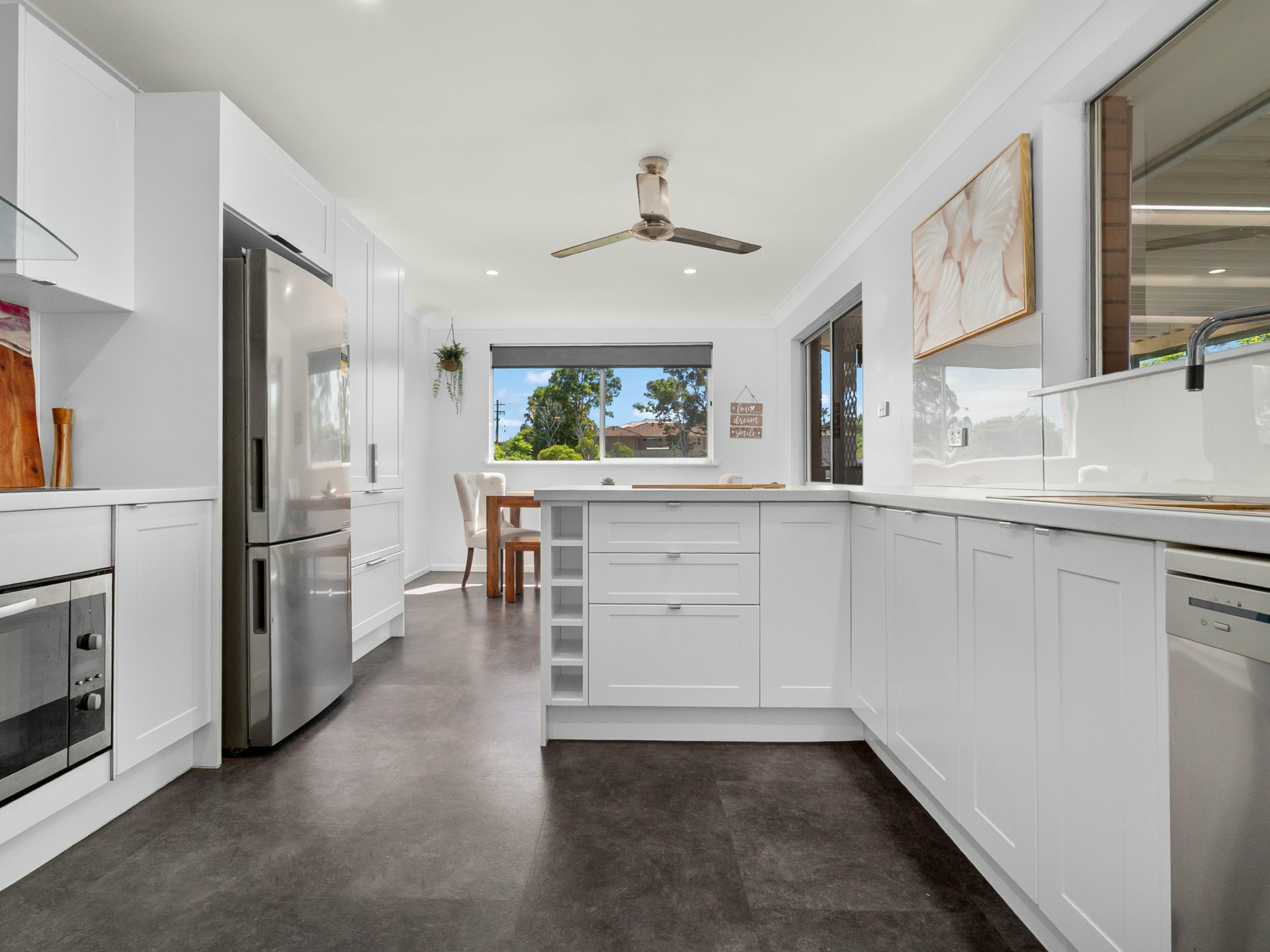 The stunning new kitchen is well-appointed with stainless steel appliances, including a dishwasher, and showcases a stylish grey and white neutral palette that enhances its fresh, modern feel. Thoughtfully designed for both functionality and everyday use, it offers ample bench space along with a breakfast bar, making it ideal for casual meals, family living, and entertaining alike.