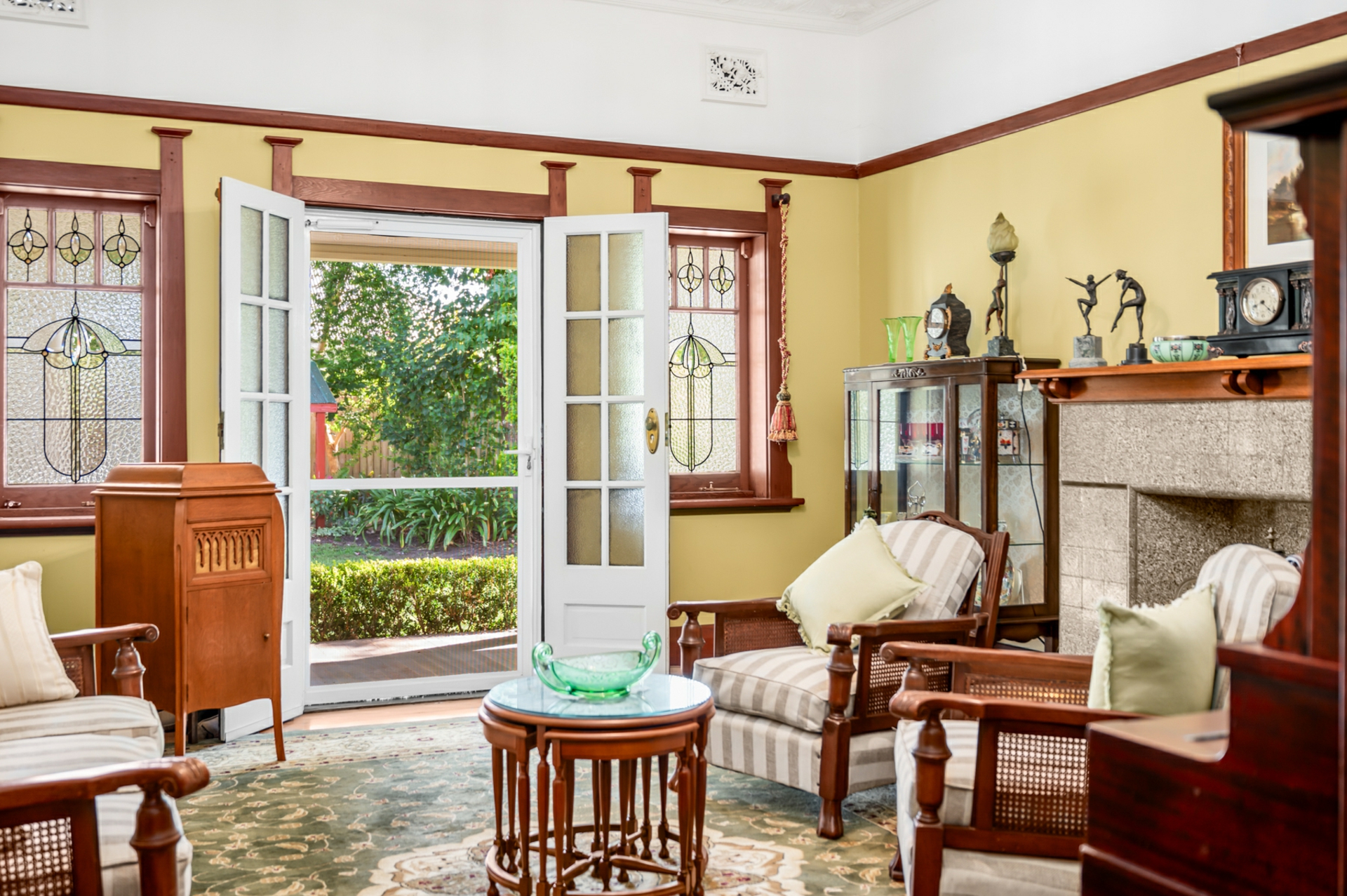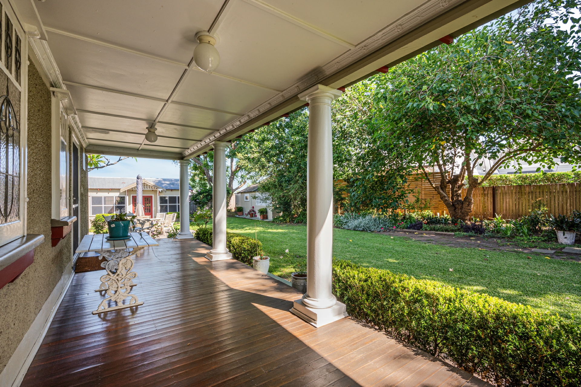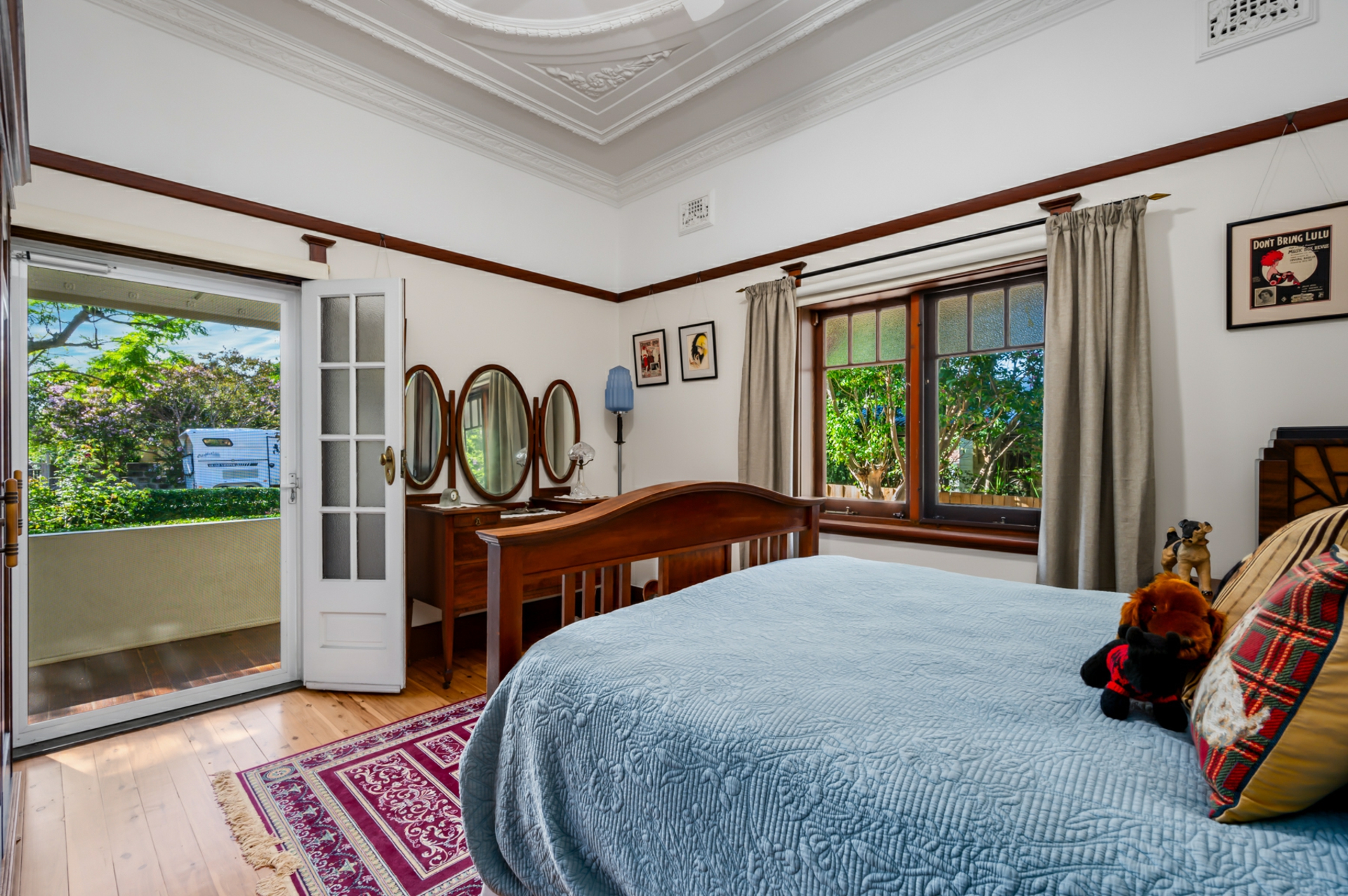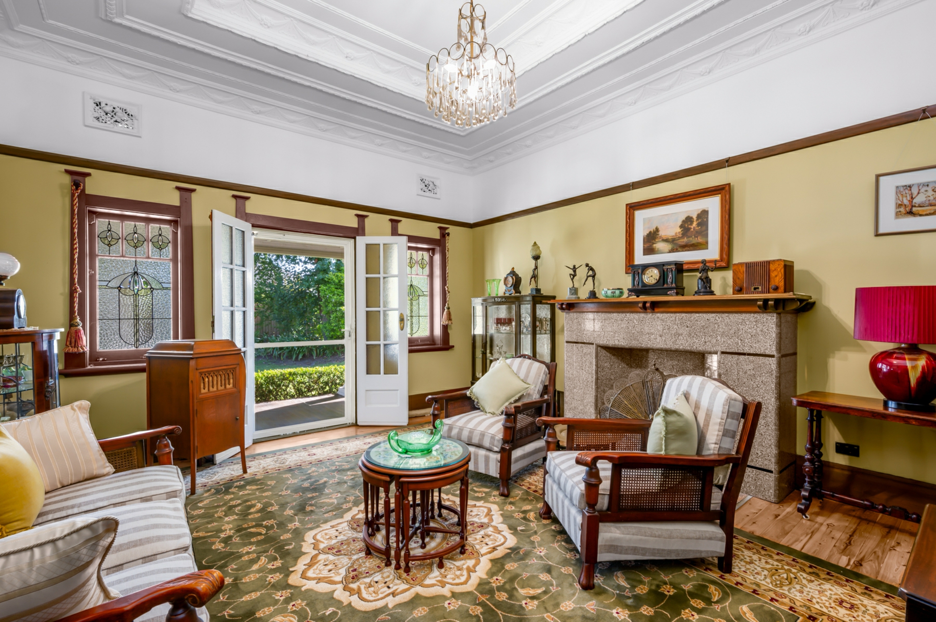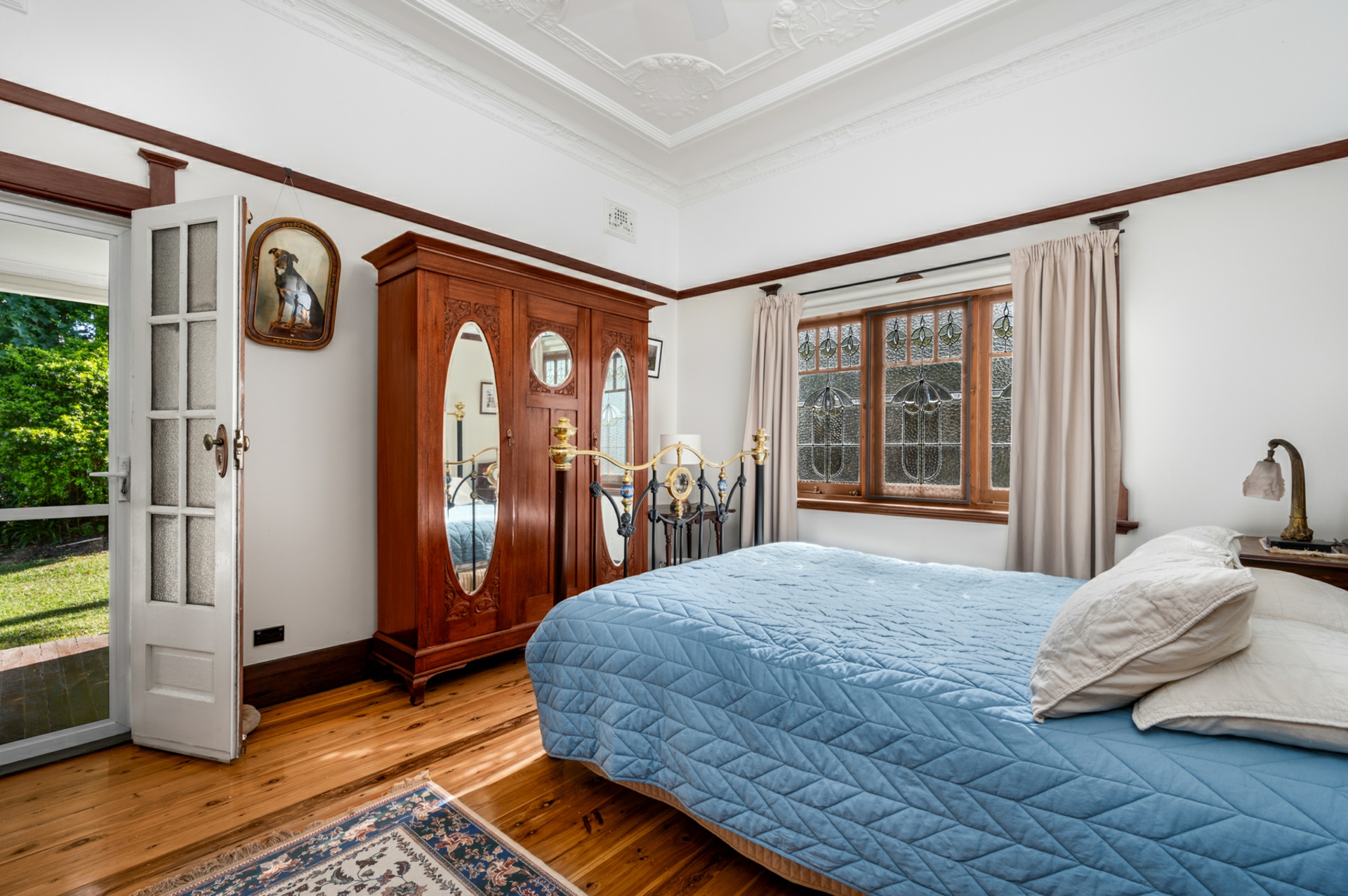 Inside, period features abound, including soaring ornate ceilings, polished timber floors, picture rails, and stunning leadlight windows that frame the home's generous proportions. The thoughtfully designed floorplan offers three well-sized bedrooms within the home, with the master bedroom featuring French door access to the lush backyard & wraparound verandah. The formal lounge exudes grandeur with a coffered ceiling to simply die for. The marble hearth and French doors also open to the side verandah exploding onto the grassy manicured yard and gardens, while each of our front bedrooms also enjoy direct access to the undercover areas.