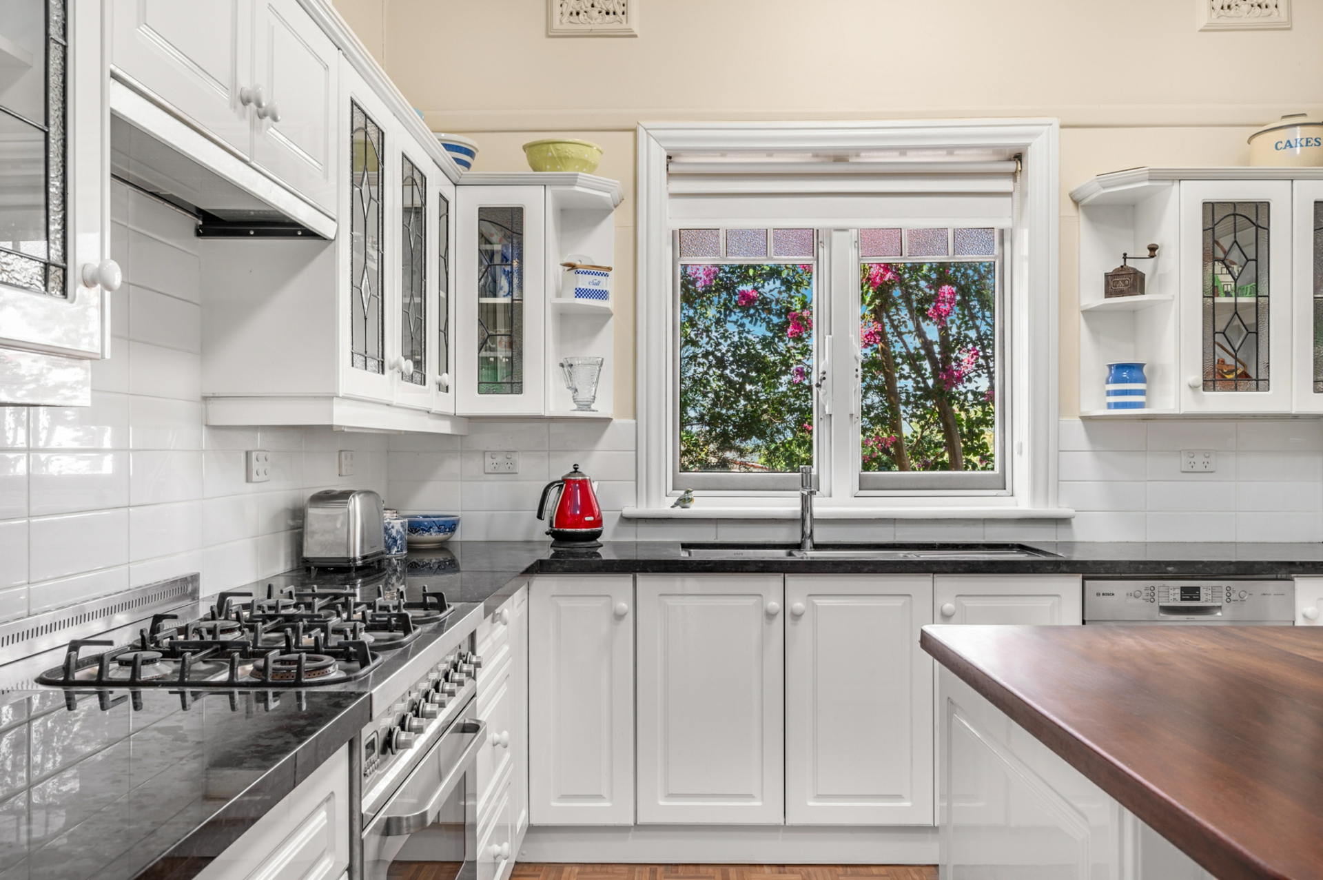 The kitchen completes this perfect picture, with custom hanging cabinetry, thick granite benchtops, along with a butchers block style island prep bench that can double as a breakfast bar for casual quick meals. The wood stove within this space is a welcome sight, and the formal dining area backs onto the kitchen for an ease of entertaining or sit down dining.