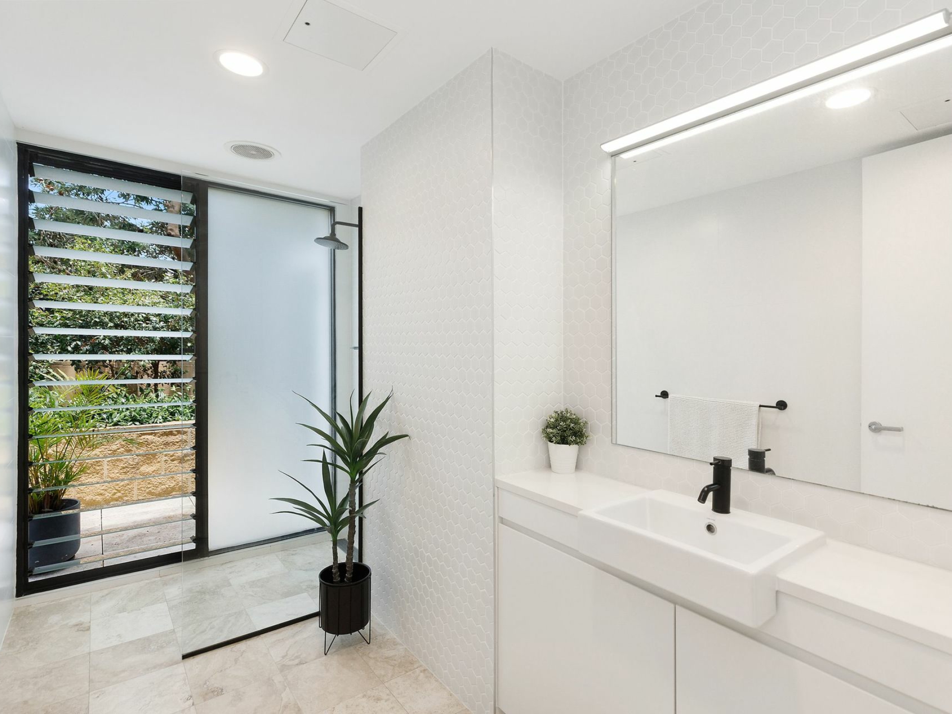- Elegant bathroom with stunning tiles, floor to ceiling frosted glass, louvered window and large waterfall shower makes for a spa like experience