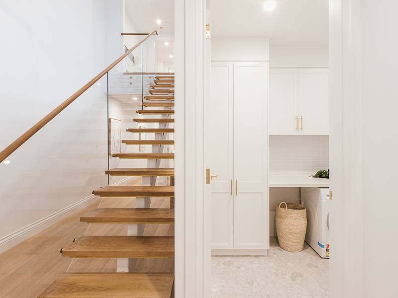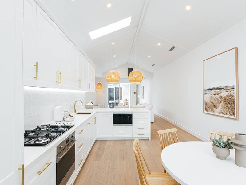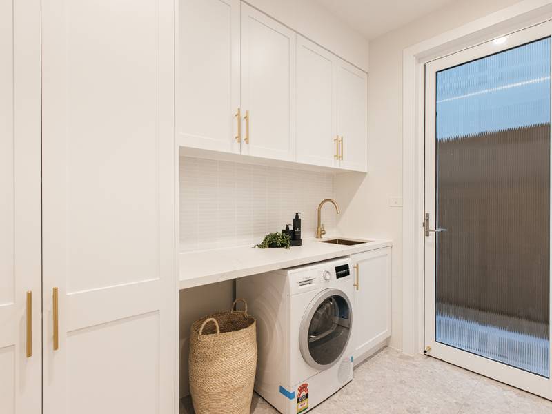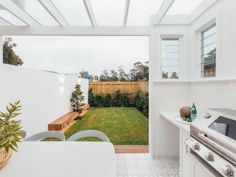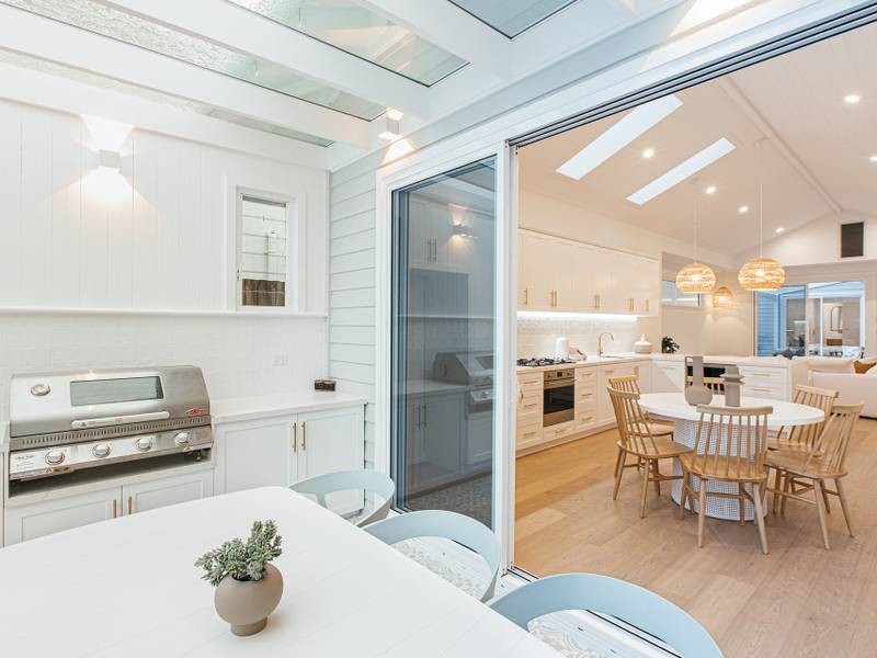 - Striking shaker style kitchen equipped with beautiful brass features, gas cooking, integrated dishwasher and stainless steel smeg appliances effortlessly flowing out to covered entertaining area with built-in BBQ and bar fridge, level grassed yard and low maintenance gardens