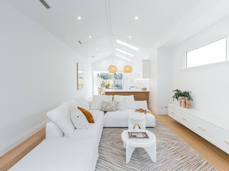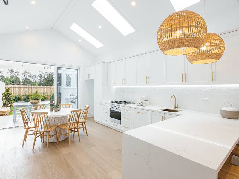 - Open plan concept with living, dining and kitchen framed by soaring ceilings and skylights