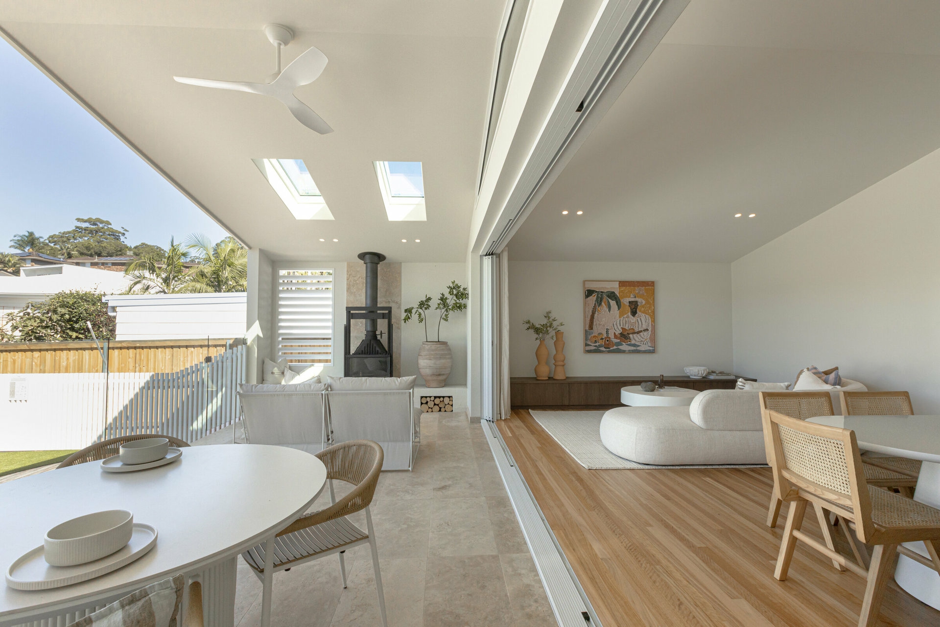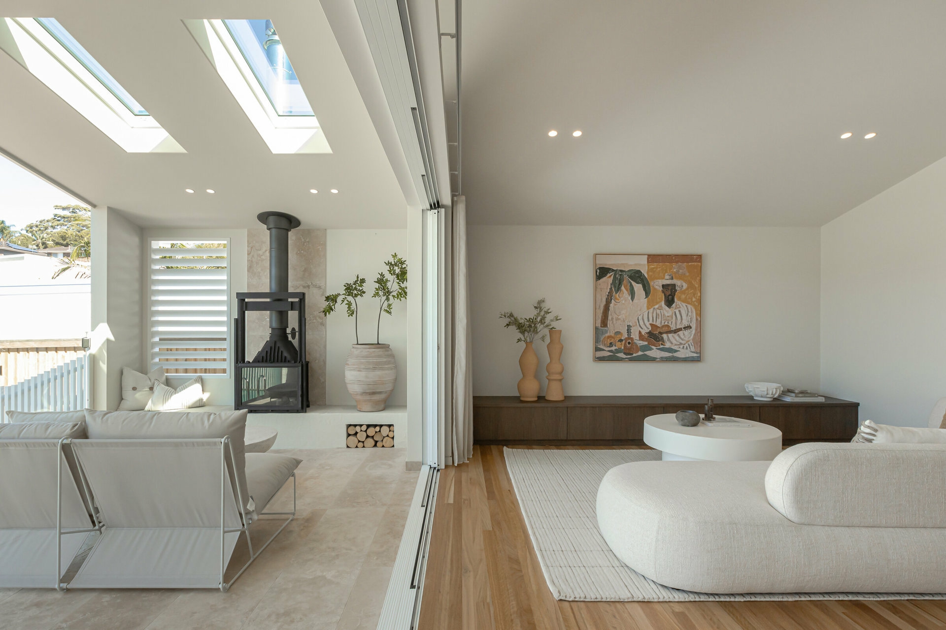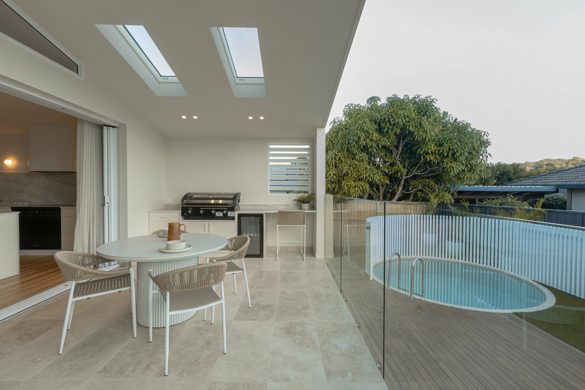 At the heart of the home, the light-filled open plan kitchen, living and dining zone connects effortlessly to the outdoor entertaining area and plunge pool - designed for both relaxed family living and effortless entertaining. The kitchen anchors the space with premium finishes and thoughtful detailing, while large cavity sliding doors and skylights enhance natural light and flow.