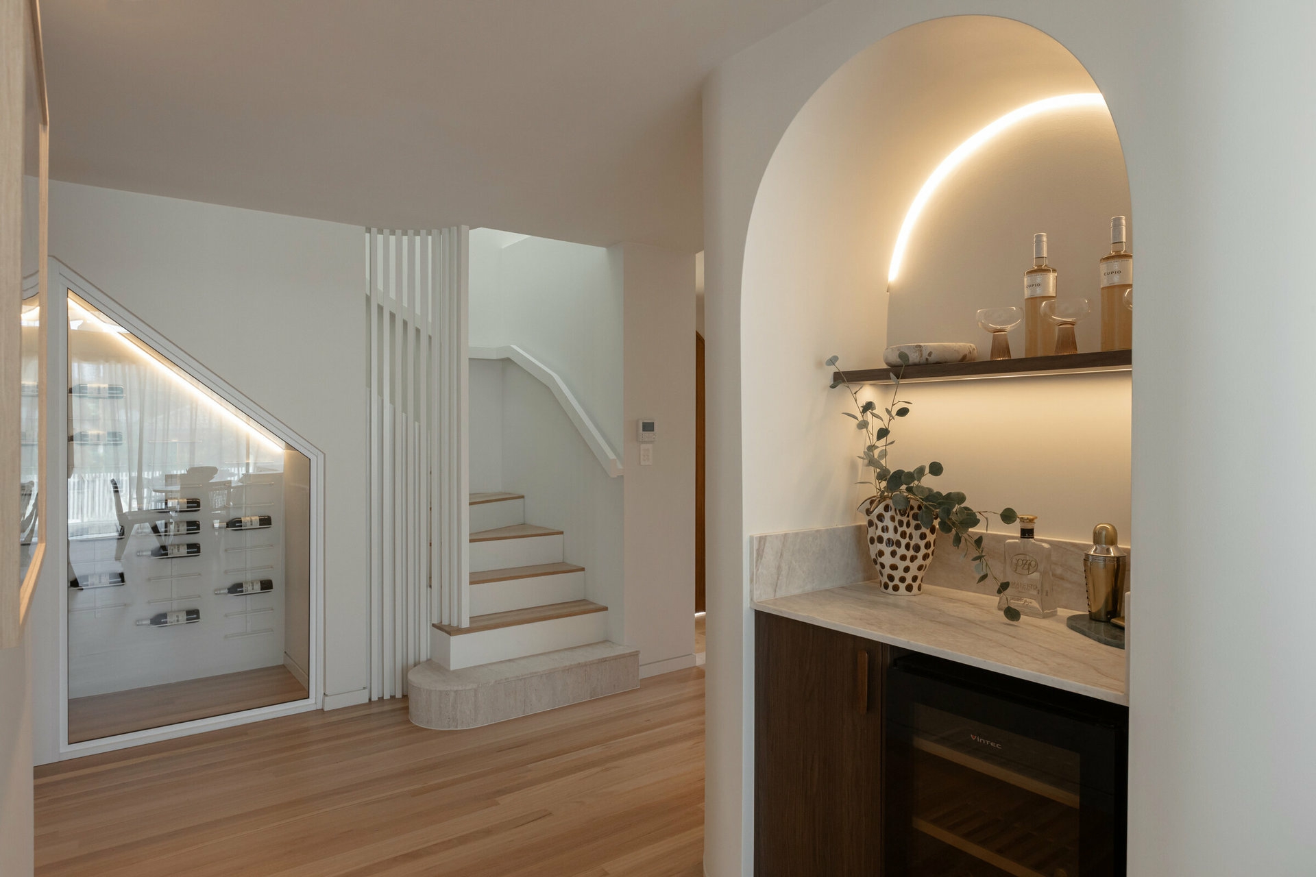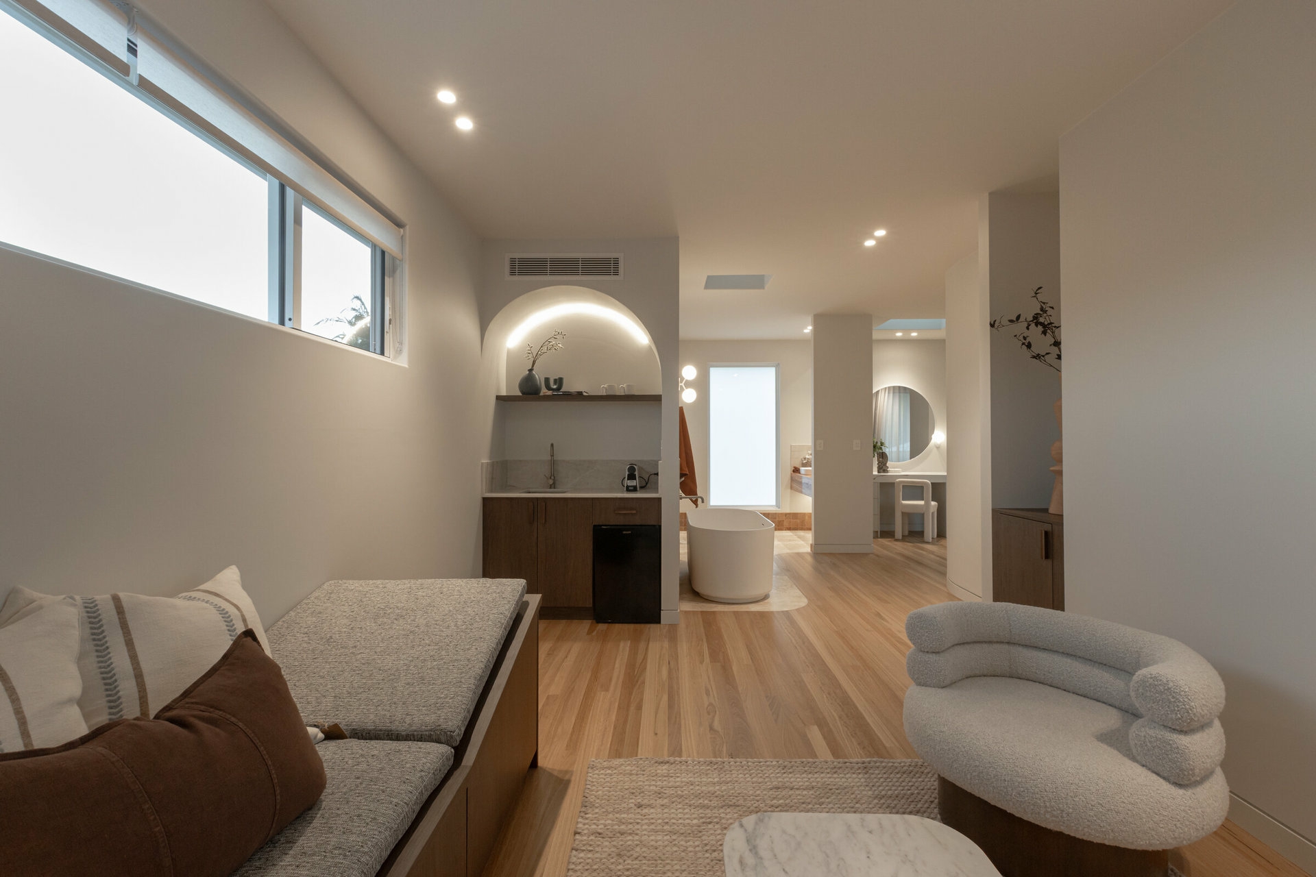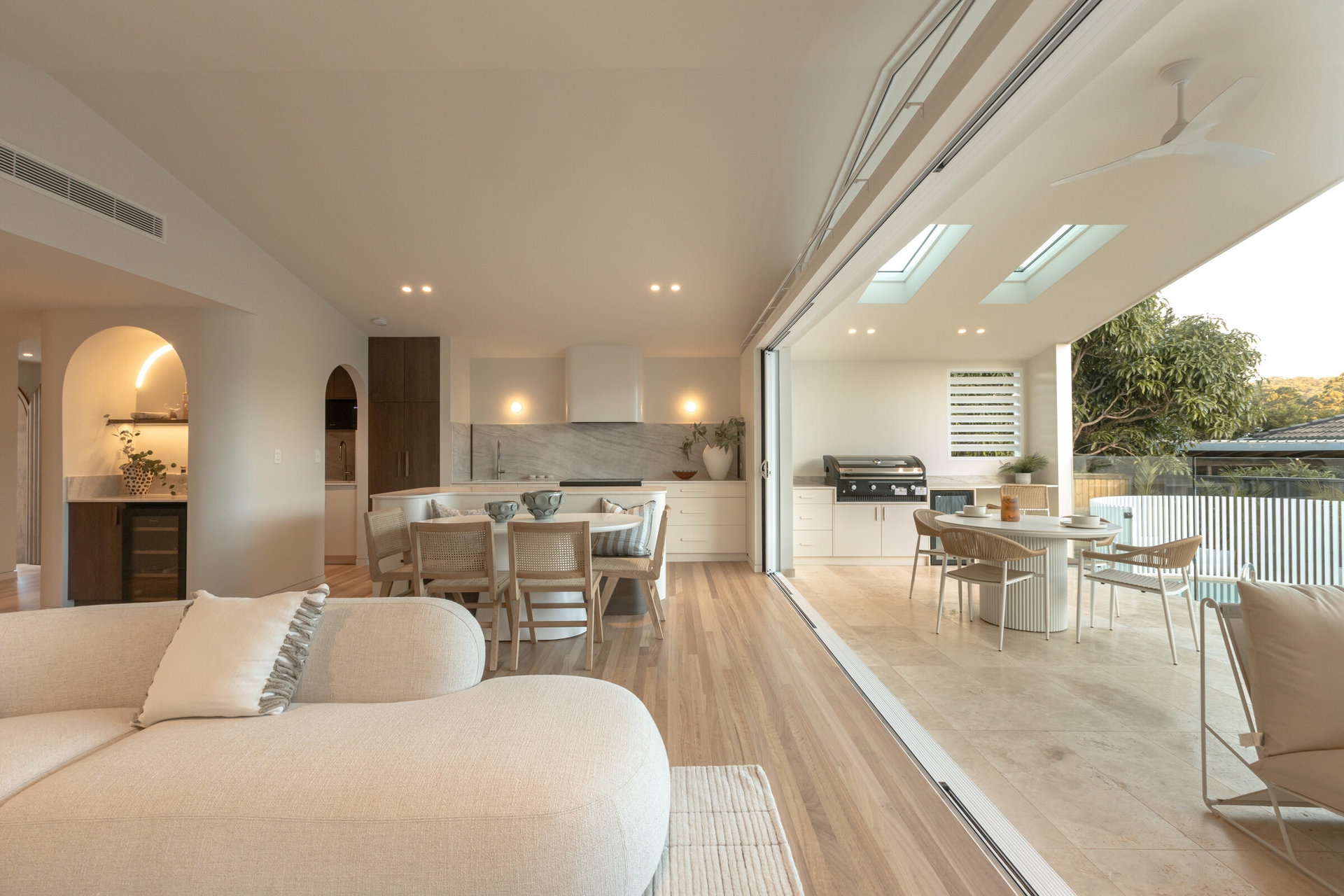 From the striking arched timber front door to the solid Blackbutt flooring and natural stone used throughout, every detail has been expertly curated to create a cohesive and contemporary home with an on-trend yet timeless aesthetic.