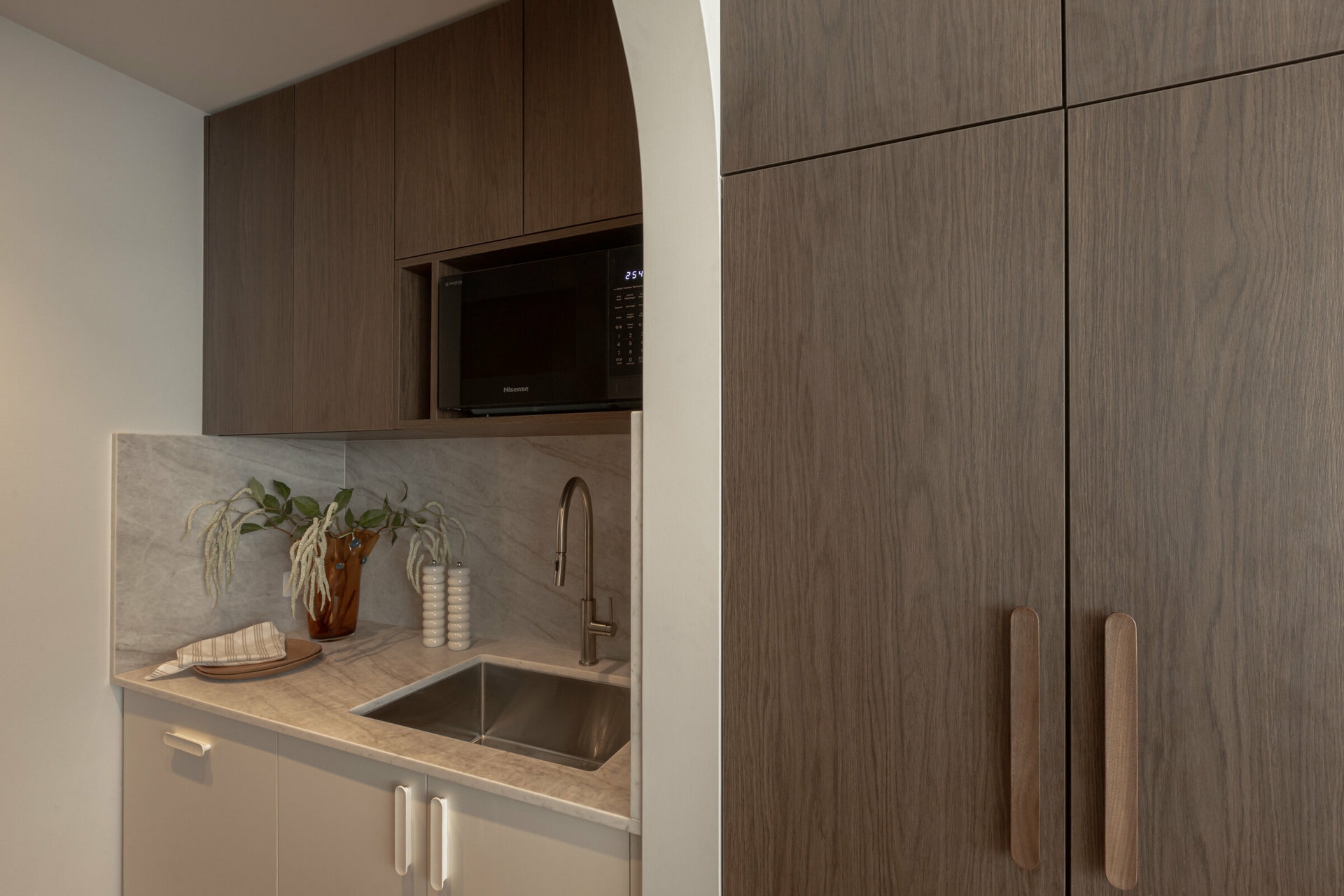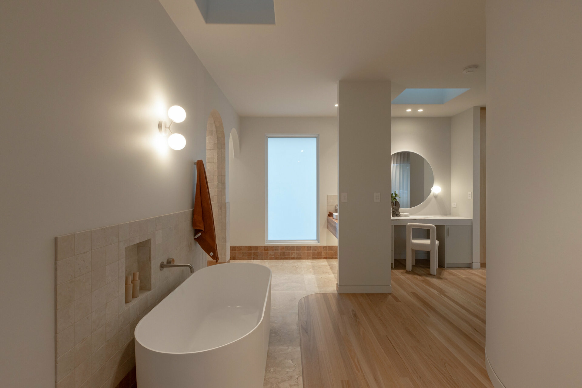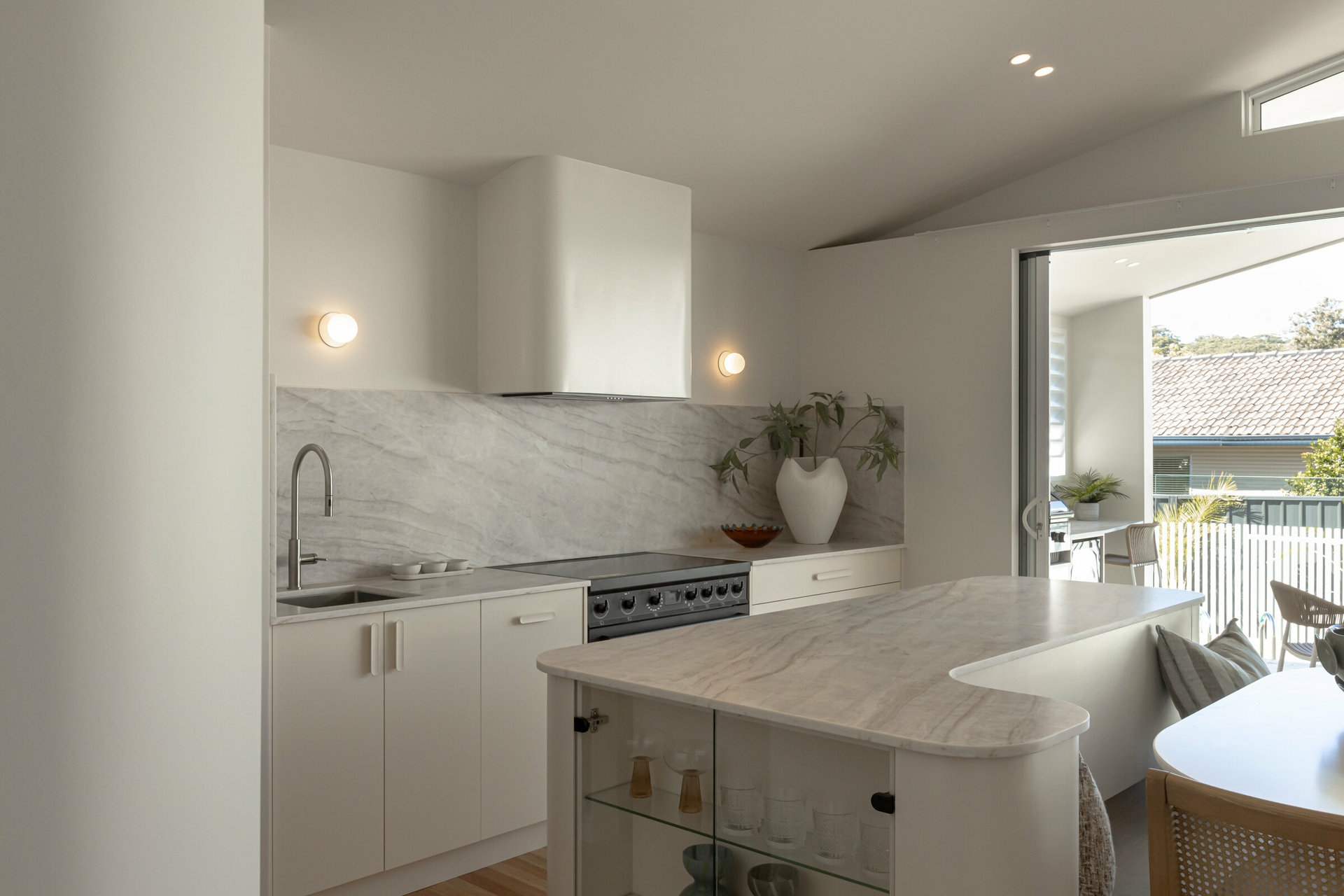 From the striking arched timber front door to the solid Blackbutt flooring and natural stone used throughout, every detail has been expertly curated to create a cohesive and contemporary home with an on-trend yet timeless aesthetic.