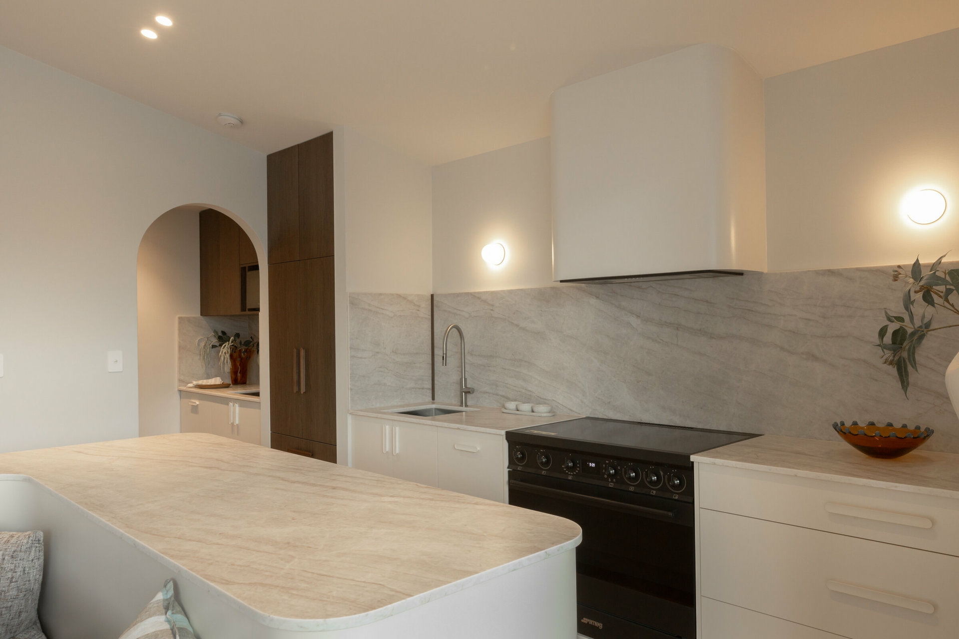- Custom-designed kitchen with Taj Mahal quartzite stone benchtops, freestanding SMEG oven, integrated appliances and butler's pantry