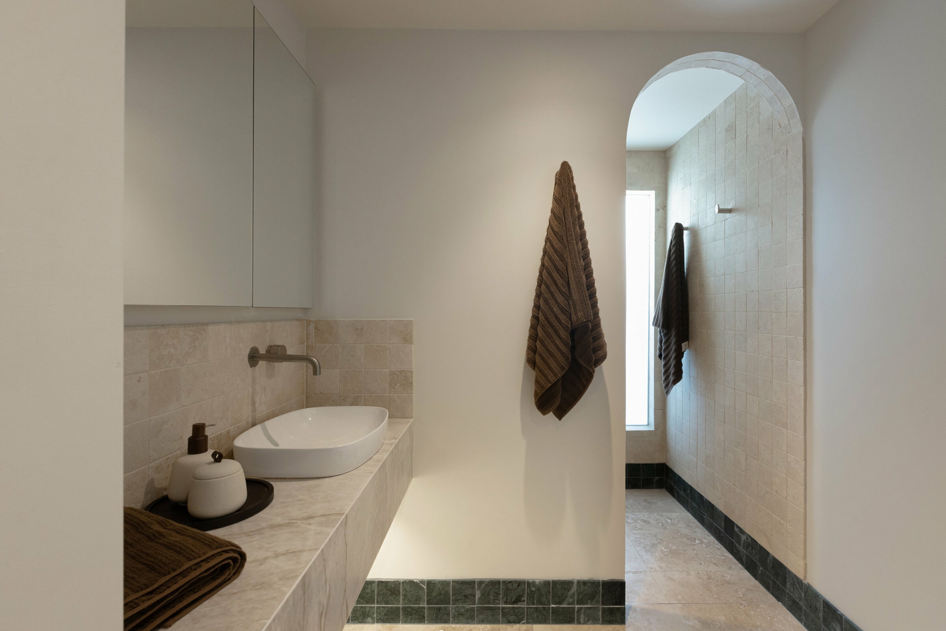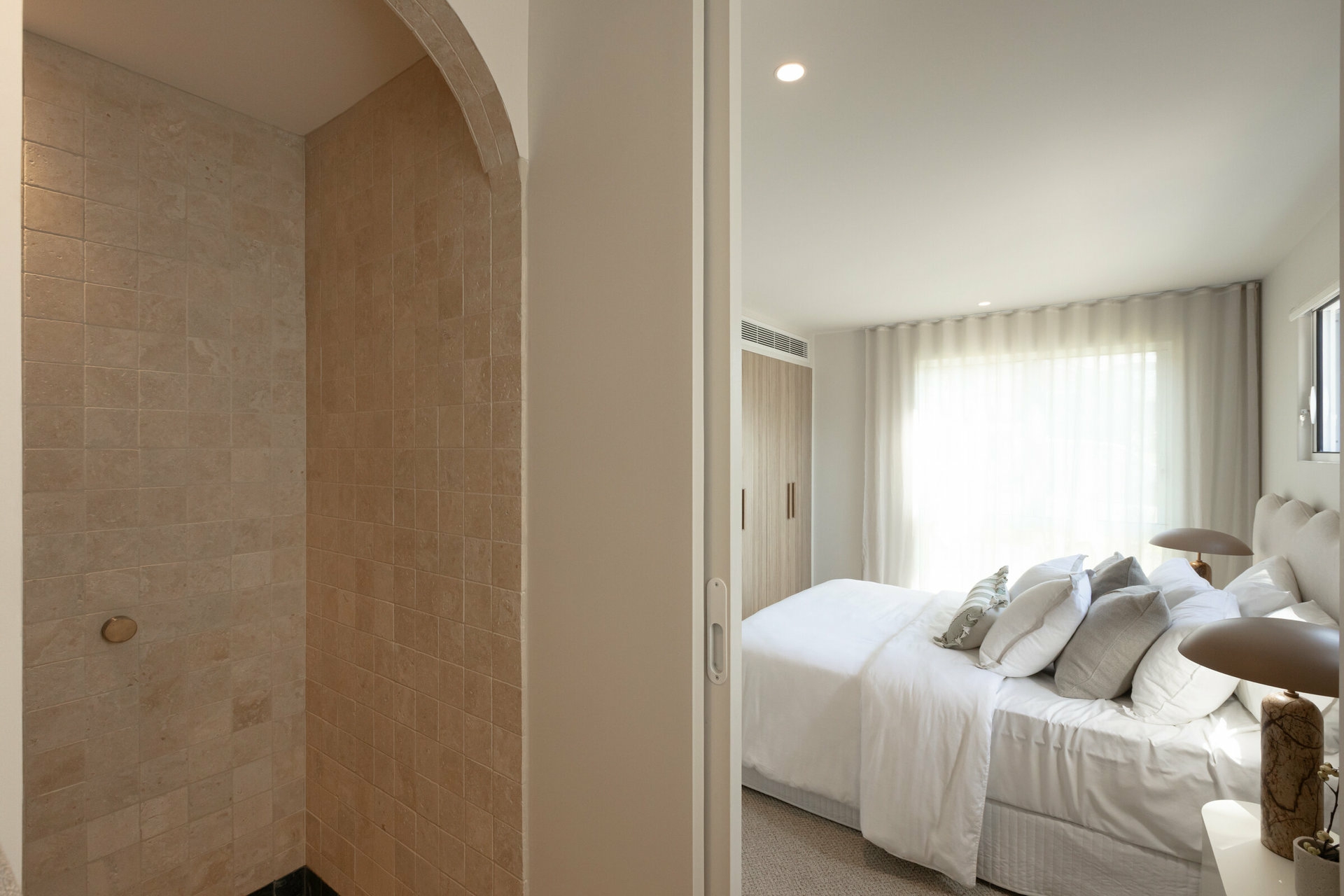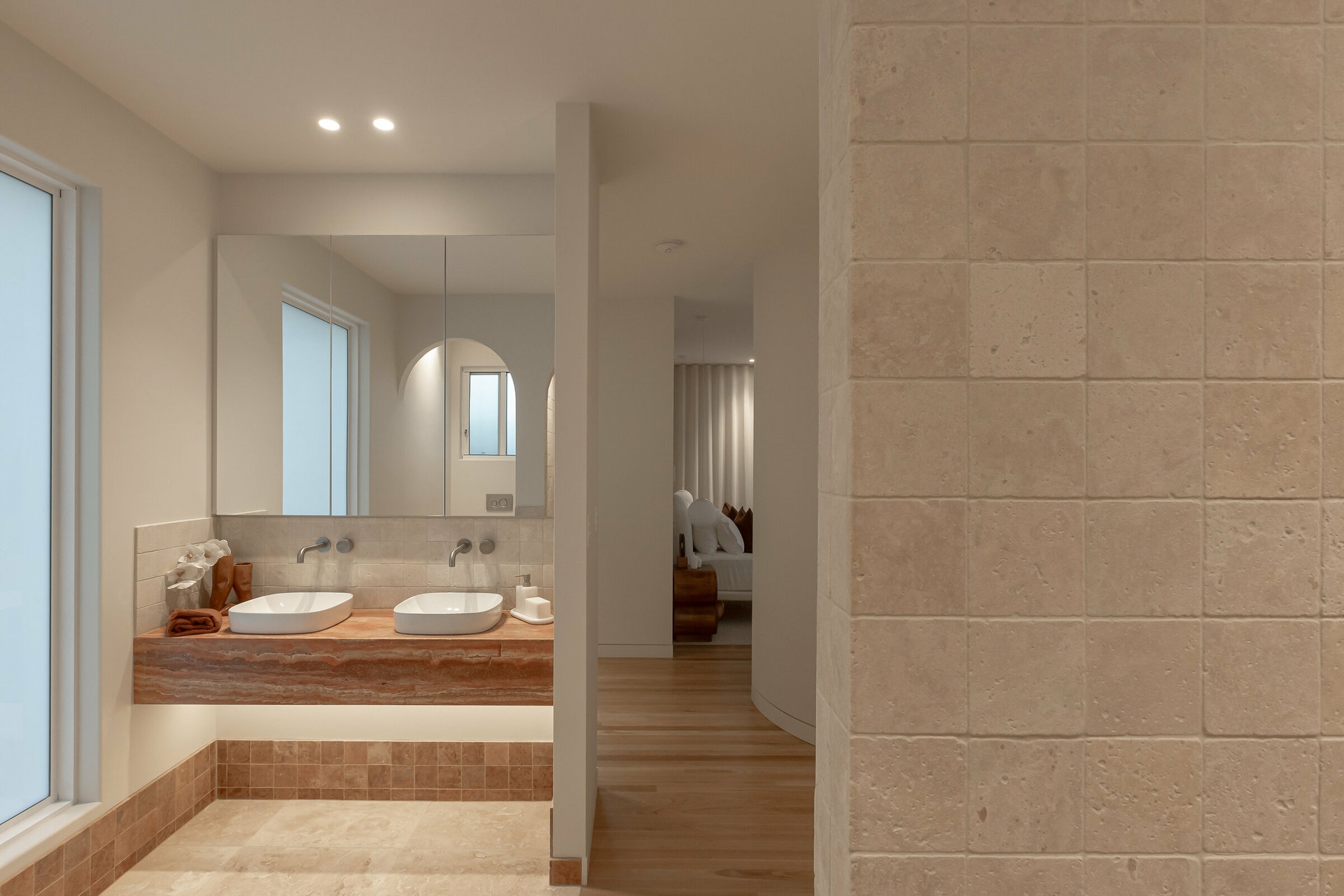 - 3 Mediterranean-inspired bathrooms, all featuring three times sealed natural travertine, statement stone vanities, brushed nickel tapware and high-quality fixtures