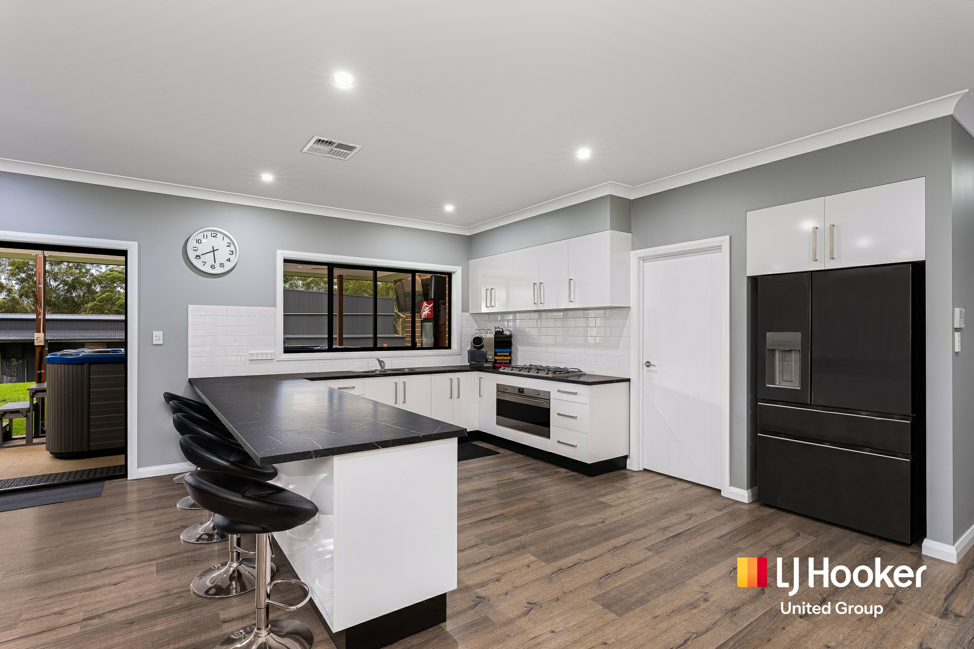 At the heart of the home is a light-filled open plan living zone, where the kitchen, dining and lounge connect seamlessly to create a welcoming space for everyday living and entertaining. Large windows frame tranquil rural views, bringing the beauty of the outdoors inside.