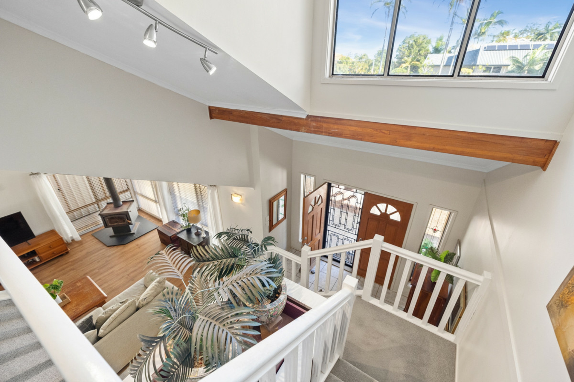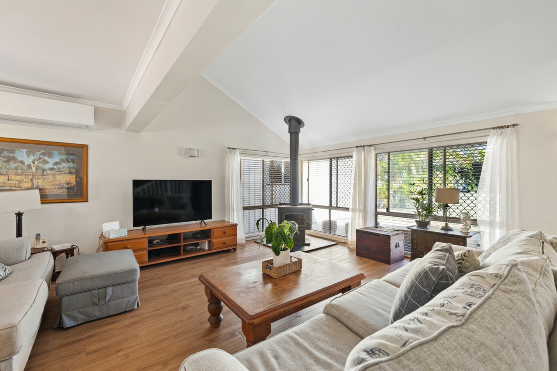 -Light filled living area at the front of the property with wood burner and doors opening to an expansive undercover entertaining area