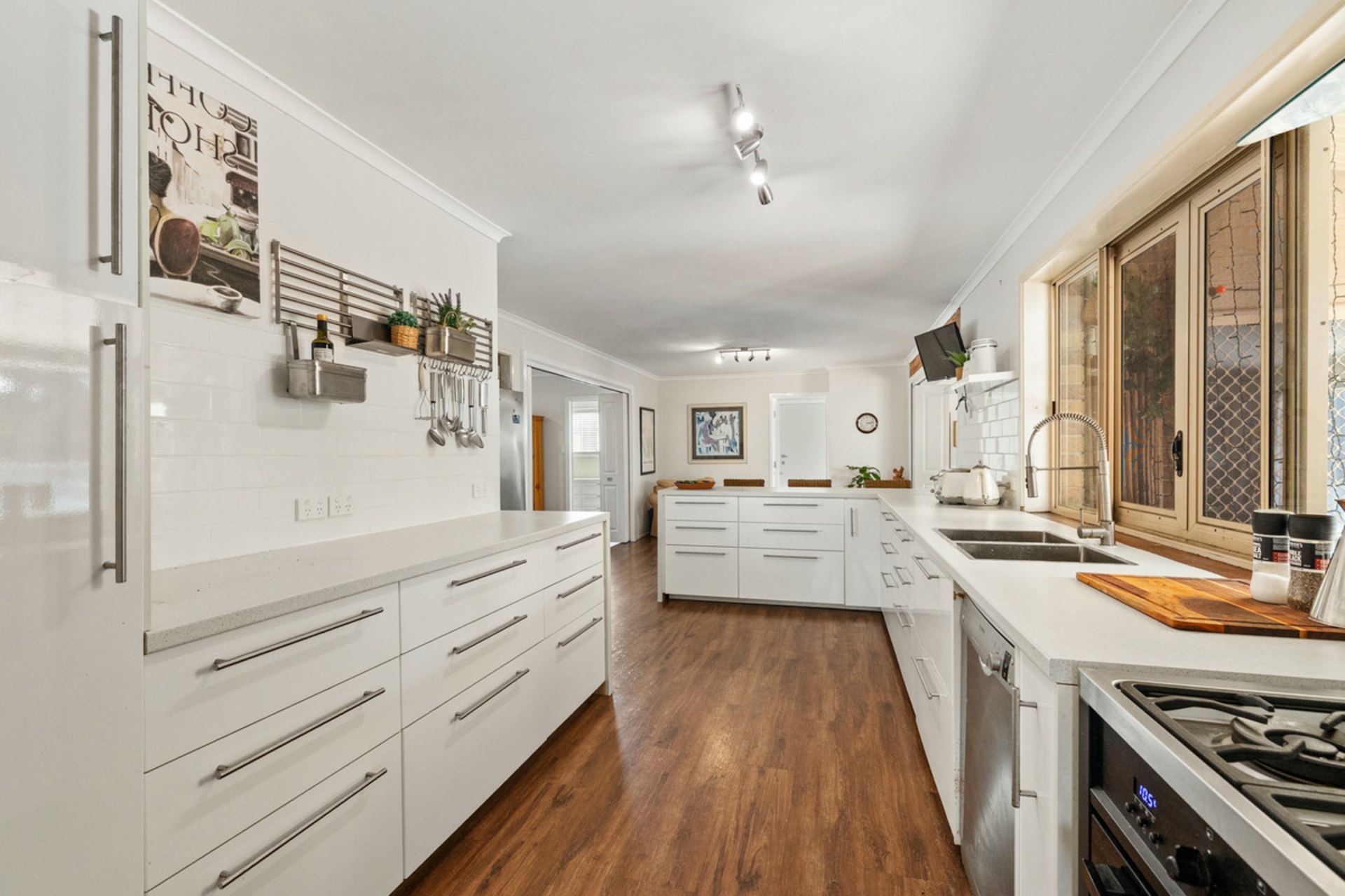 -Open plan kitchen with gas cooktop and electric oven with hood, double sink, dishwasher and breakfast bar