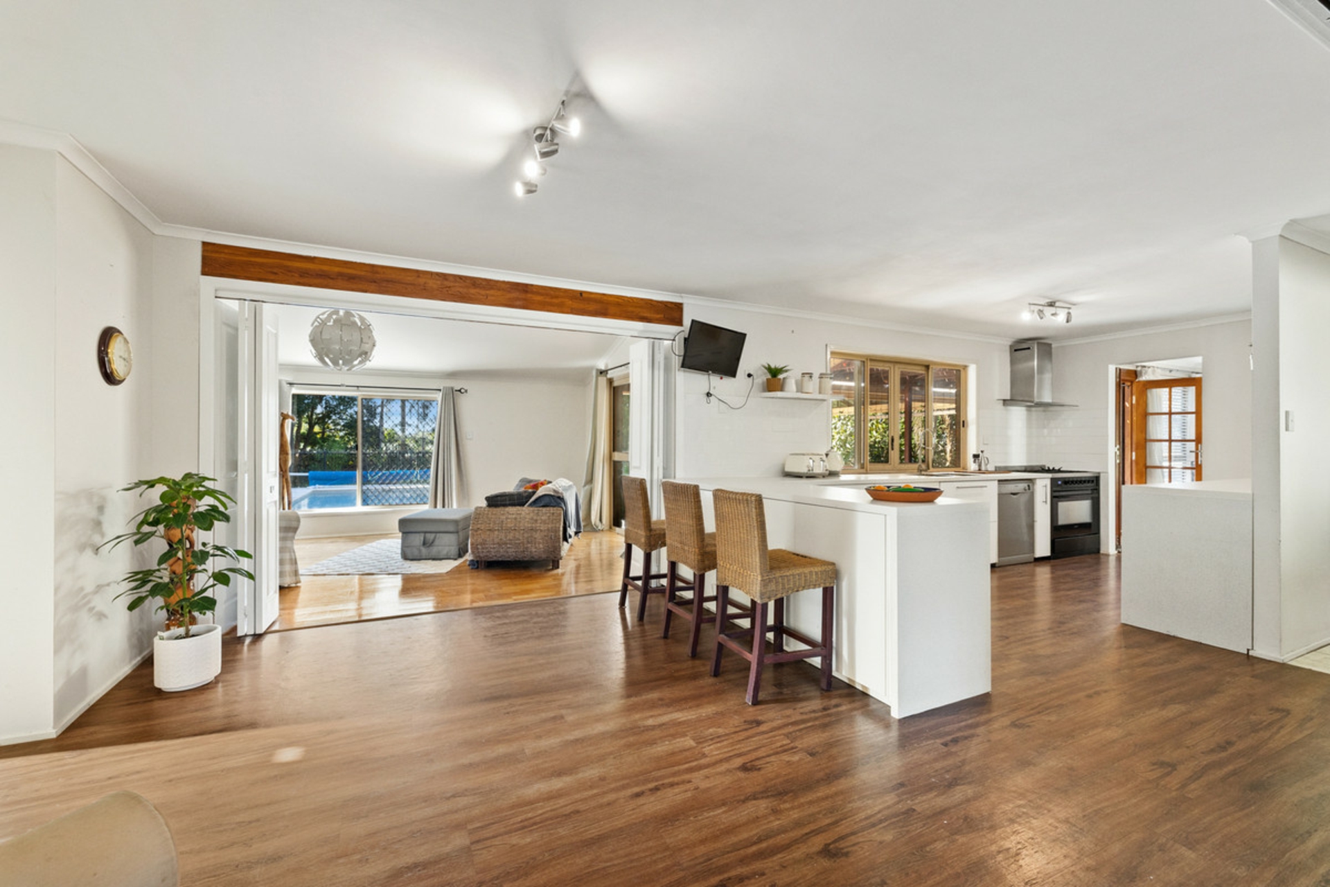This generously proportioned, light and spacious family home with multiple living areas is ideally located in a highly sought after, quiet residential pocket on an elevated, extremely private 1408m2 block. The open plan living with a large kitchen at the heart of the home flows outside to a stunning inground pool and expansive undercover alfresco areas. The master suite opens onto a private deck with water glimpses.