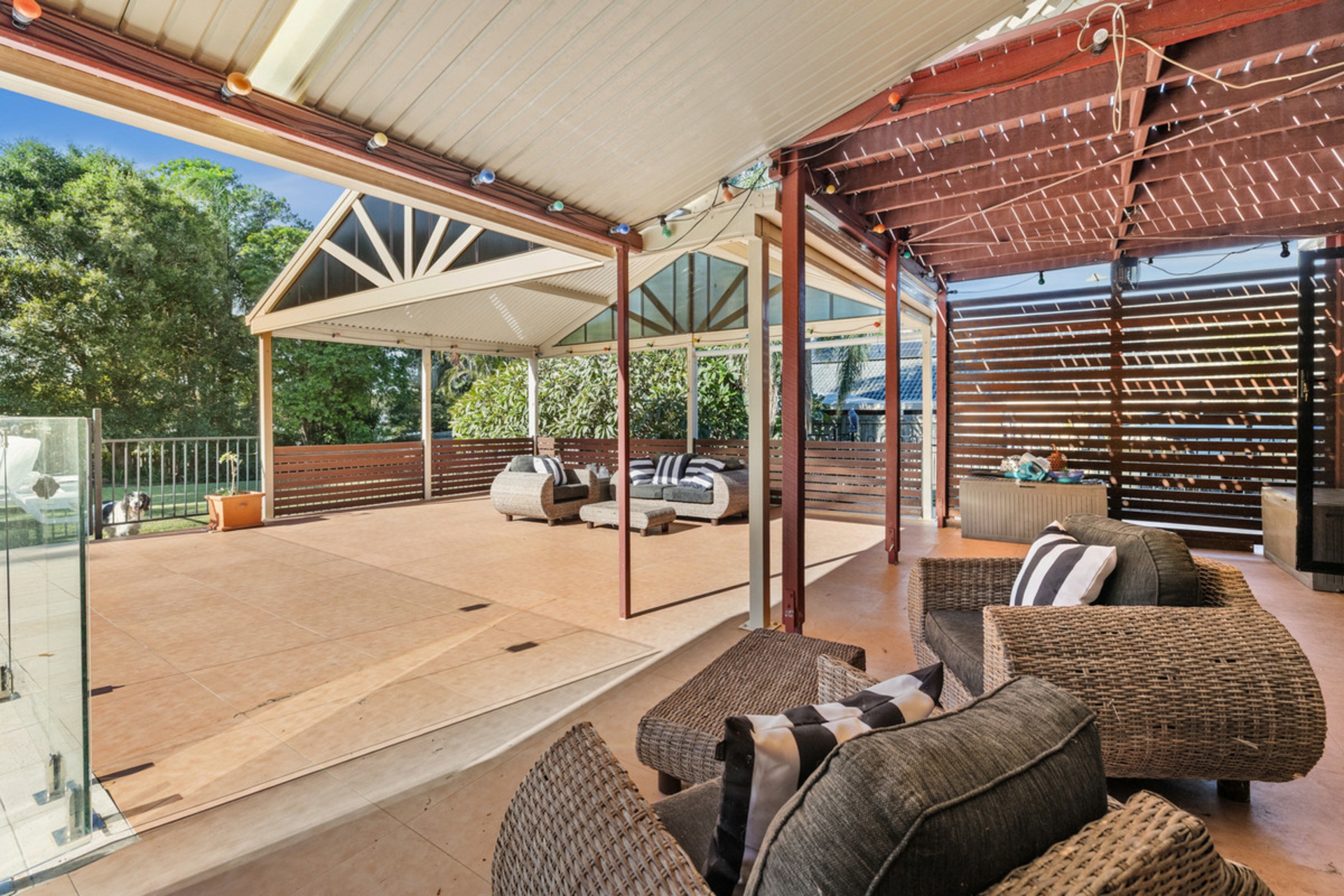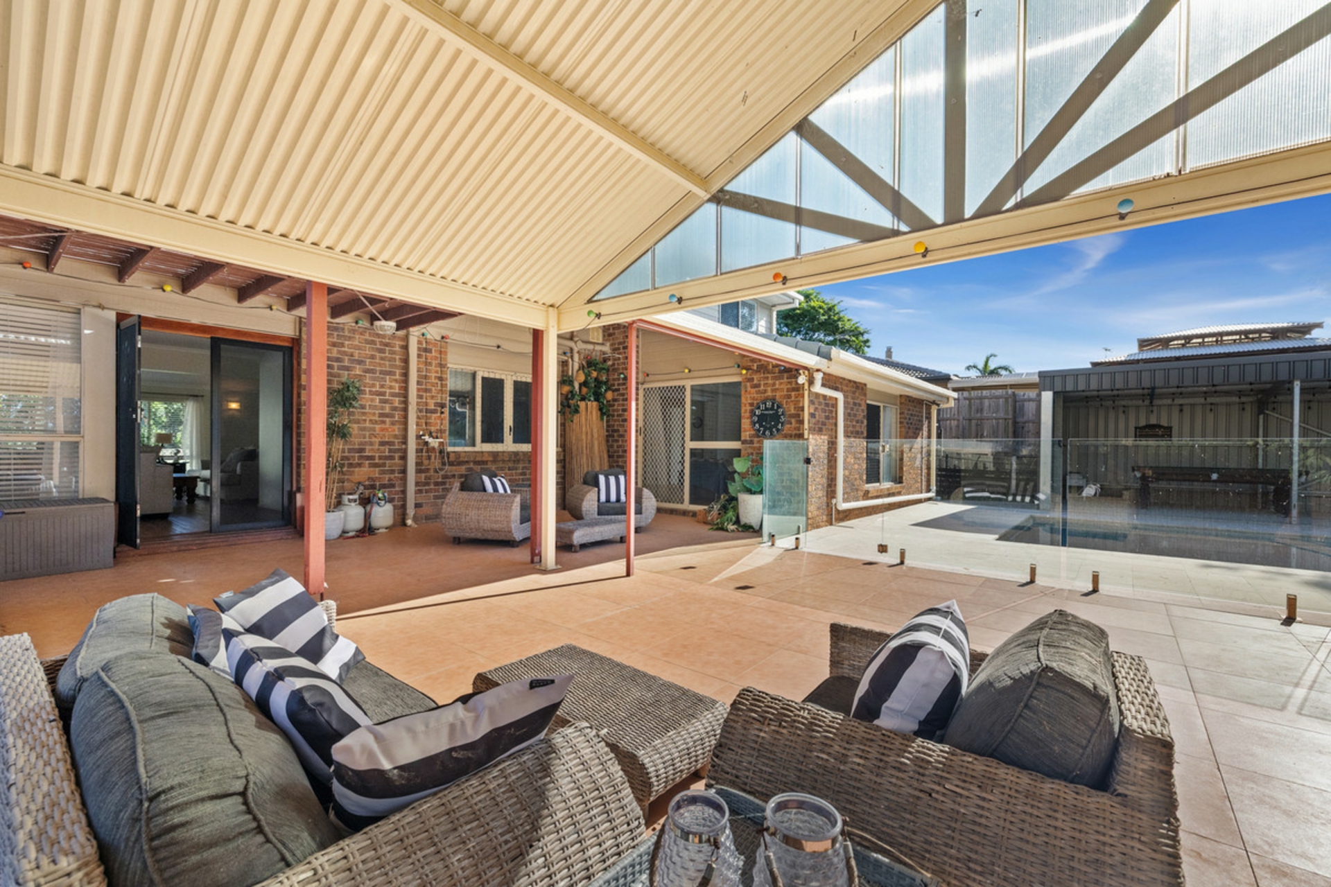 -Large outdoor patio with high ceilings overlooking pool with glass pool fencing.