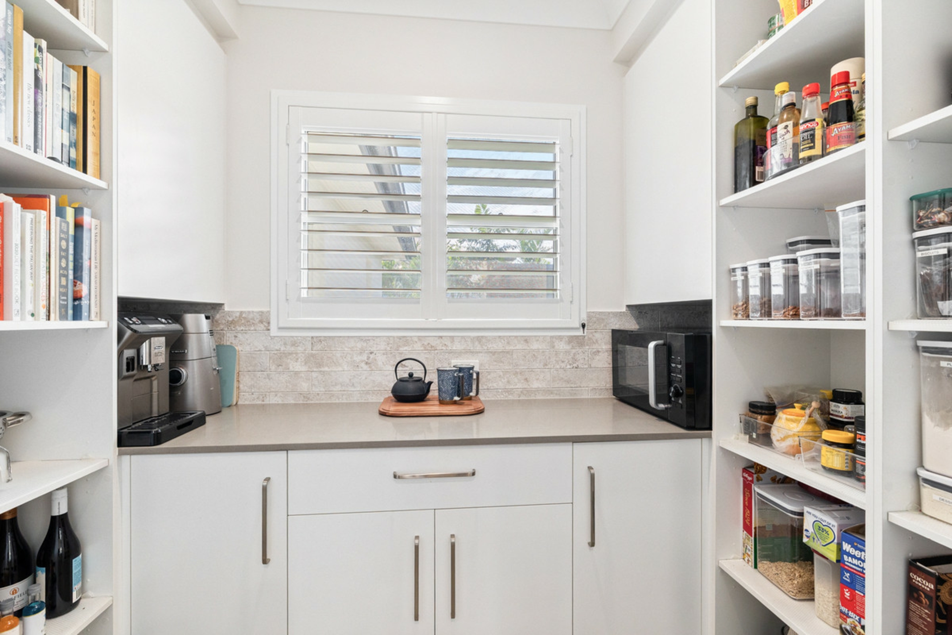 • Gourmet kitchen with stone benchtops, butlers pantry with open shelving and servery window to the alfresco area