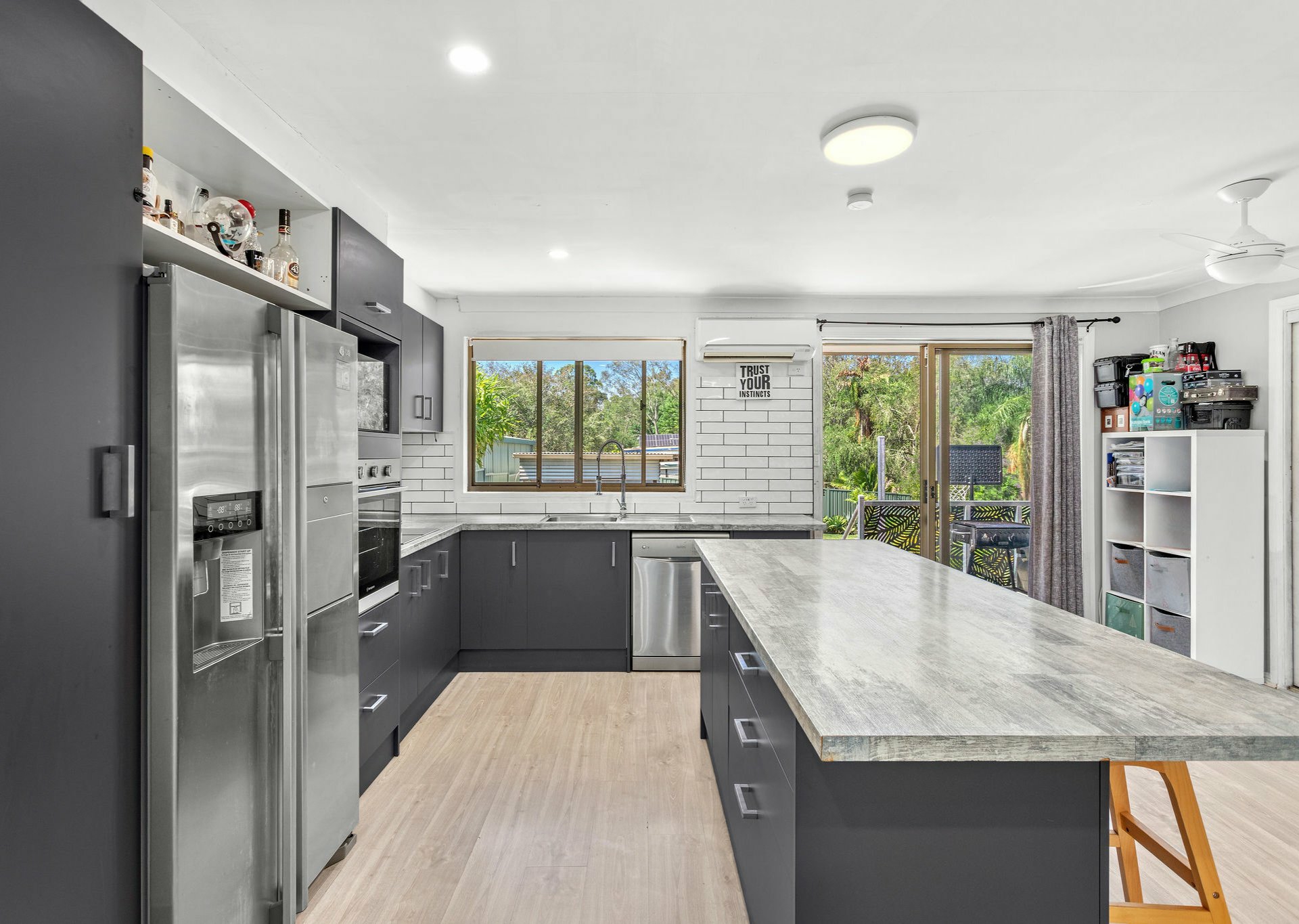 This central living zone is fitted with ceiling fans and air conditioning, ensuring year-round comfort. Adjacent to the kitchen is a conveniently located laundry, continuing the home’s modern aesthetic and complete with a laundry sink. The home is further enhanced by the addition of a new hot water system, offering peace of mind for the new owners.
