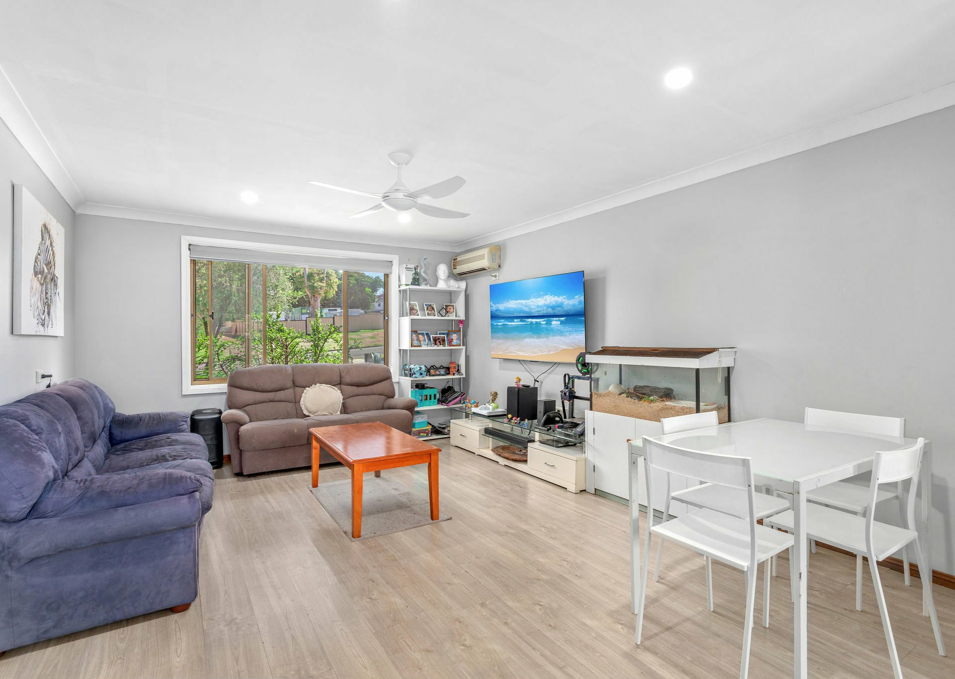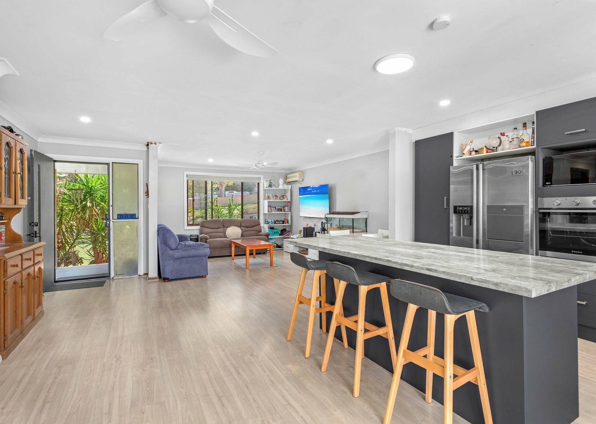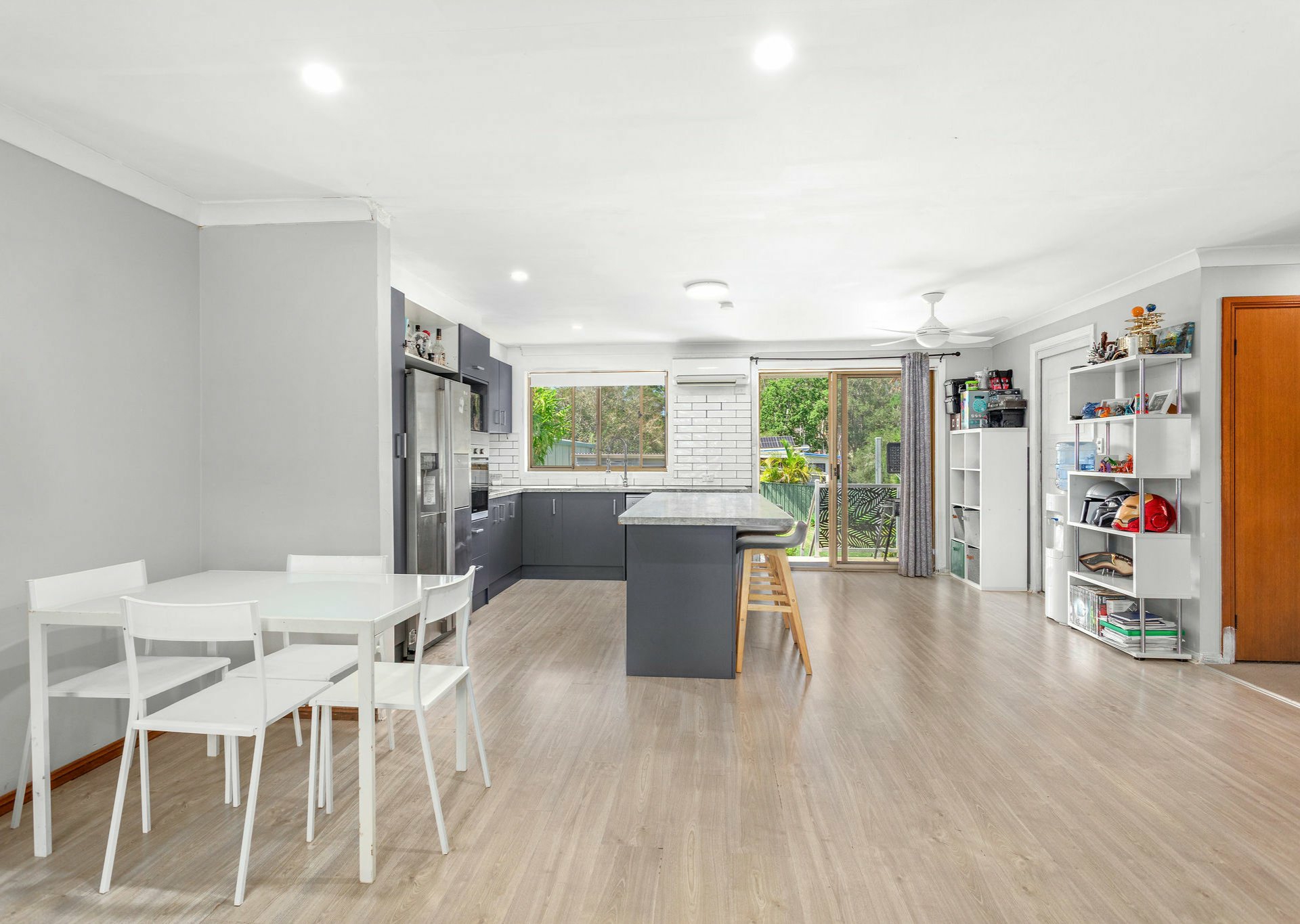 Upon entry, you are welcomed by a refreshed open-plan layout encompassing the dining, kitchen, and lounge areas, all beautifully finished with durable vinyl plank flooring. The modern, spacious kitchen is a standout feature, showcasing striking white splashbacks, stylish grey cabinetry, electric cooking, a dishwasher, and a built-in oven — perfectly designed for everyday living and entertaining.
