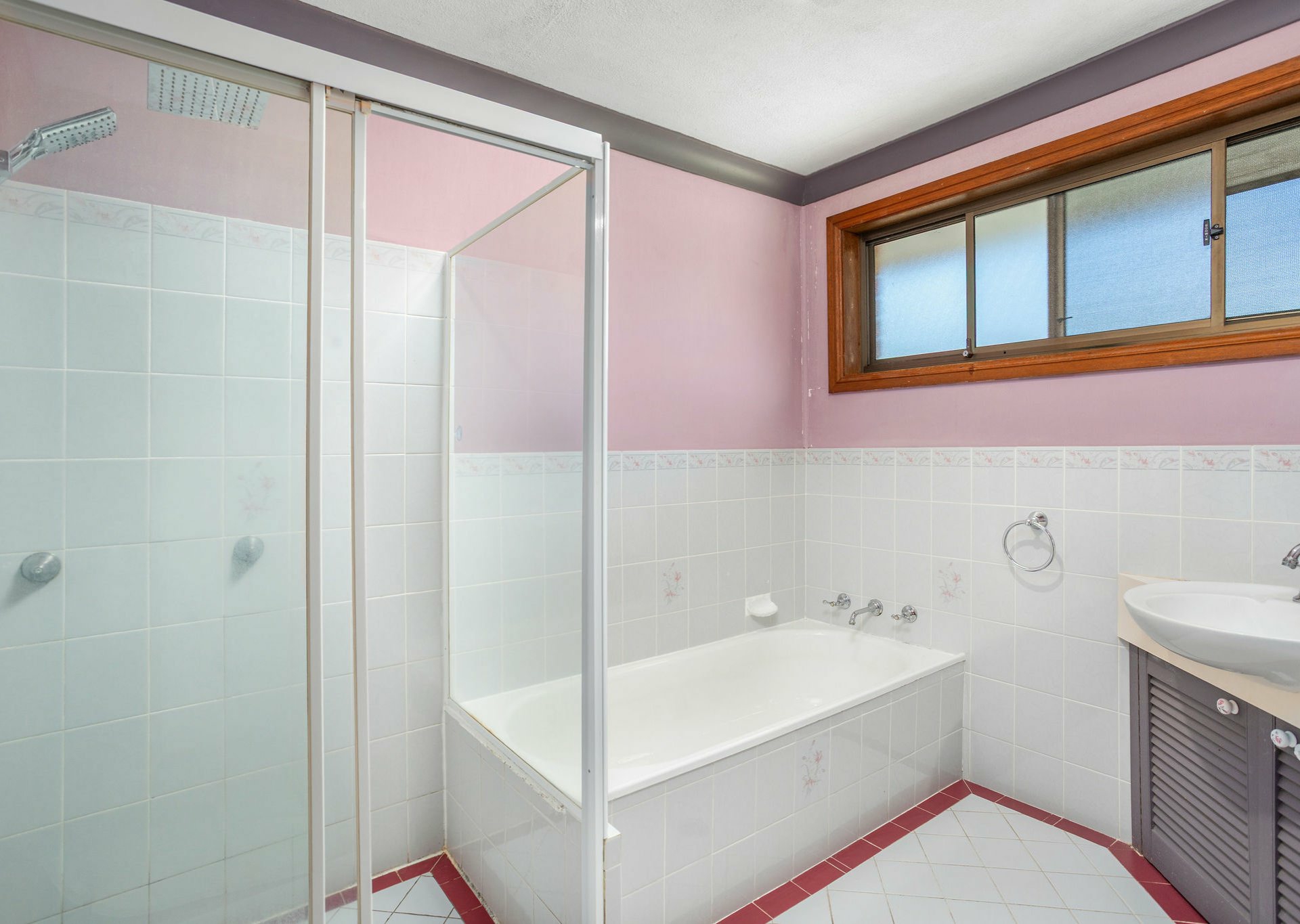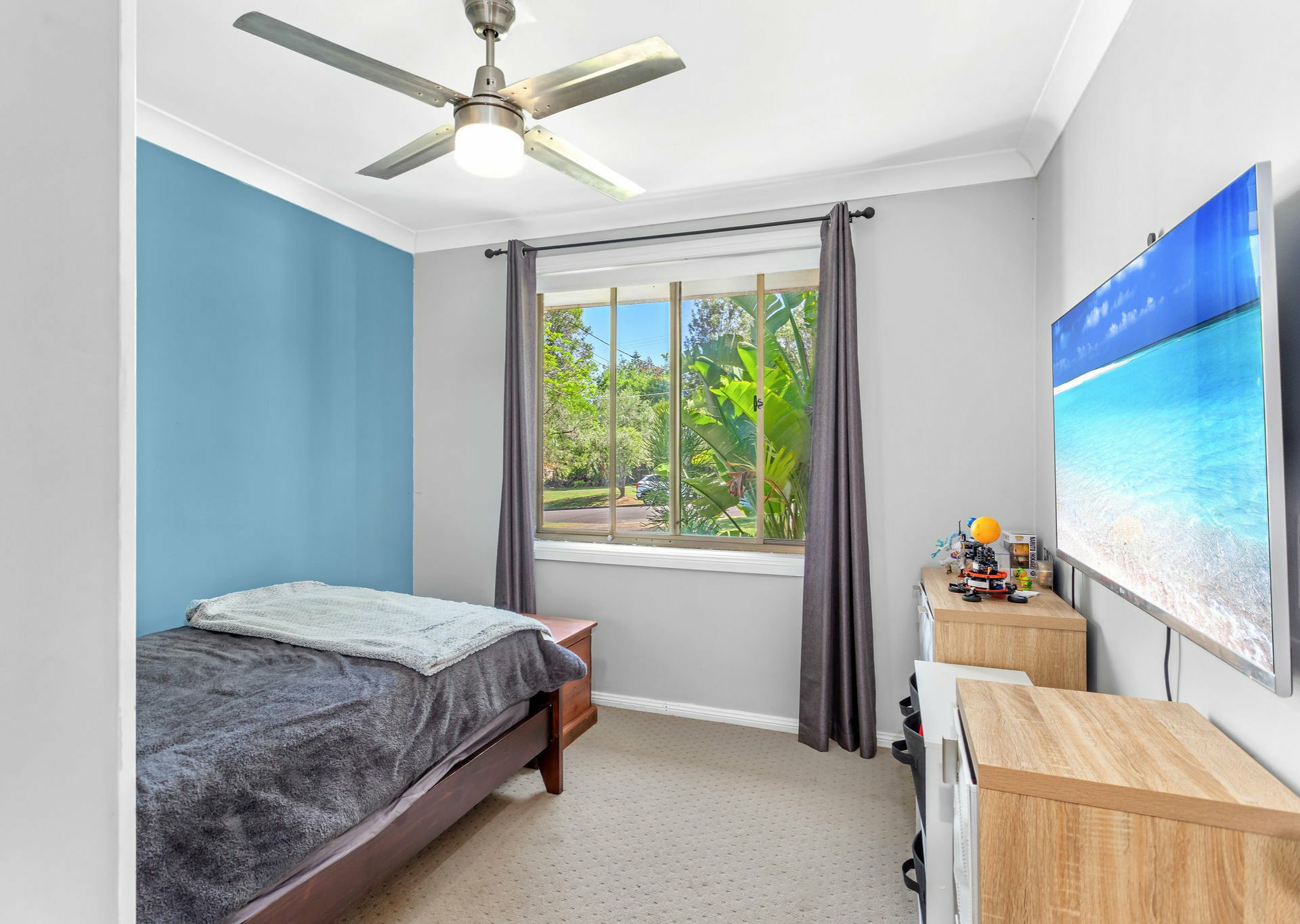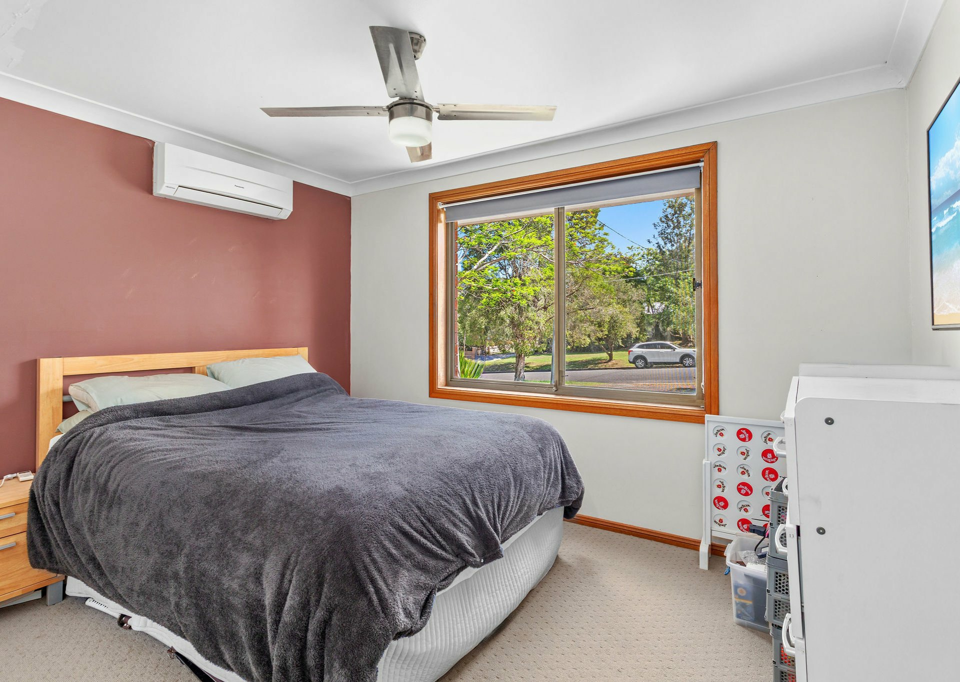 The home offers three well-appointed bedrooms. One bedroom features air conditioning, while the remaining two include ceiling fans and built-in wardrobes. All bedrooms are finished with soft light-beige carpet flooring. The main bathroom is original yet exceptionally well maintained, comprising a bath, shower, and vanity, with a separate toilet for added convenience.