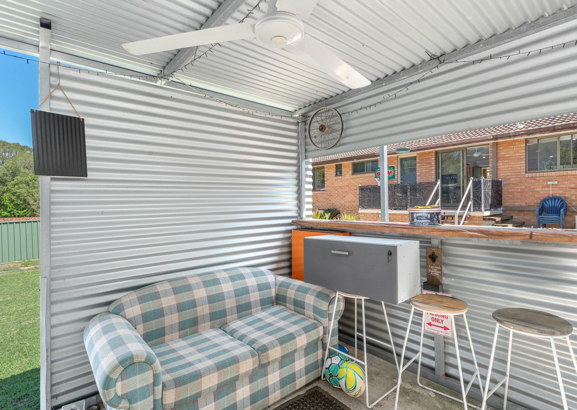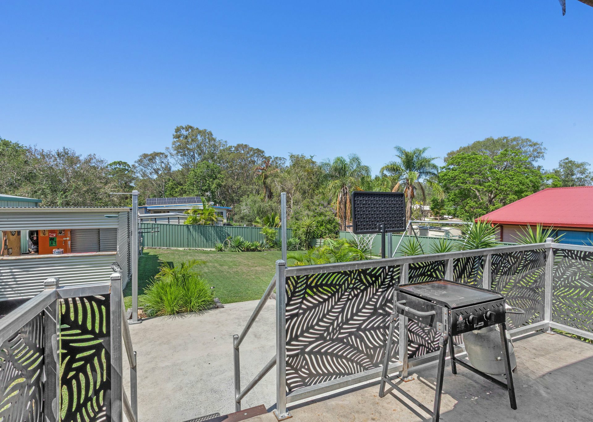 Flowing seamlessly from the kitchen, the home opens onto a charming balcony adorned with decorative screens - a welcoming space that sets the tone for the relaxed backyard experience beyond.