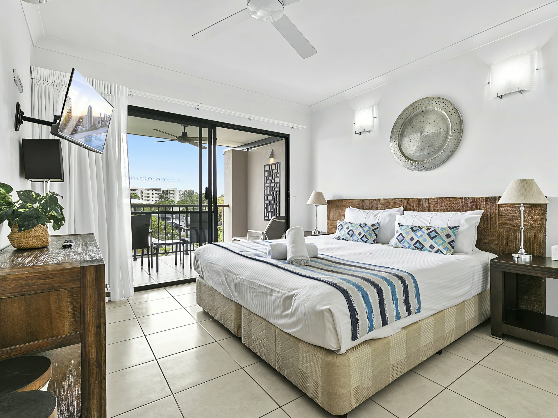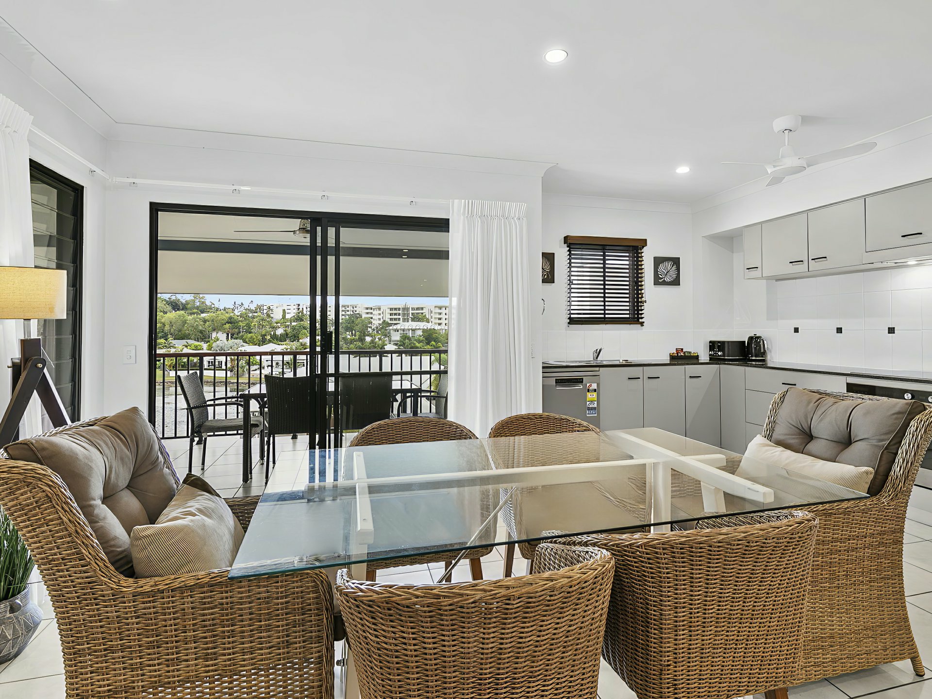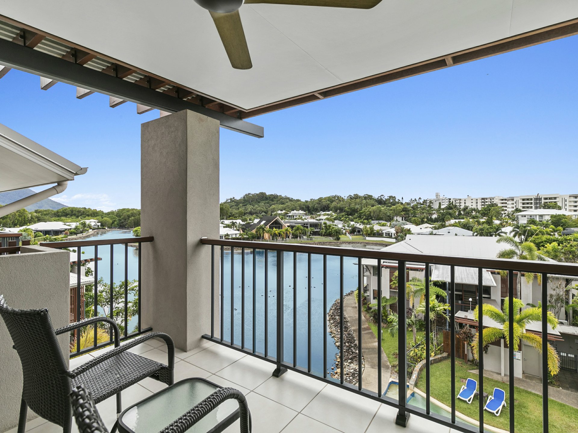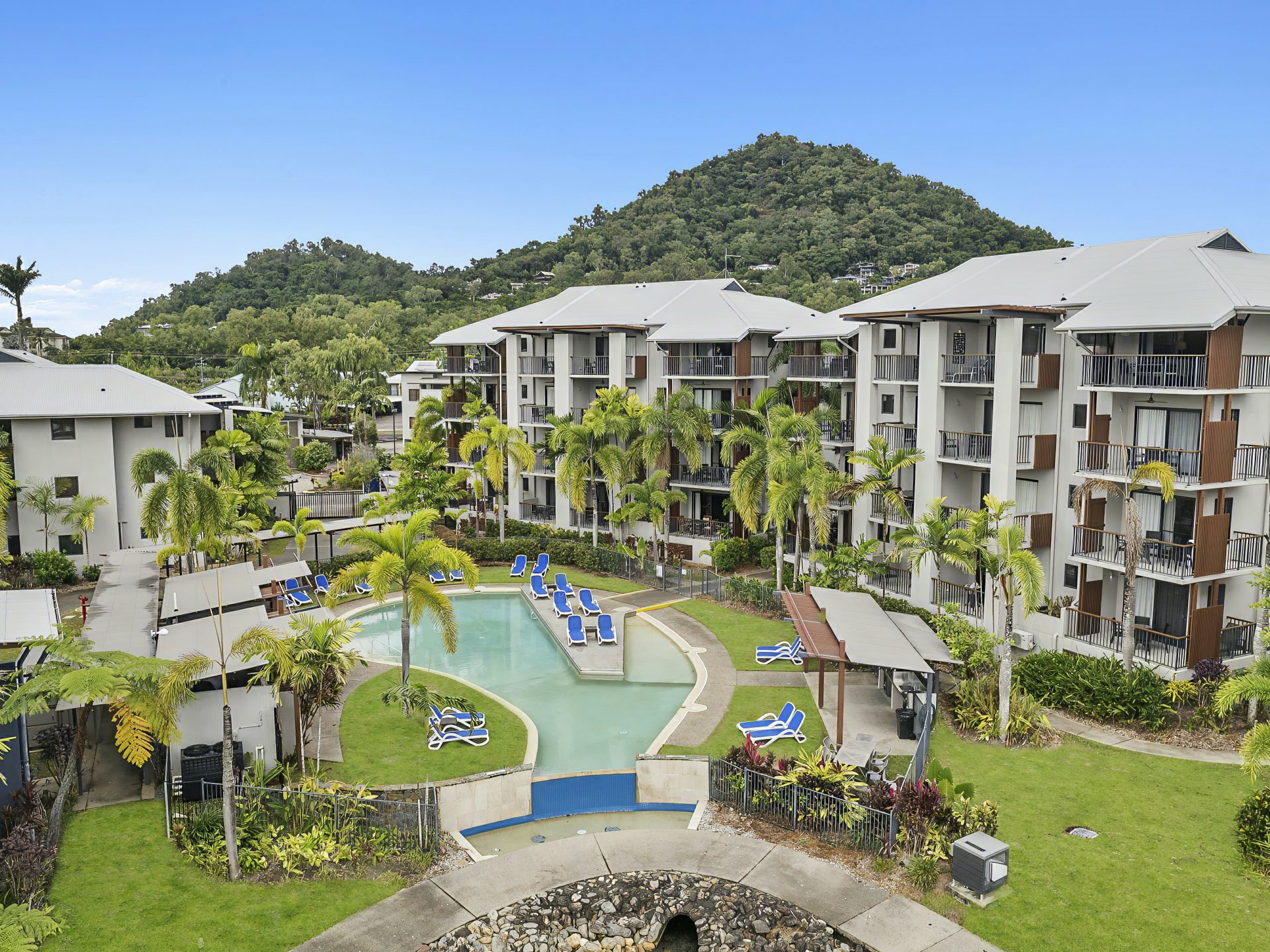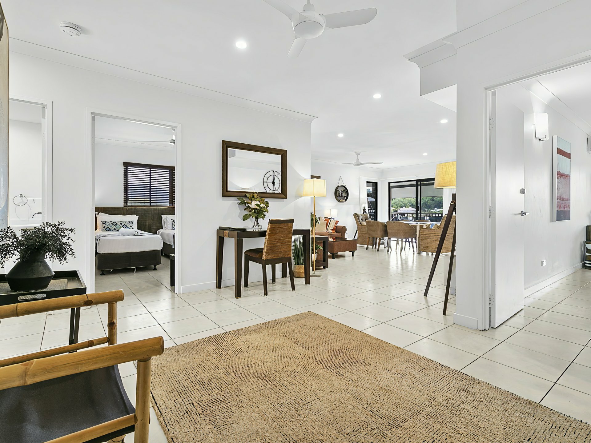 Accessed via direct lift entry, this spacious open-plan residence is the only apartment in the complex to feature three private balconies, each offering uninterrupted vistas over the sparkling lagoon, the resort pool, and the picturesque Macalister Range.