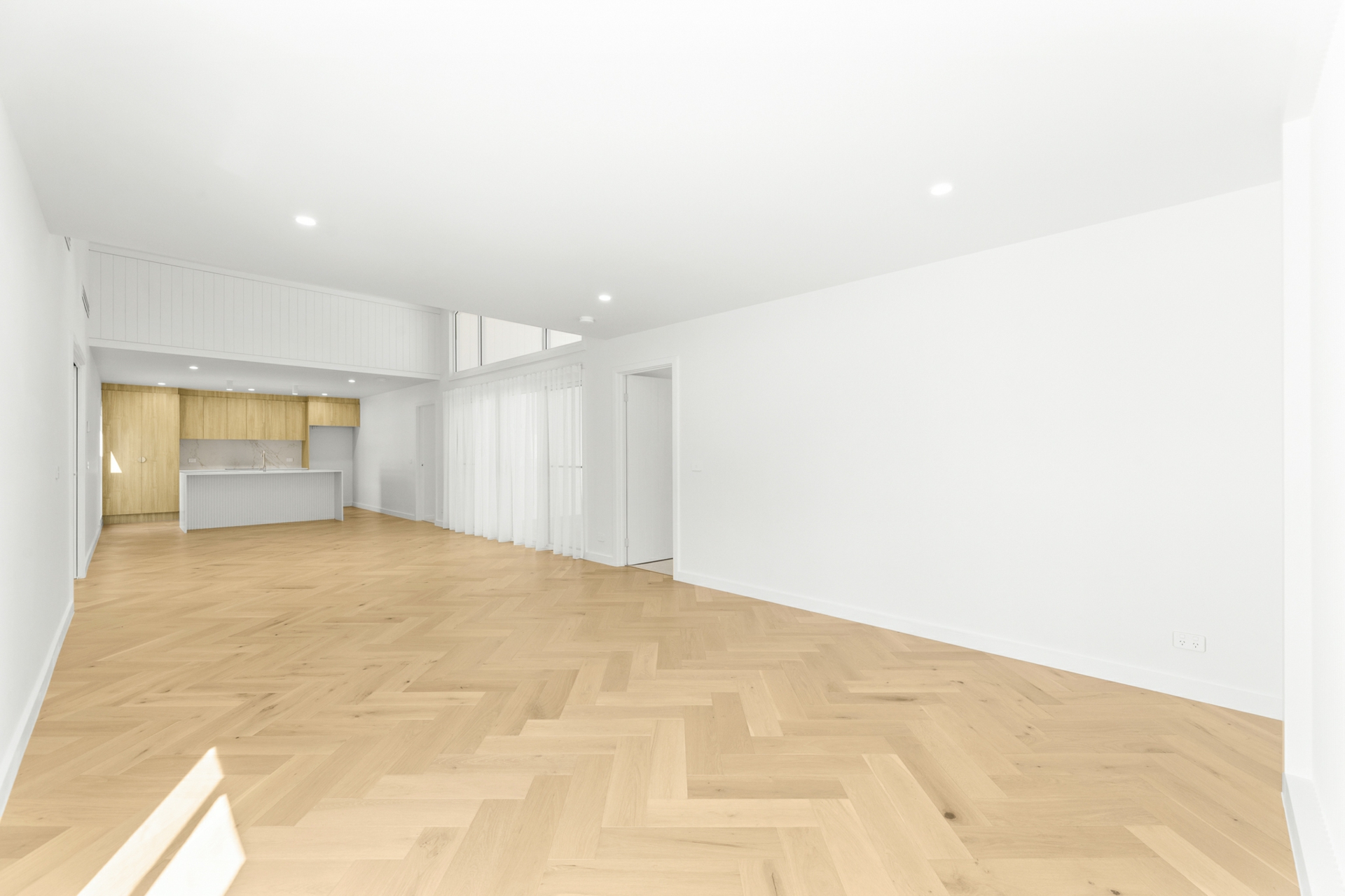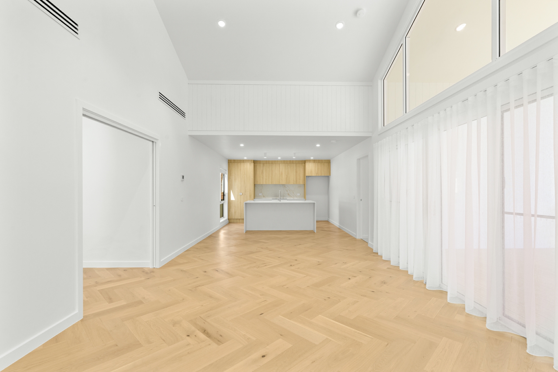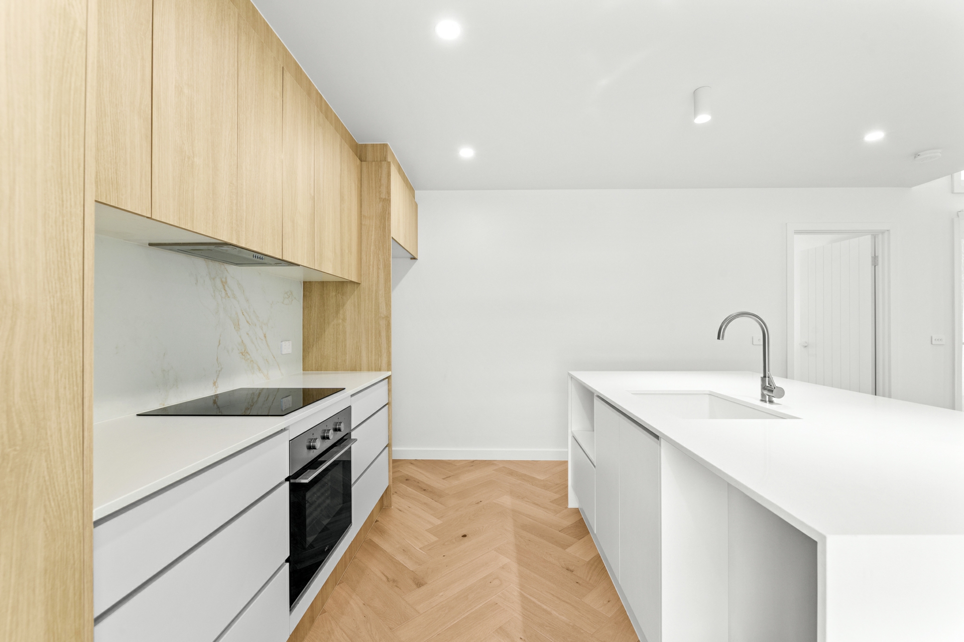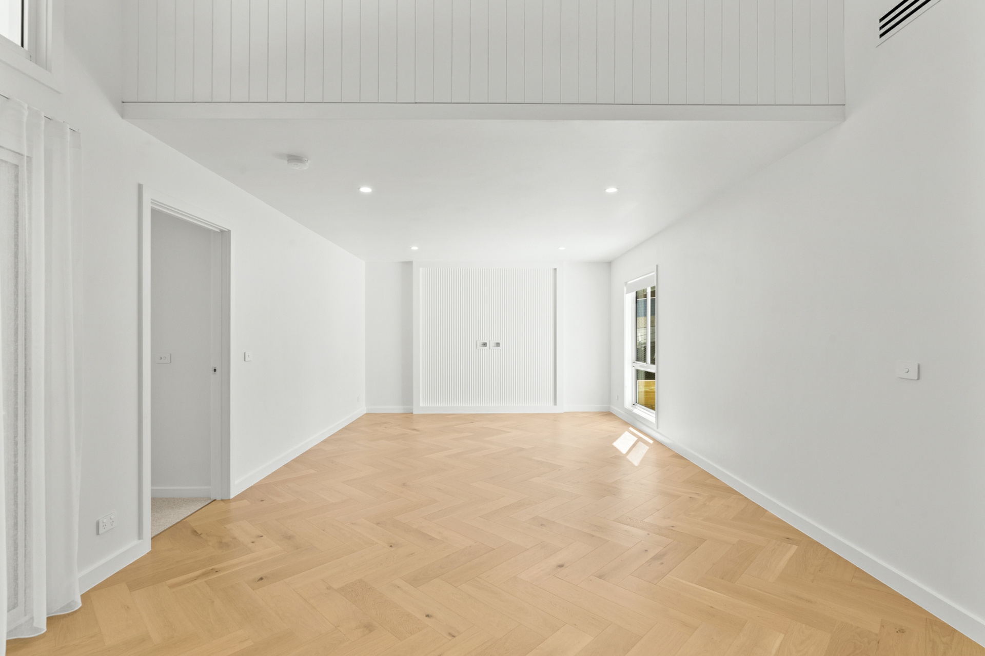 The light-filled open-plan kitchen, living, and dining area forms the heart of the home, enhanced by engineered oak, herringbone flooring and a sleek in-wall reverse cycle system. Recessed sliding doors allow the space to be closed off from the hallway when desired, while large glass sliding doors, topped by a cathedral window, open to a covered alfresco deck with power-overlooking the backyard and tranquil reserve beyond.