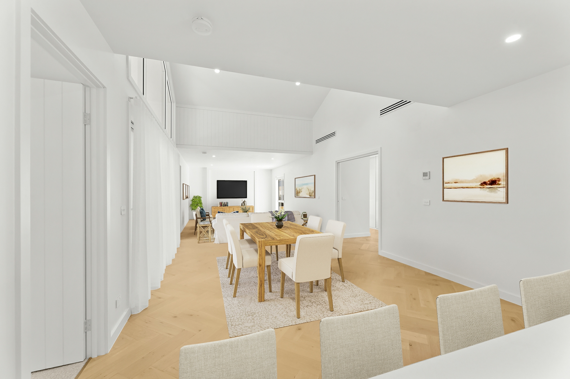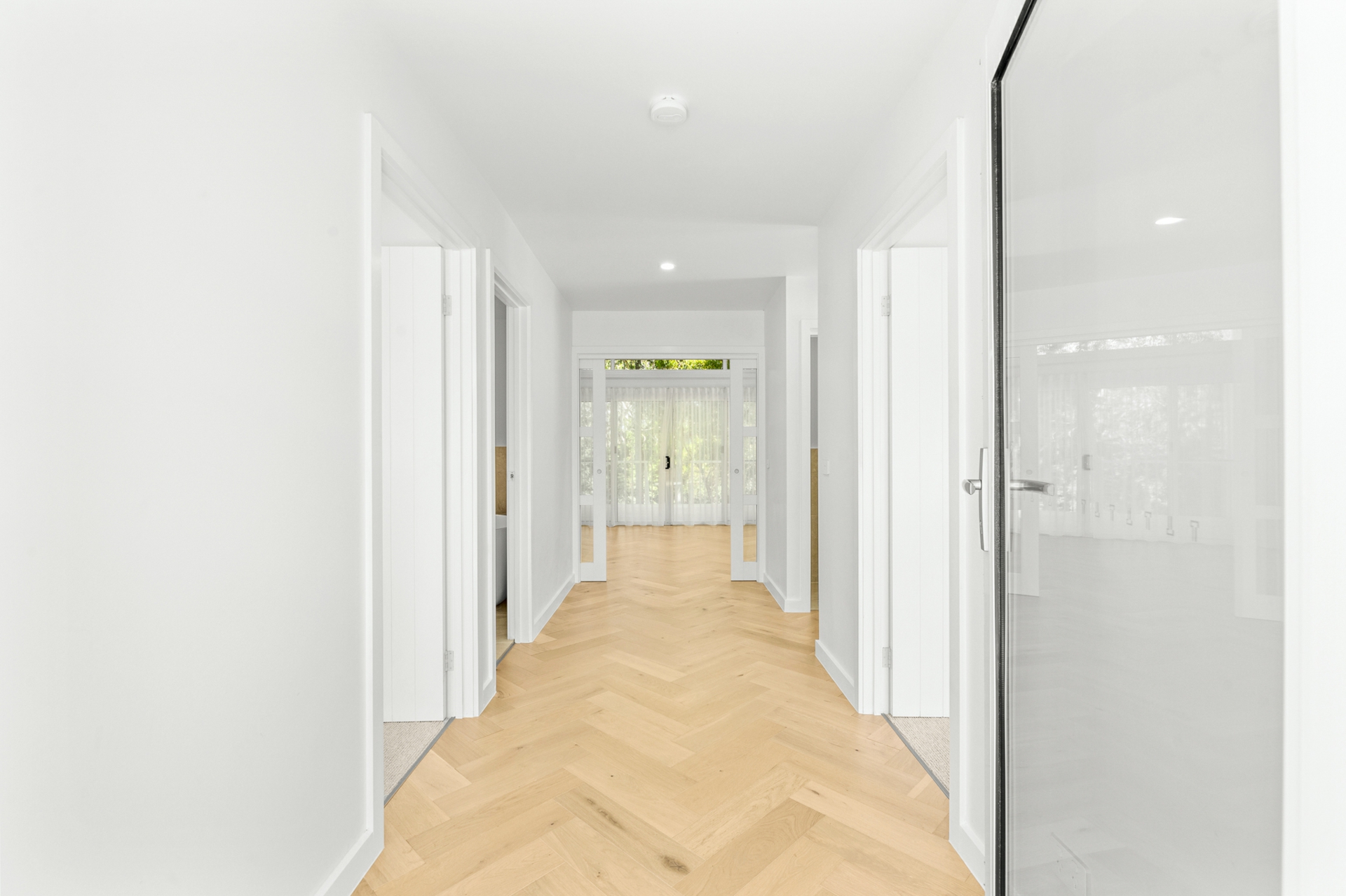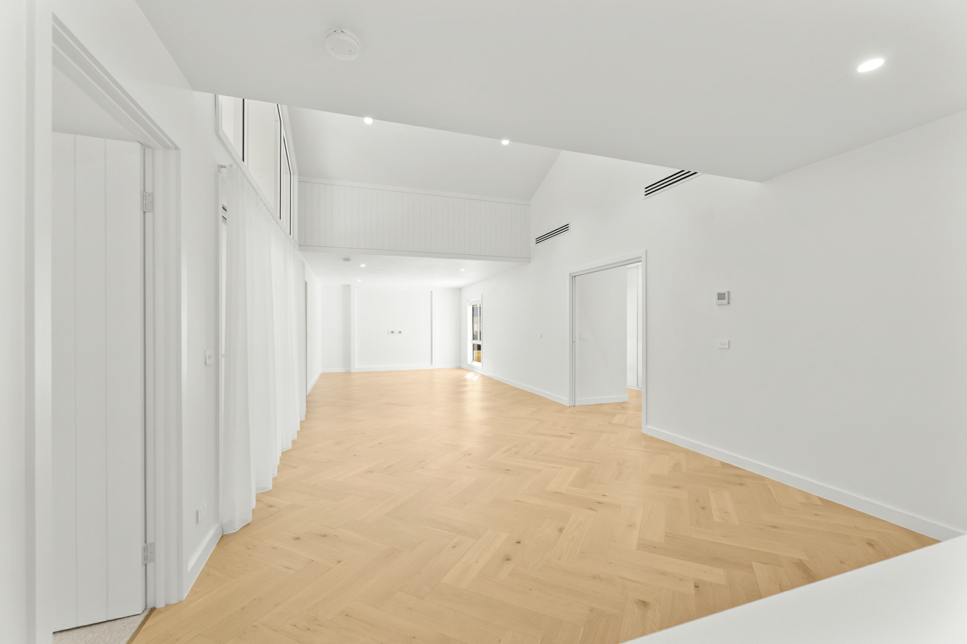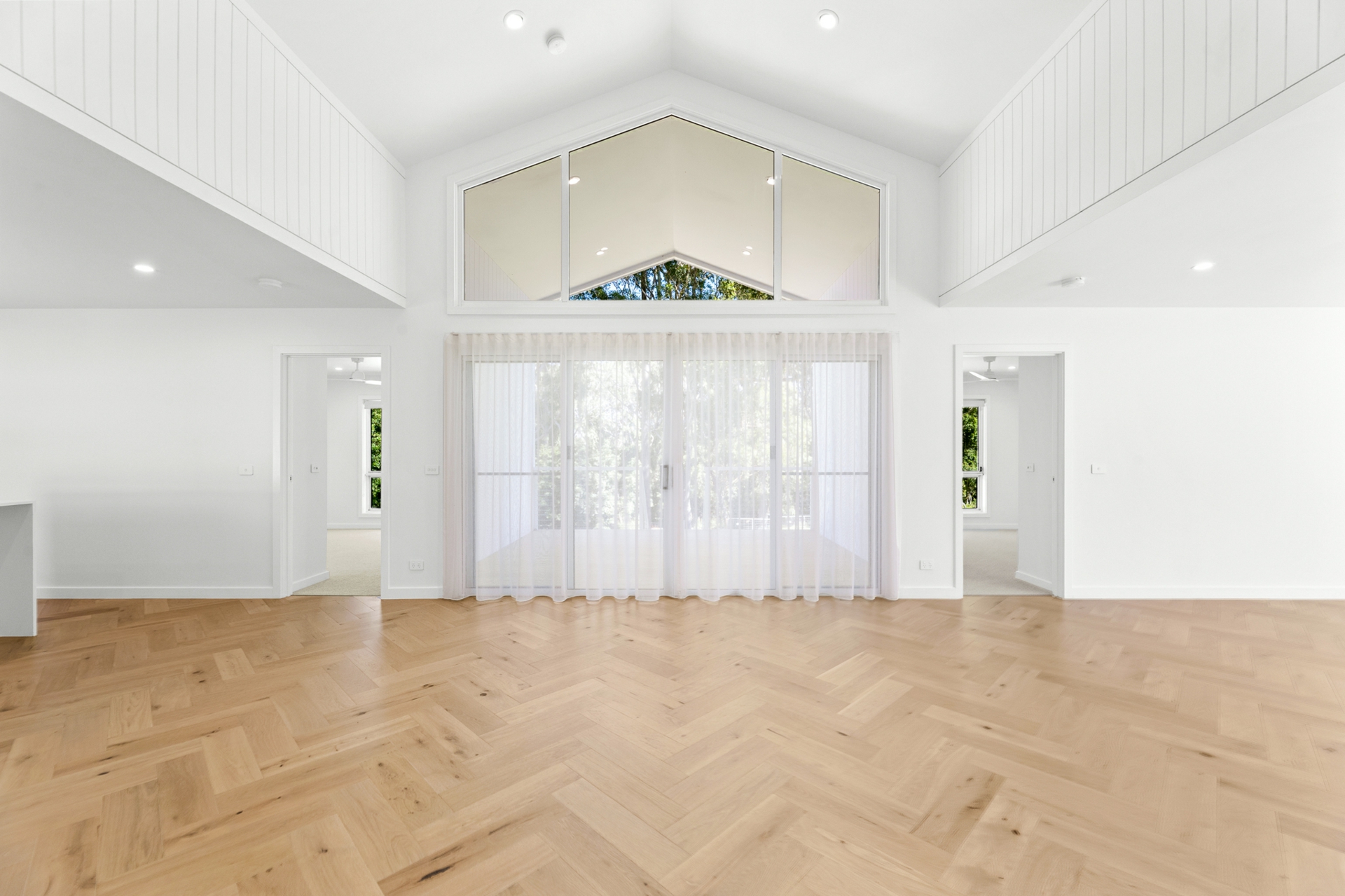 The light-filled open-plan kitchen, living, and dining area forms the heart of the home, enhanced by engineered oak, herringbone flooring and a sleek in-wall reverse cycle system. Recessed sliding doors allow the space to be closed off from the hallway when desired, while large glass sliding doors, topped by a cathedral window, open to a covered alfresco deck with power-overlooking the backyard and tranquil reserve beyond.