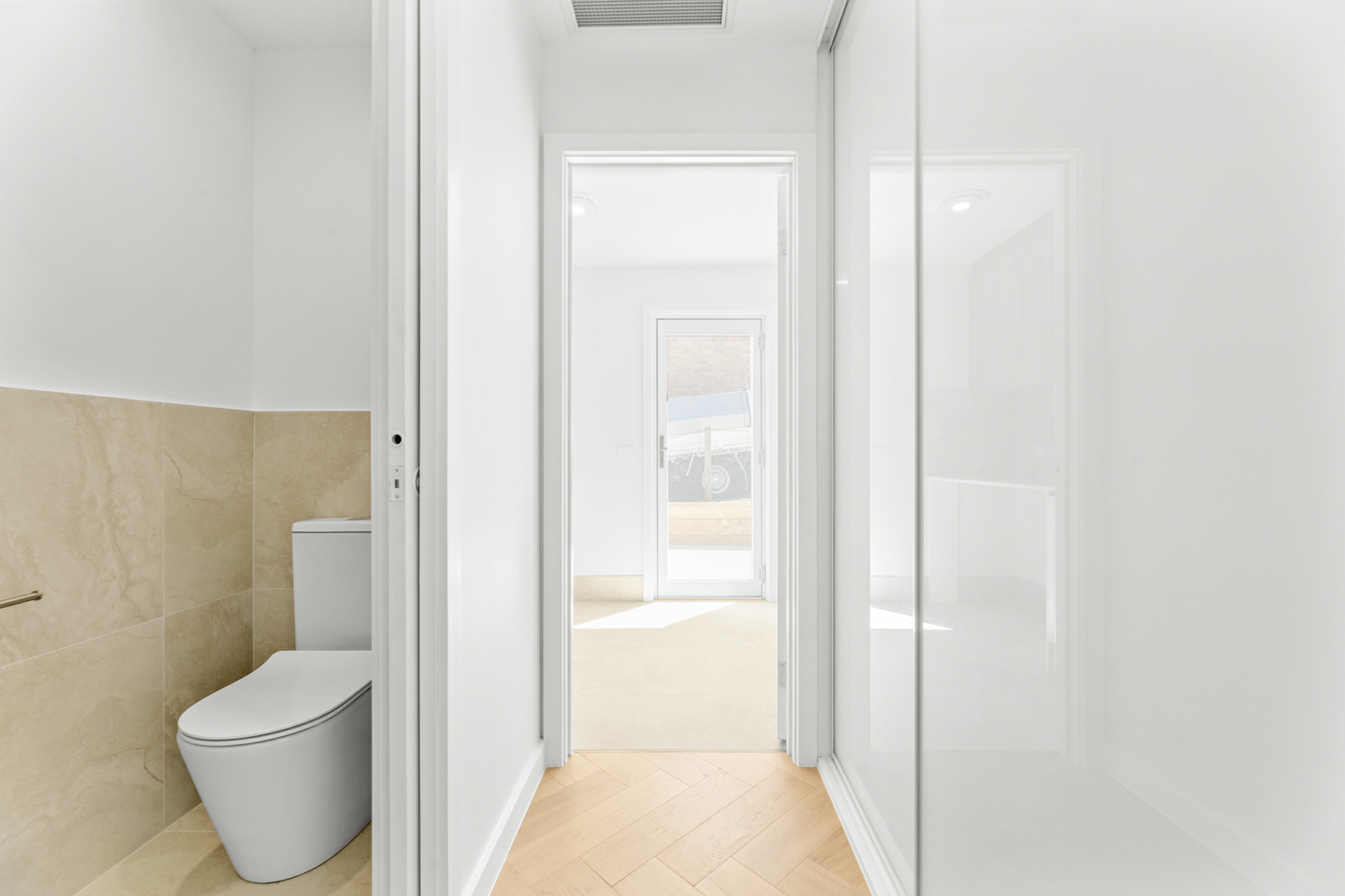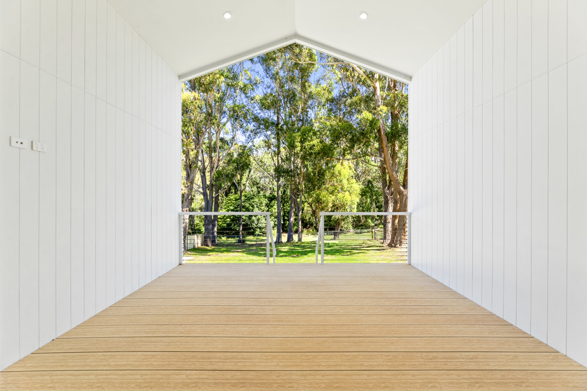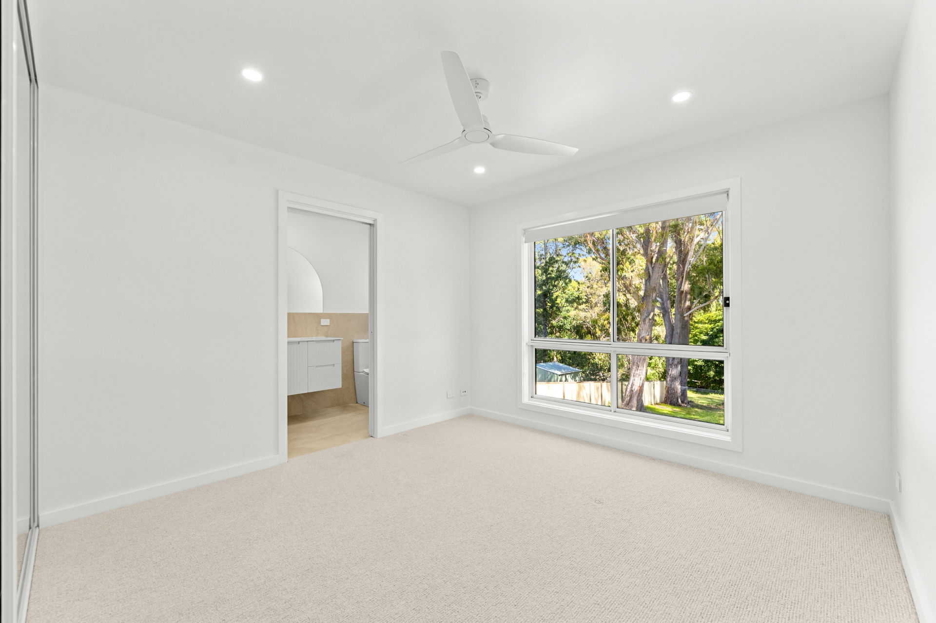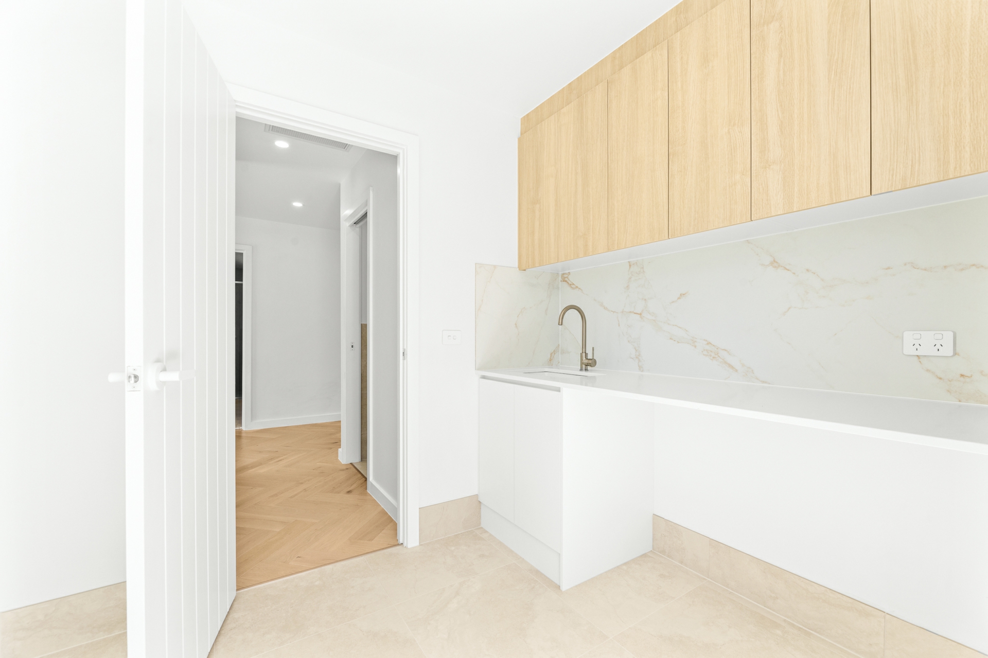 The light-filled open-plan kitchen, living, and dining area forms the heart of the home, enhanced by engineered oak, herringbone flooring and a sleek in-wall reverse cycle system. Recessed sliding doors allow the space to be closed off from the hallway when desired, while large glass sliding doors, topped by a cathedral window, open to a covered alfresco deck with power-overlooking the backyard and tranquil reserve beyond.