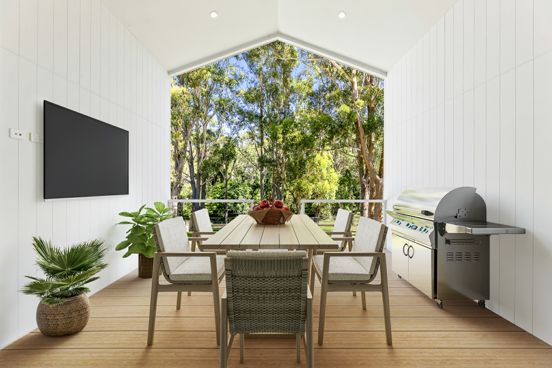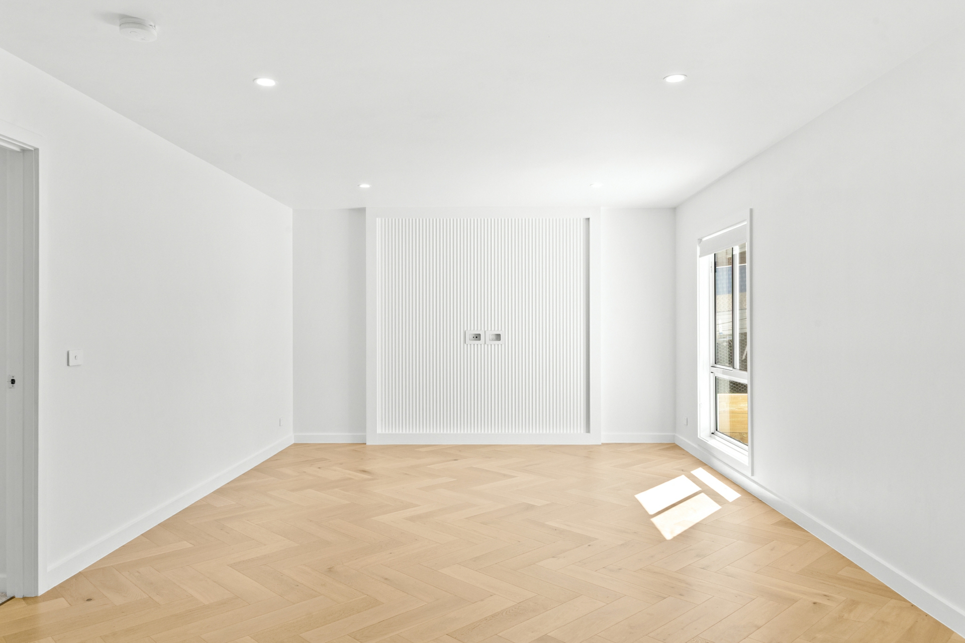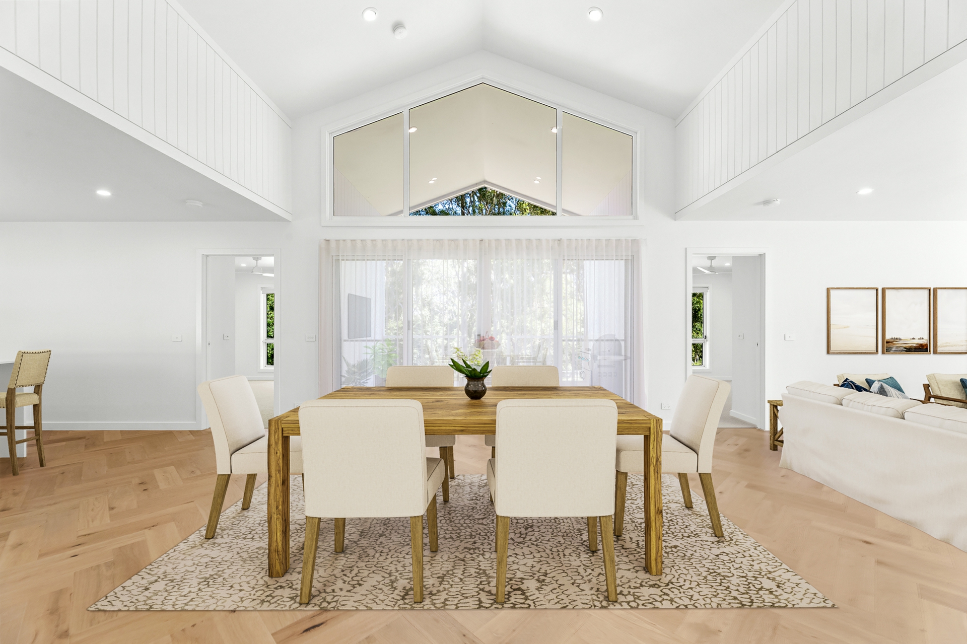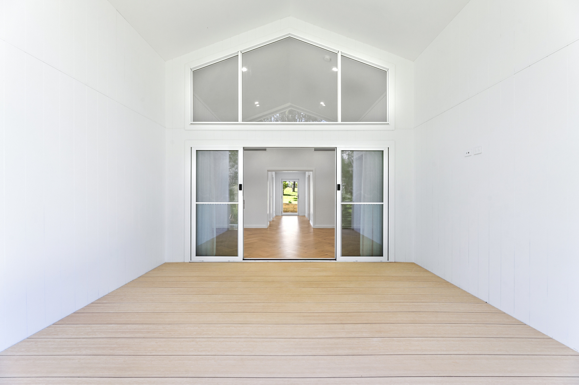 The light-filled open-plan kitchen, living, and dining area forms the heart of the home, enhanced by engineered oak, herringbone flooring and a sleek in-wall reverse cycle system. Recessed sliding doors allow the space to be closed off from the hallway when desired, while large glass sliding doors, topped by a cathedral window, open to a covered alfresco deck with power-overlooking the backyard and tranquil reserve beyond.