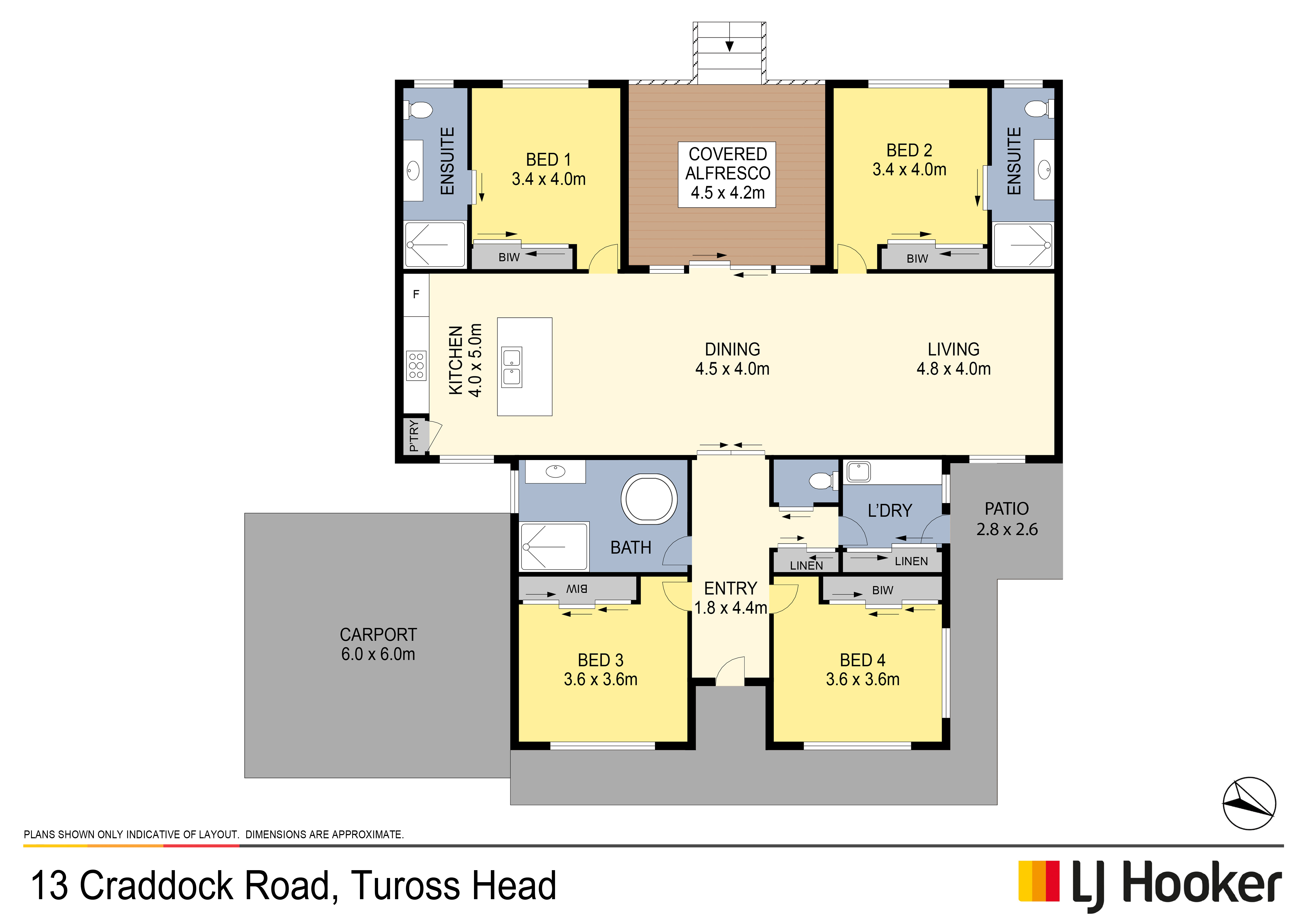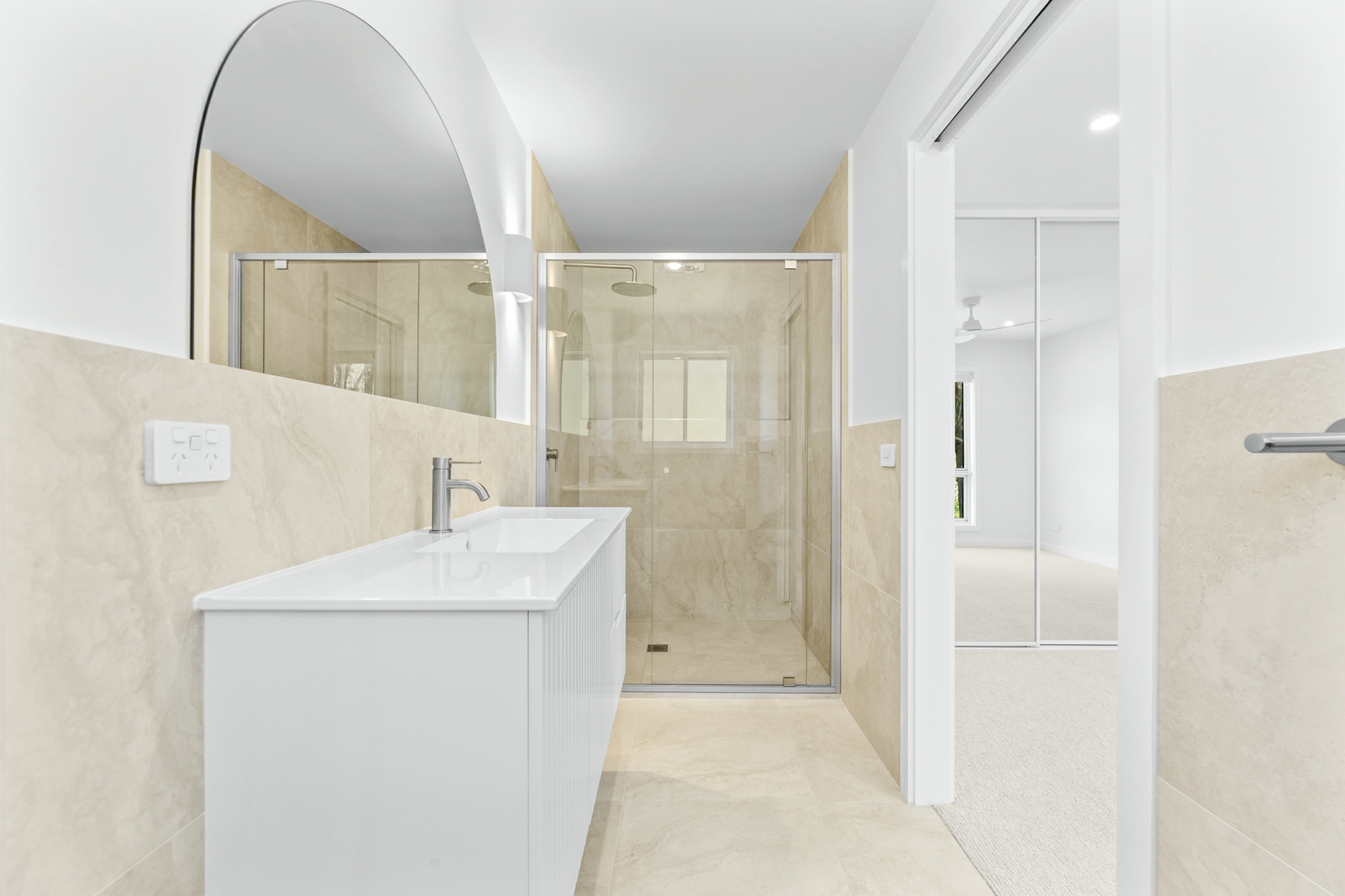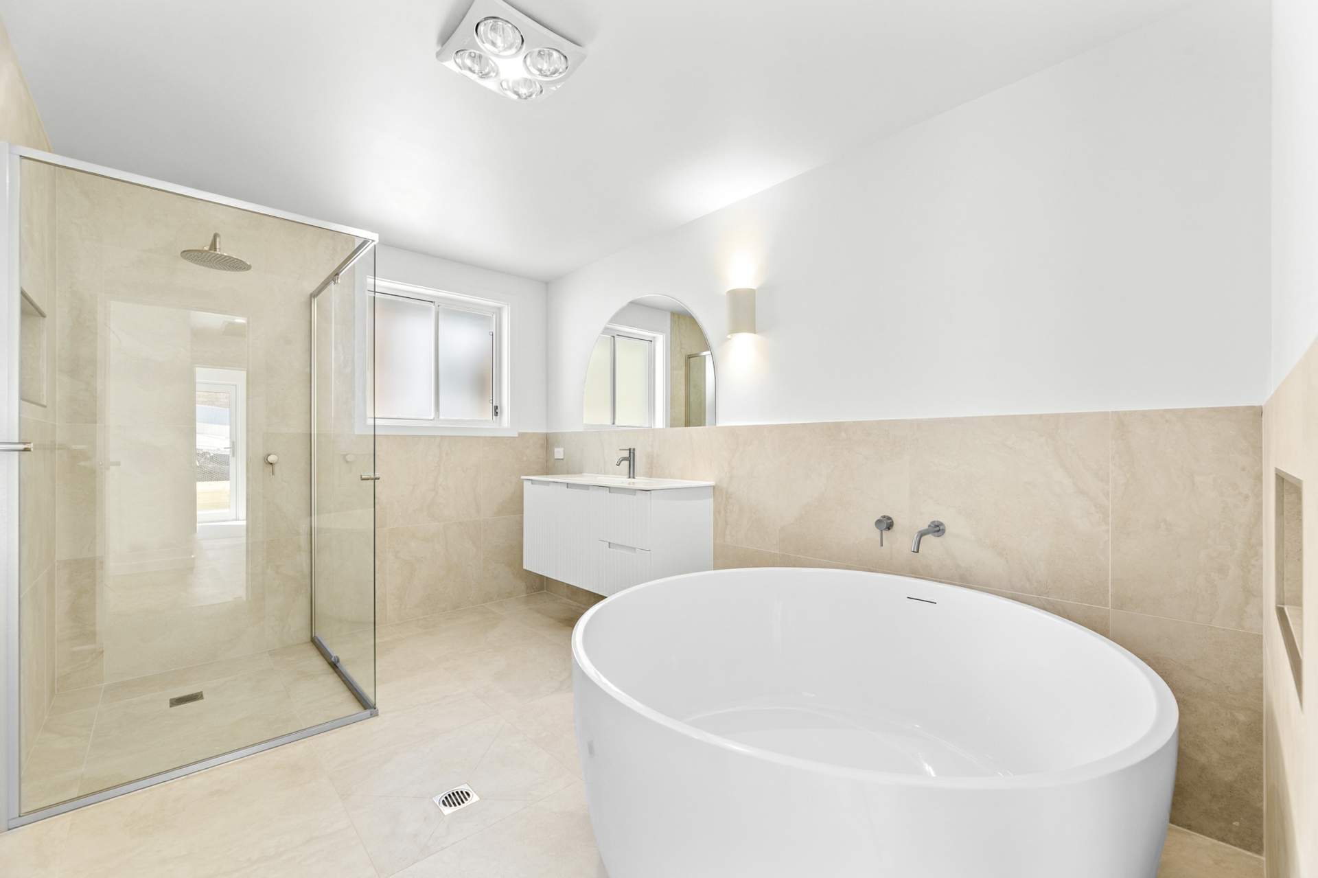 The flexible layout includes four generous bedrooms with mirrored built-in robes, two to the front of the home and two private rear master bedrooms-each with its own beautifully appointed ensuite. A central bathroom features a statement circular bath, separate shower, and separate toilet, complemented by a well-appointed laundry with storage and external access to drying area.