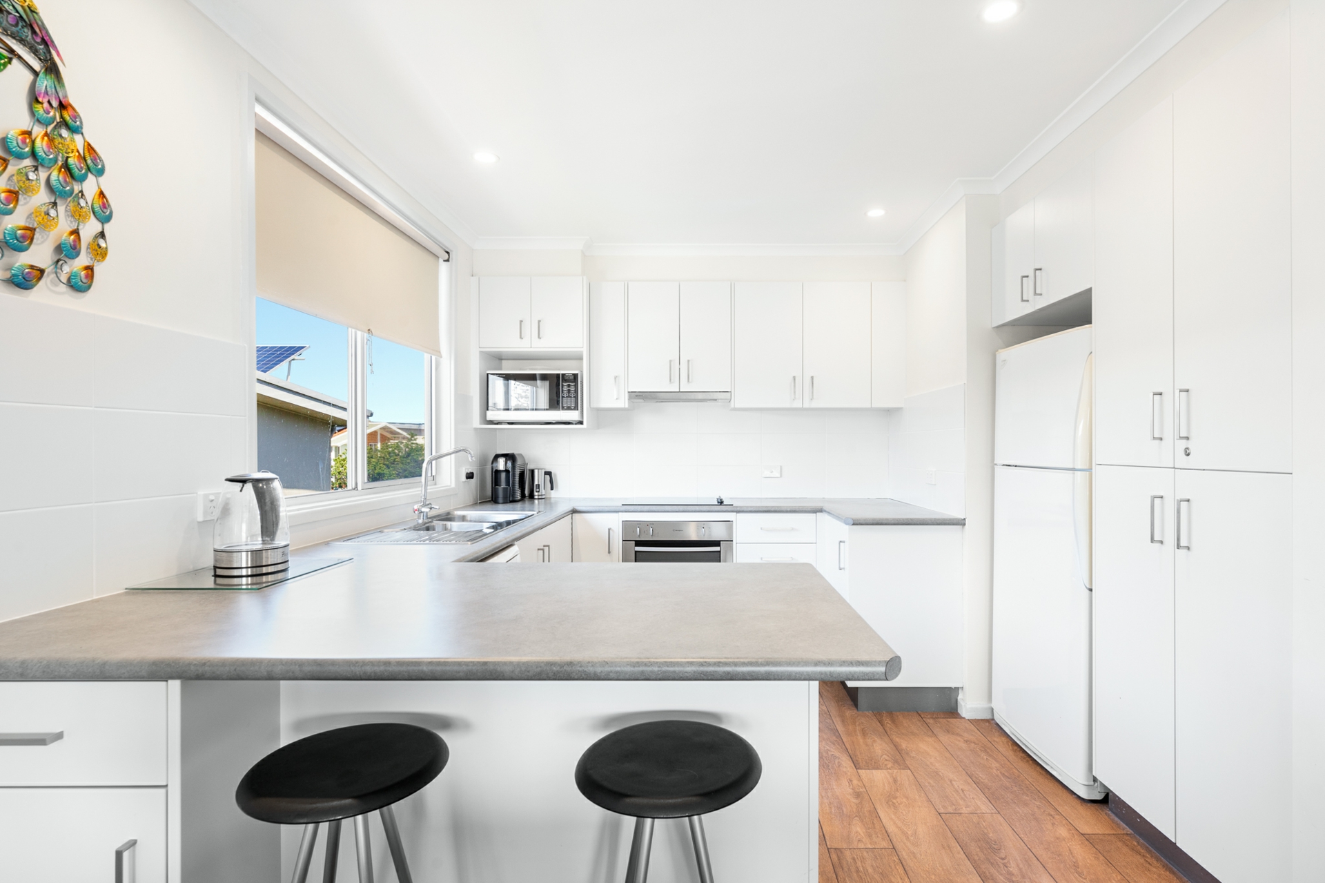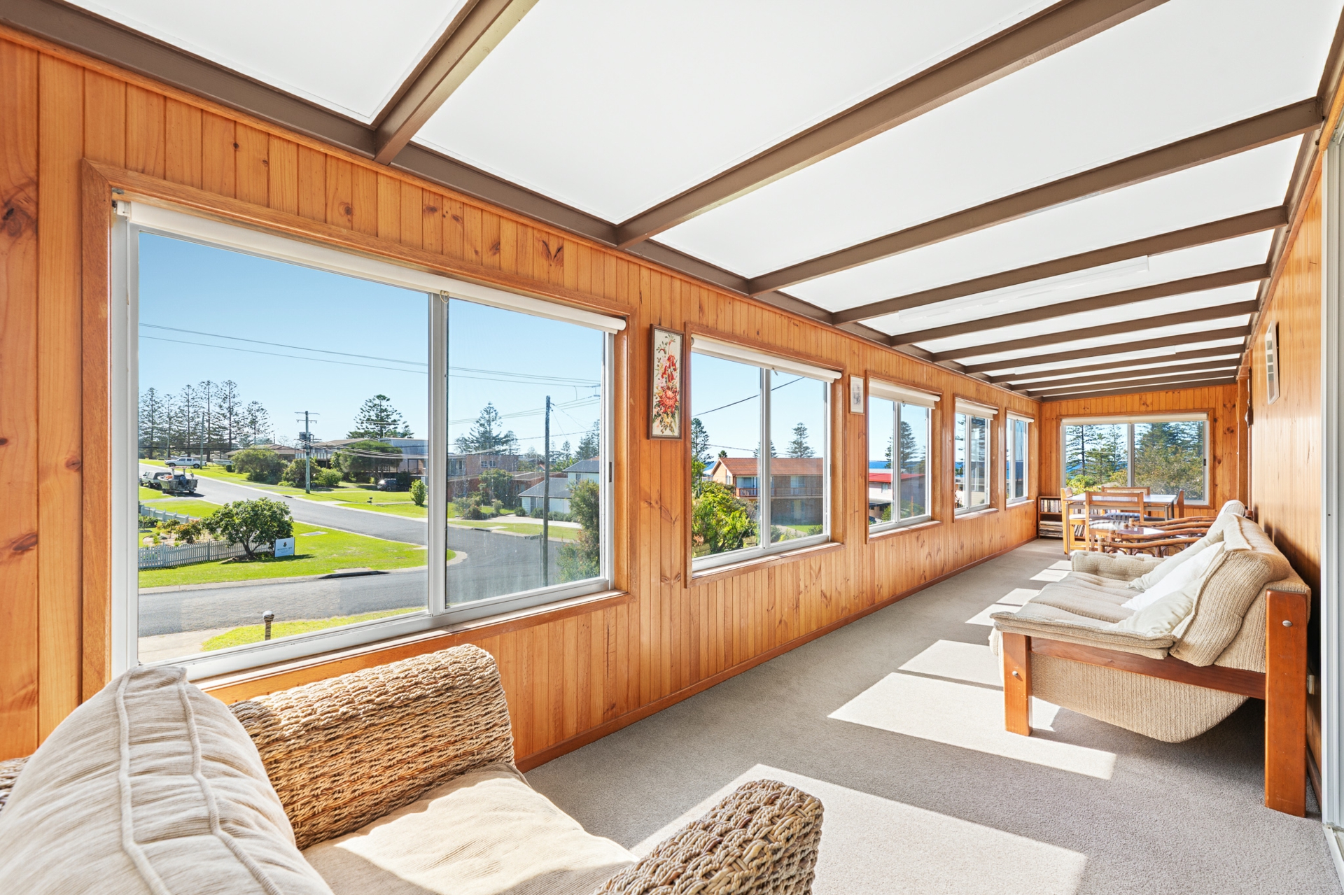 hotplate and oven with ducted range hood, dishwasher, and fridge freezer. To the front of the house there is a full-length sunroom with ocean views.