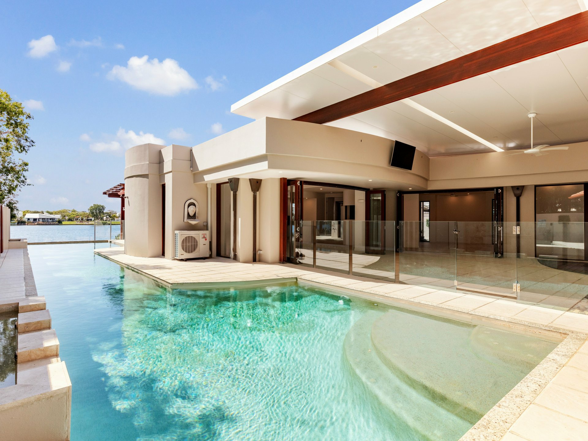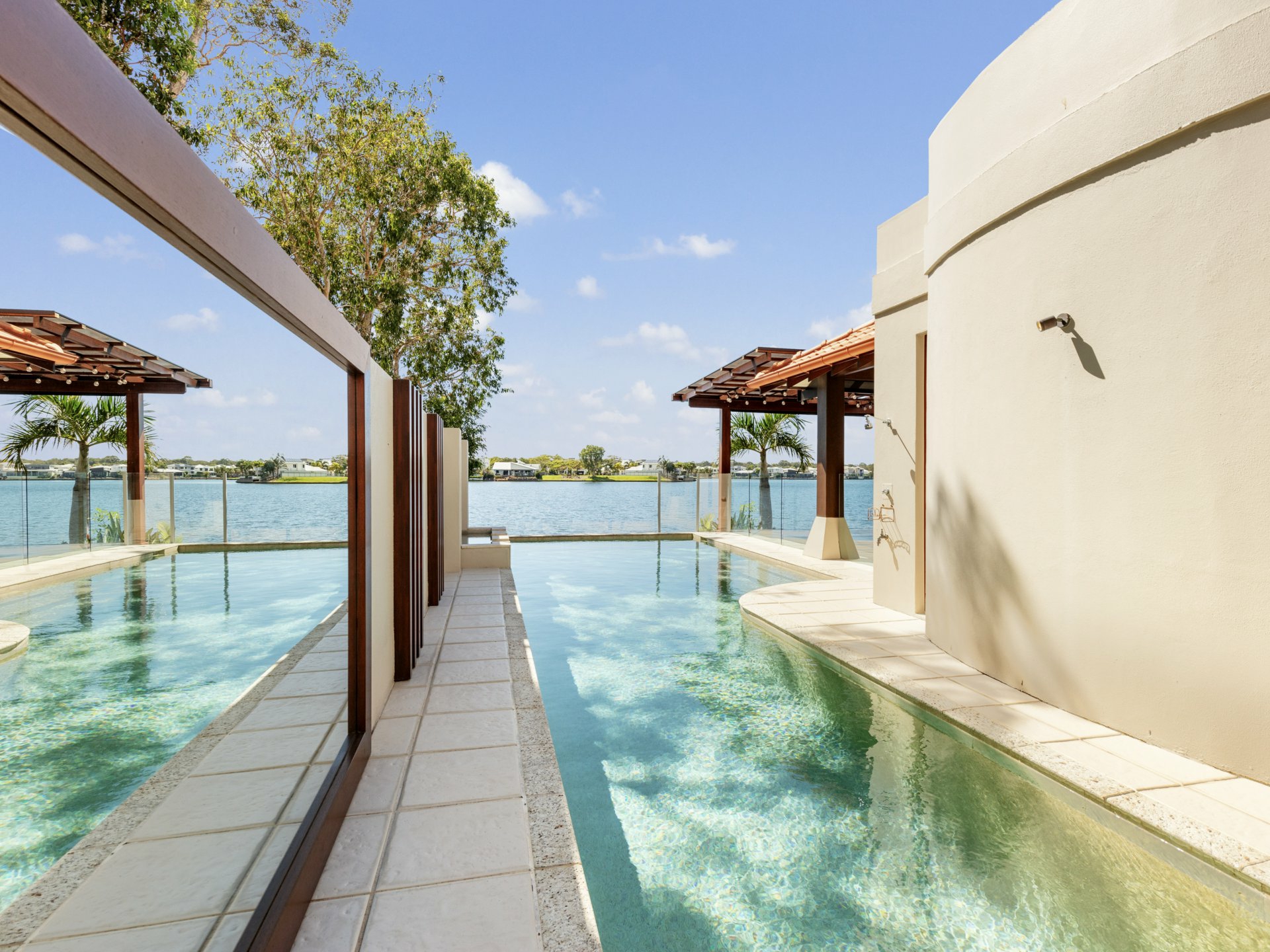 Outdoors, the lifestyle offering is nothing short of spectacular. A magnificent 20-metre swimming pool runs alongside the home, perfectly oriented to take in uninterrupted water views — a rare and breathtaking feature that defines resort-style living.