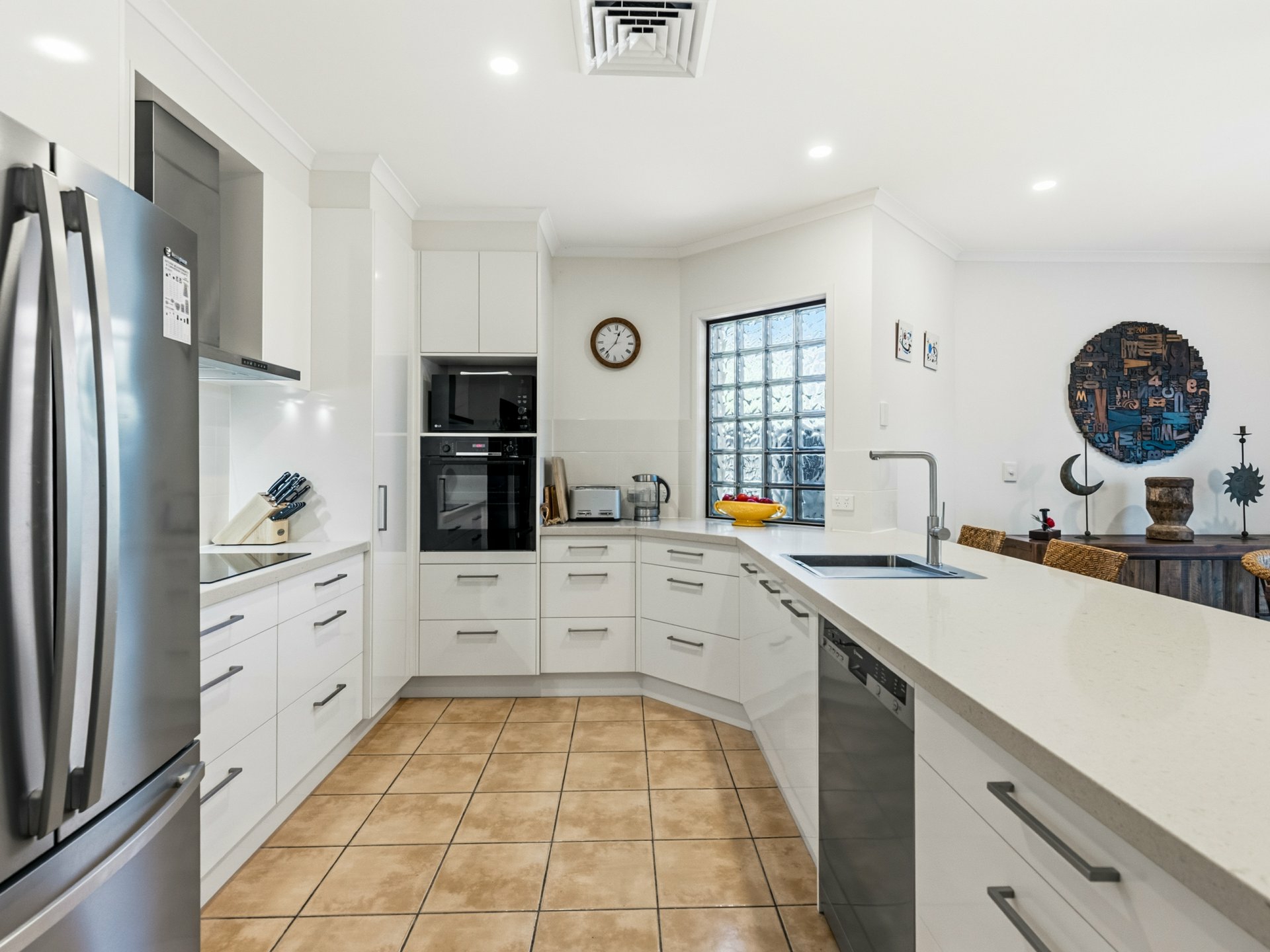 The spacious kitchen features stone benchtops, quality appliances and excellent storage, seamlessly connecting to the living and entertaining areas. Ducted and zoned air-conditioning ensures climate control throughout, while ceiling fans add further comfort.