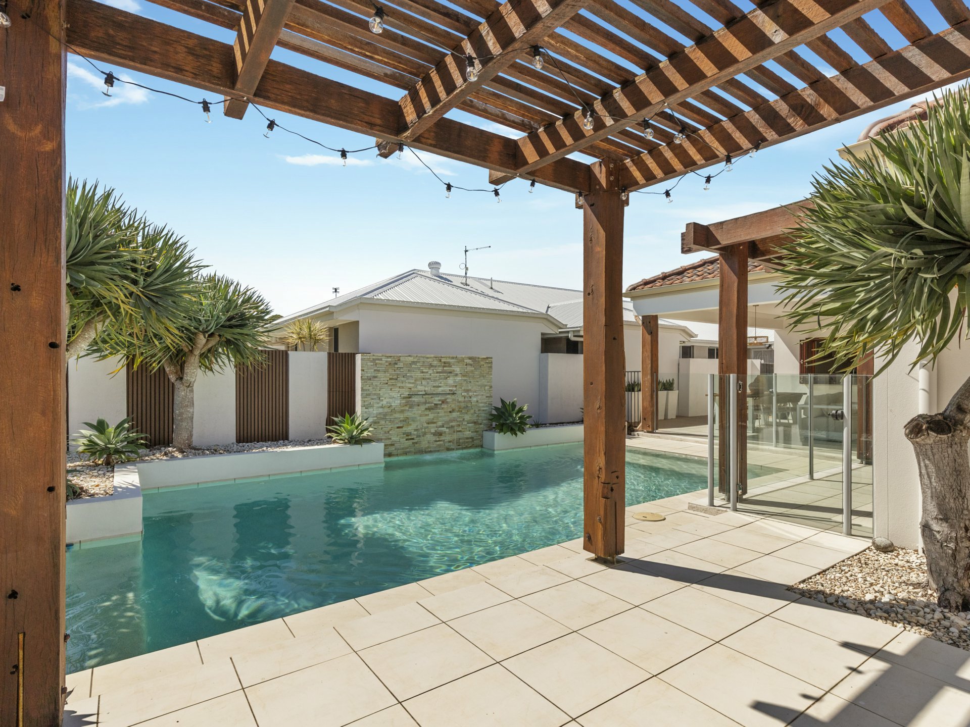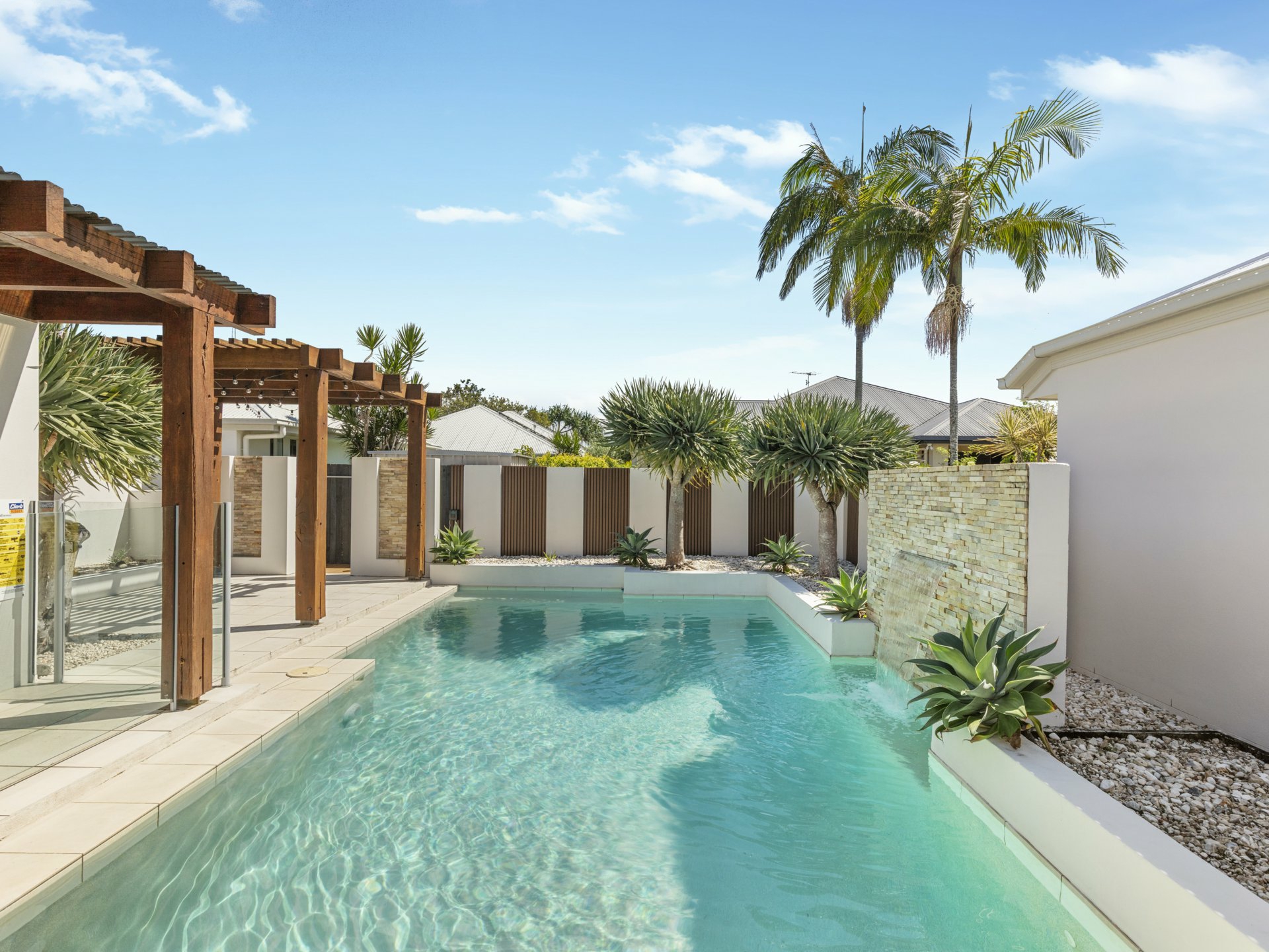 At its heart, the home is designed for effortless indoor-outdoor living. Expansive living and dining zones flow seamlessly to the outdoor entertaining area, where a stunning pool with tranquil water feature becomes the centrepiece. Whether hosting guests or enjoying quiet family time, this private oasis offers the ultimate coastal lifestyle experience.