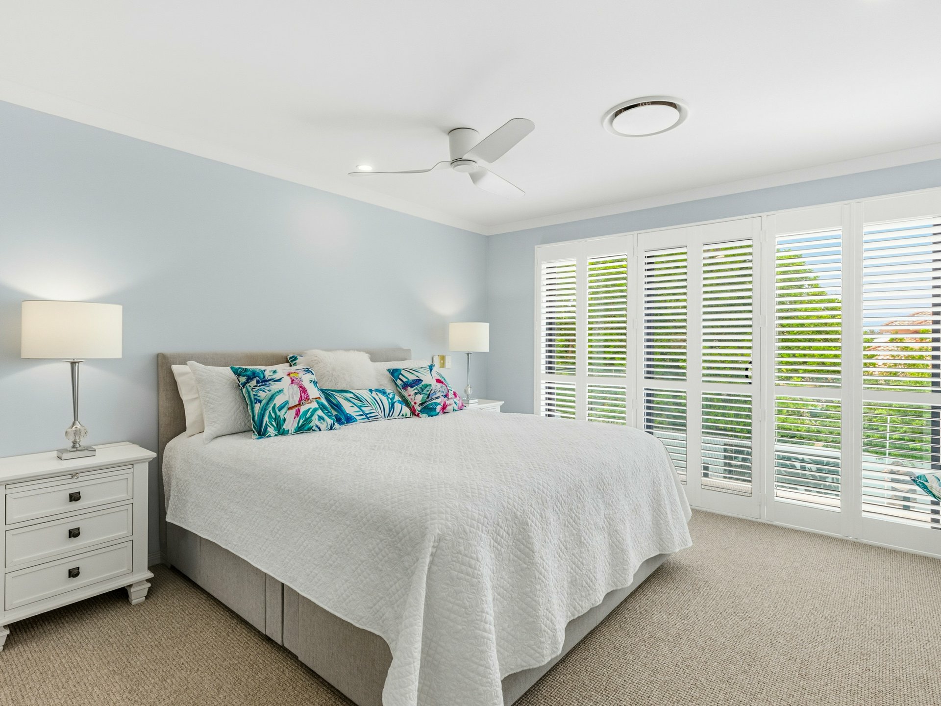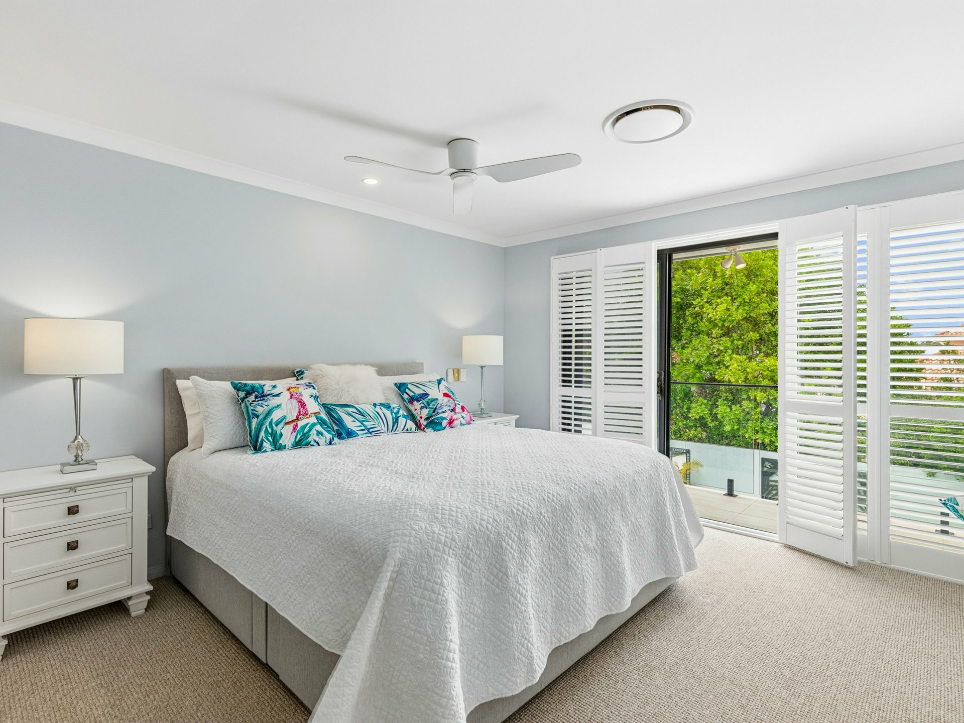The large master suite is thoughtfully positioned to offer both comfort and seclusion. It features a generous walk-in robe, a beautifully appointed modern ensuite, a private east-facing balcony, and a separate office or retreat space — ideal for working from home or quiet relaxation.