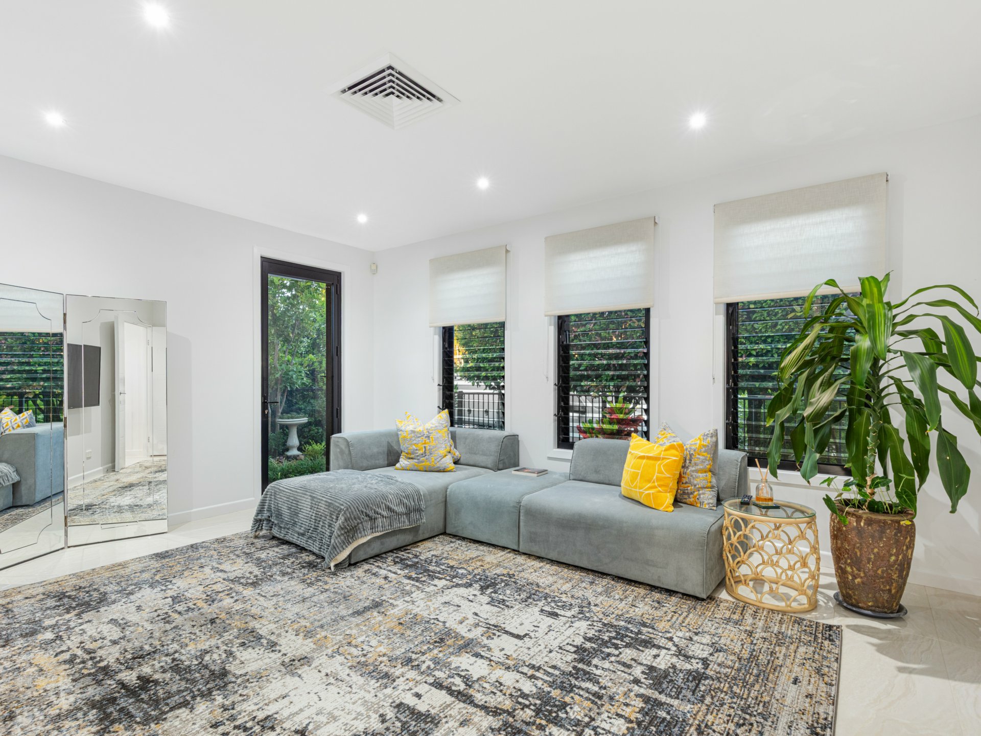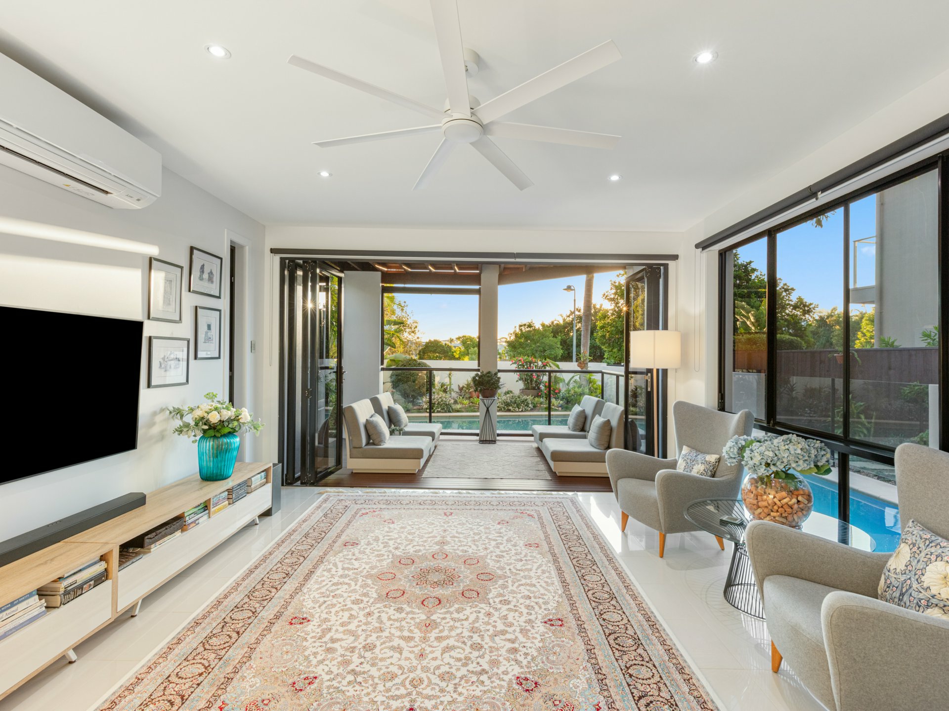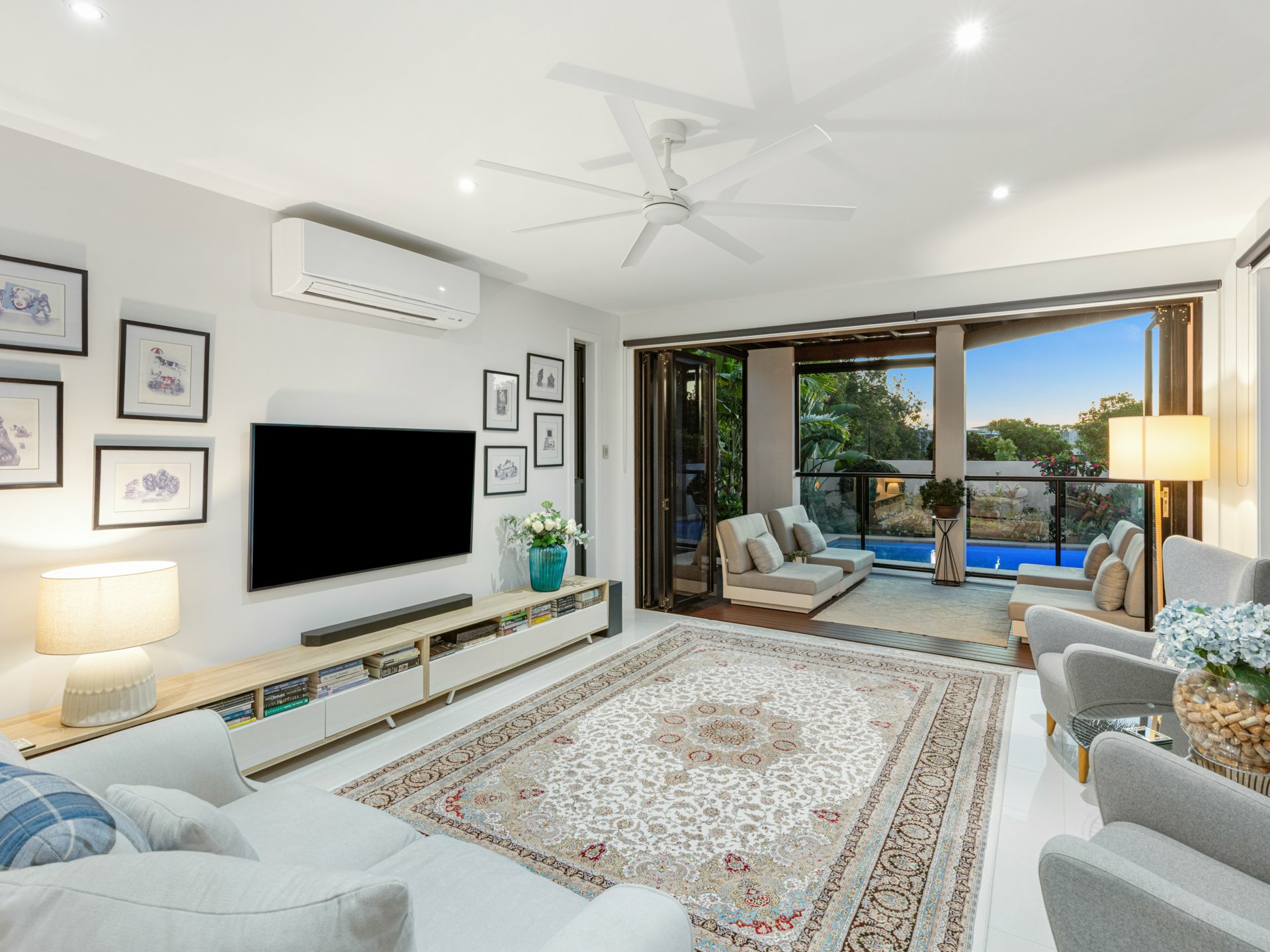 - Multiple living zones, including dedicated media room