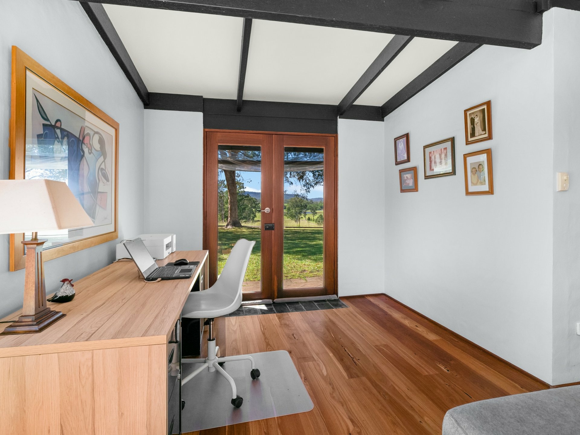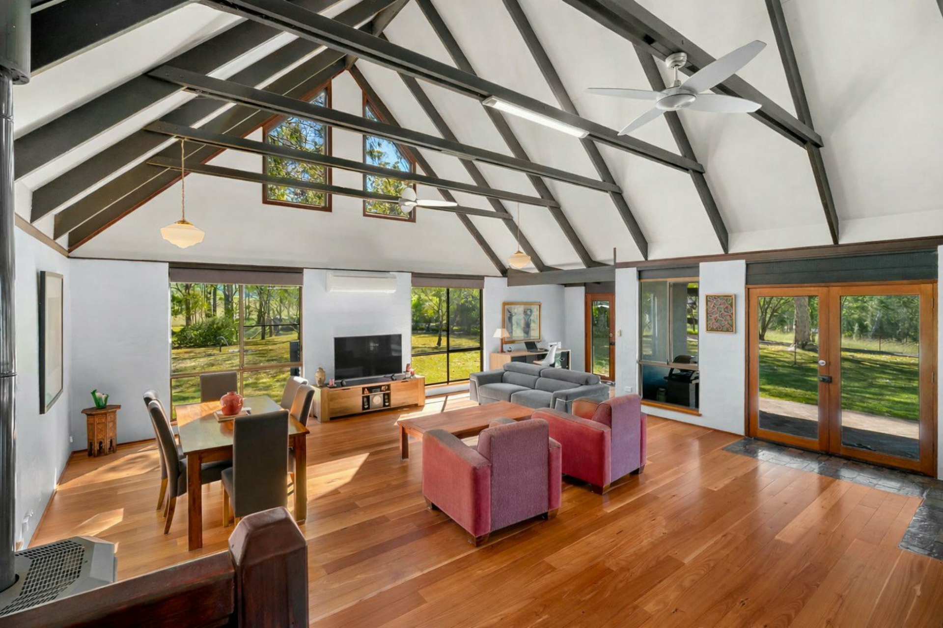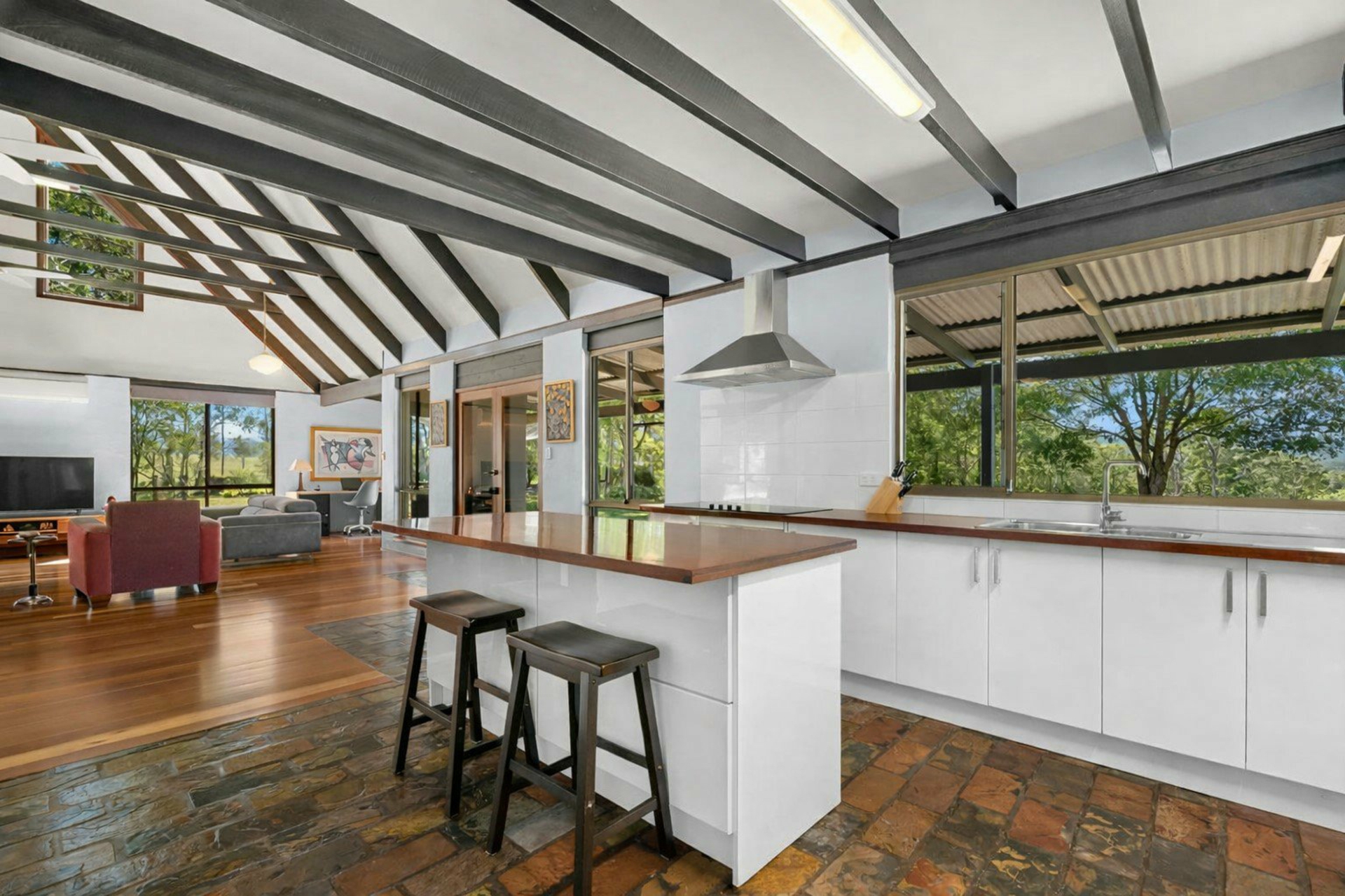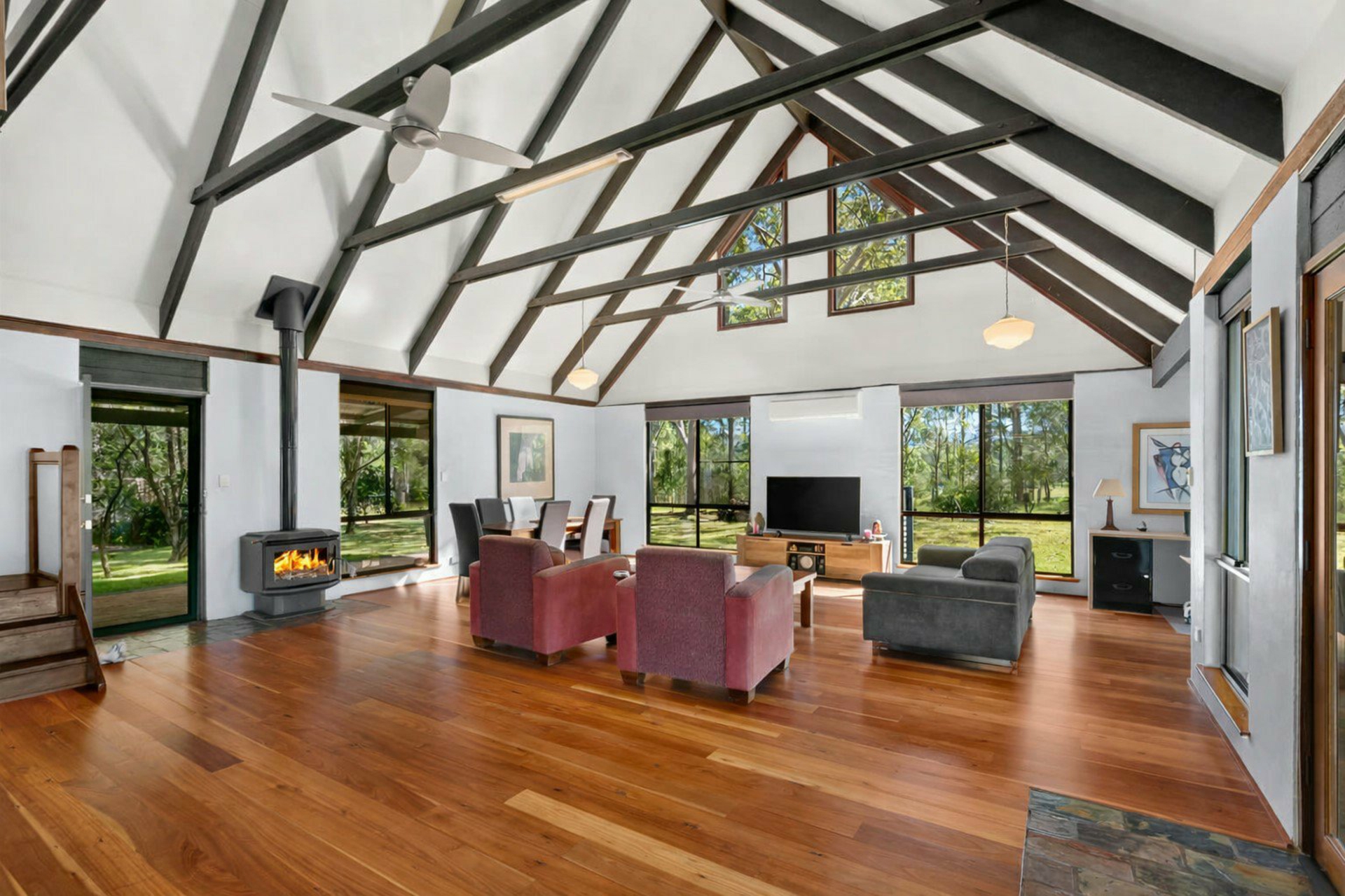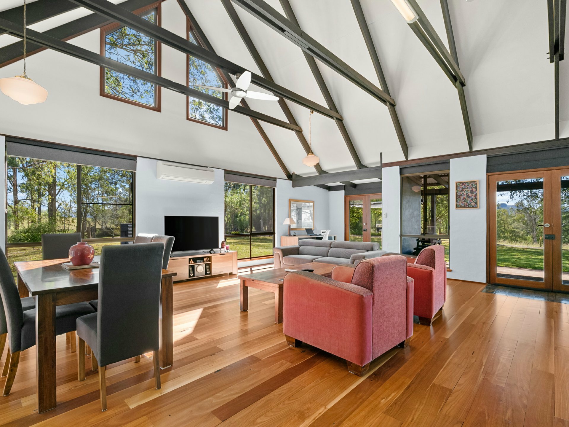 - Striking open plan living with soaring raked cathedral ceilings, exposed timber beams and abundant natural light through the large windows