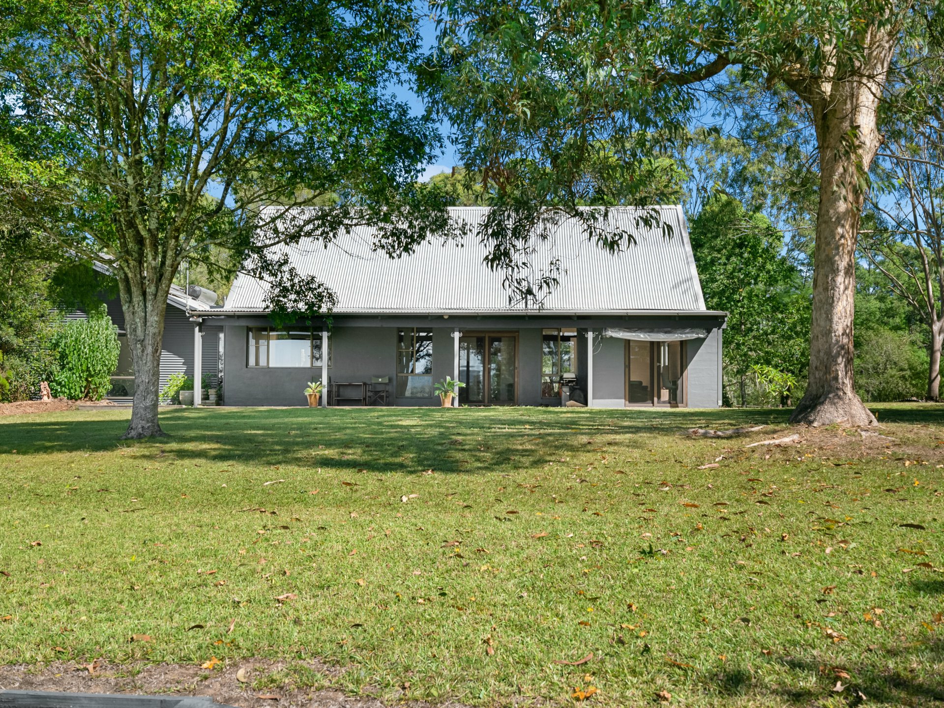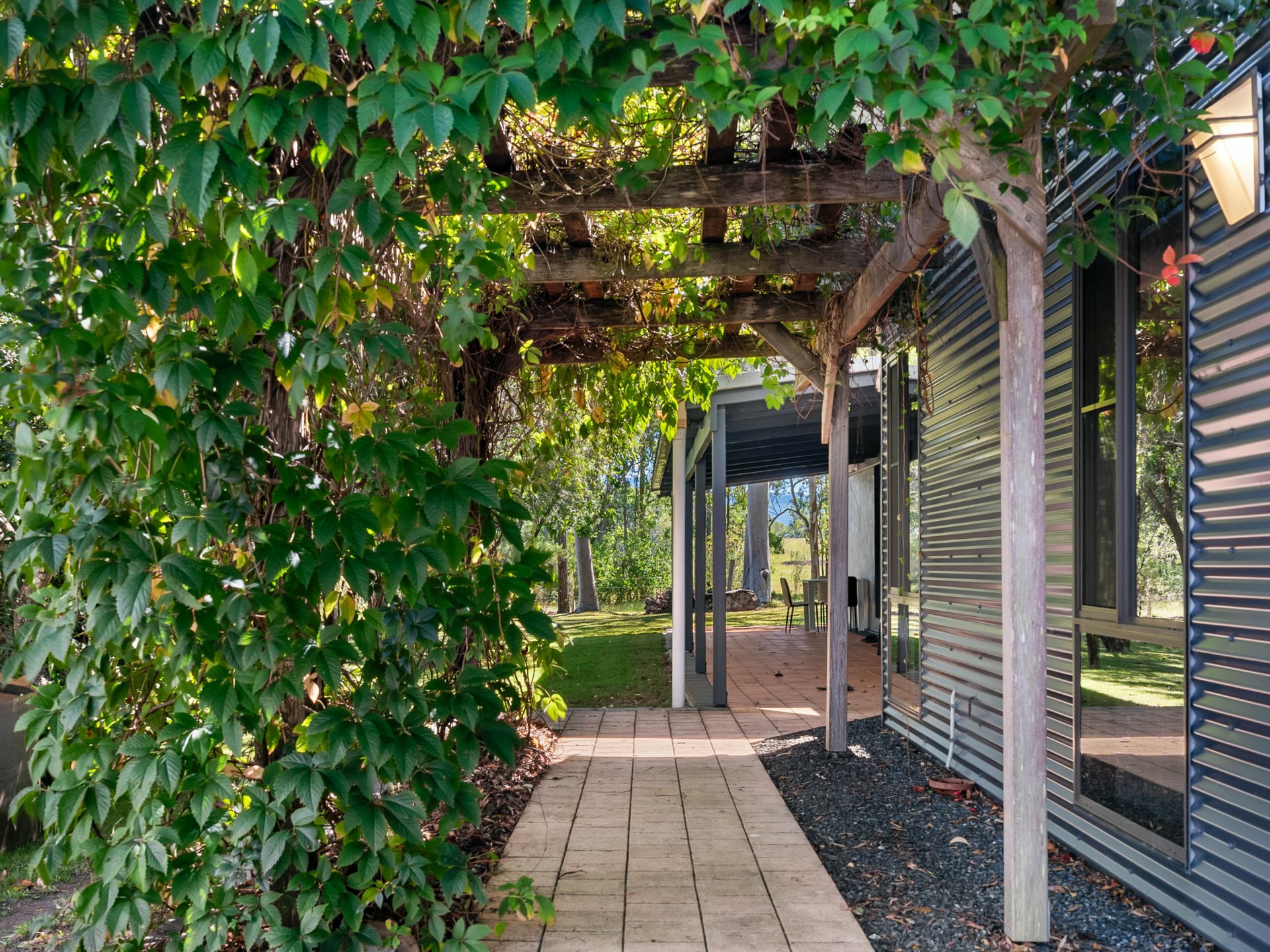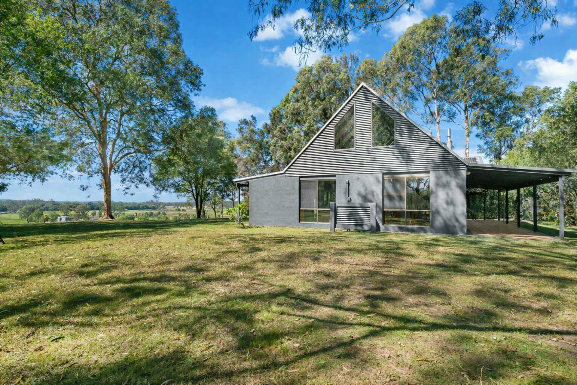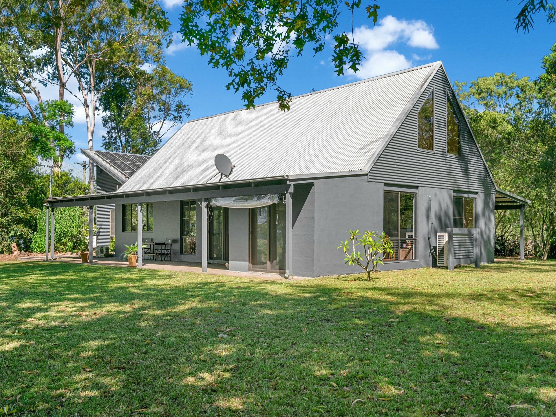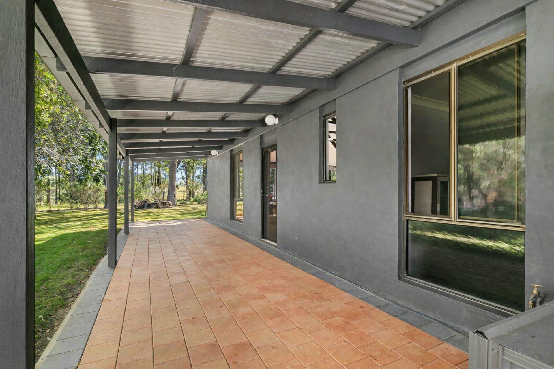 - Built with a pitched roof, a combination of rendered brick and Colorbond exterior, and large picture windows, the home presents a striking contemporary profile, complete with an inviting covered patio for relaxing or entertaining