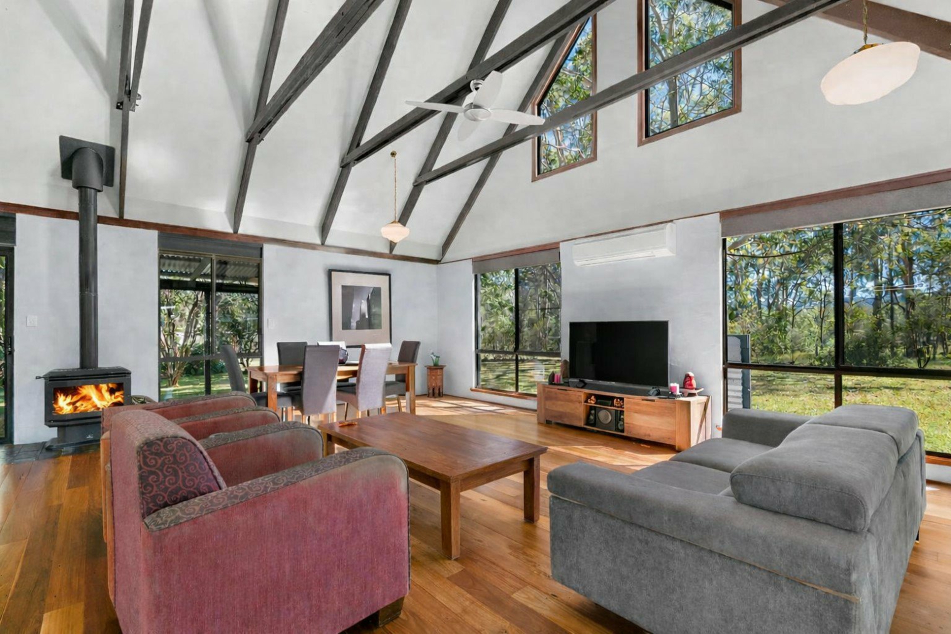 - Warm timber flooring, a cosy wood fireplace, air conditioning, ceiling fan, and pendant lighting create a welcoming lounge and dining space with leafy views to enjoy