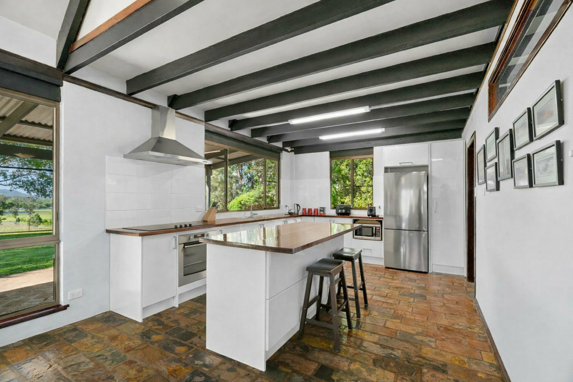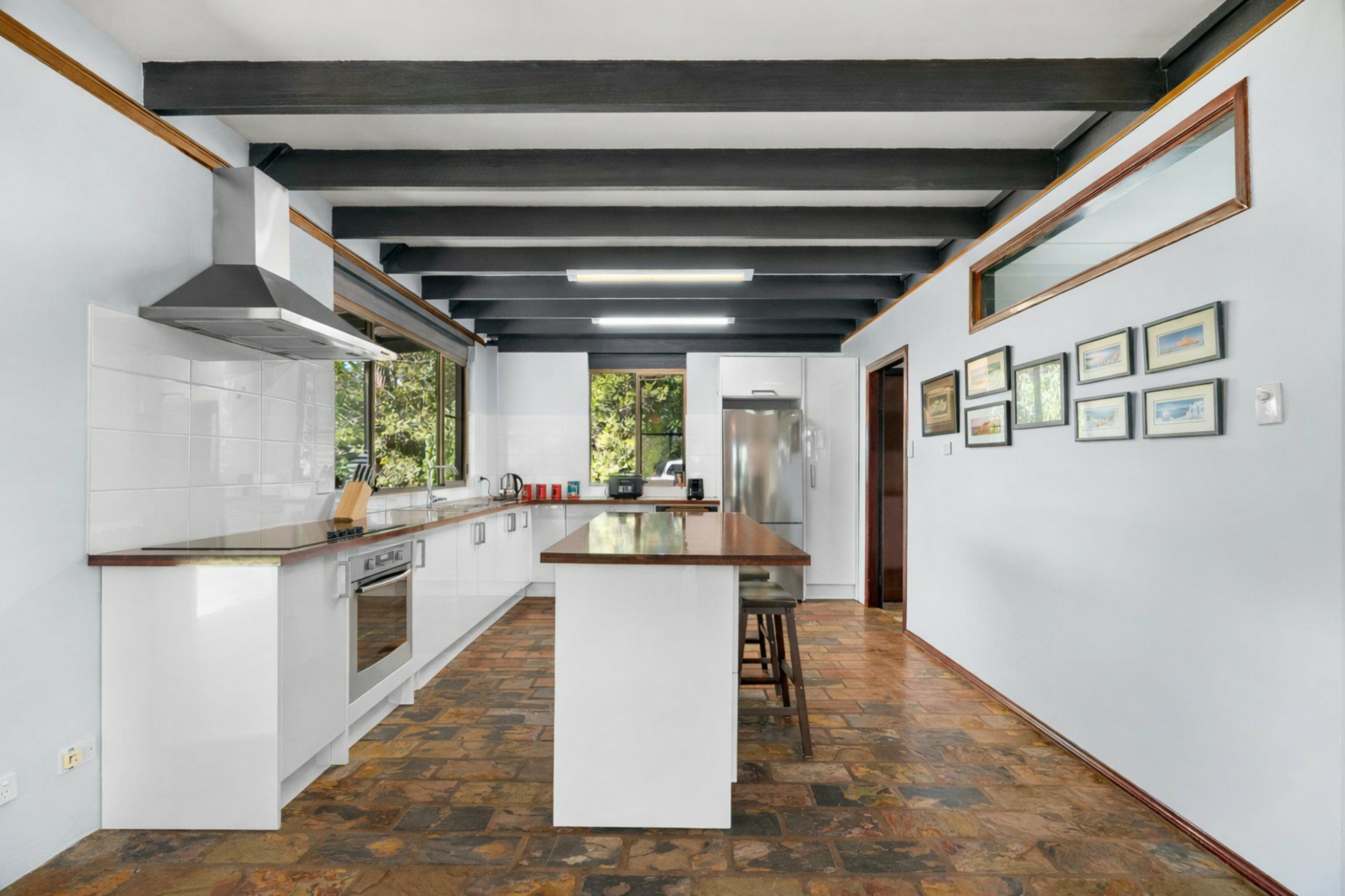 - The updated kitchen features slate flooring that enhances the home's earthy charm, timber benchtops, crisp white cabinets, modern appliances, and an island bench