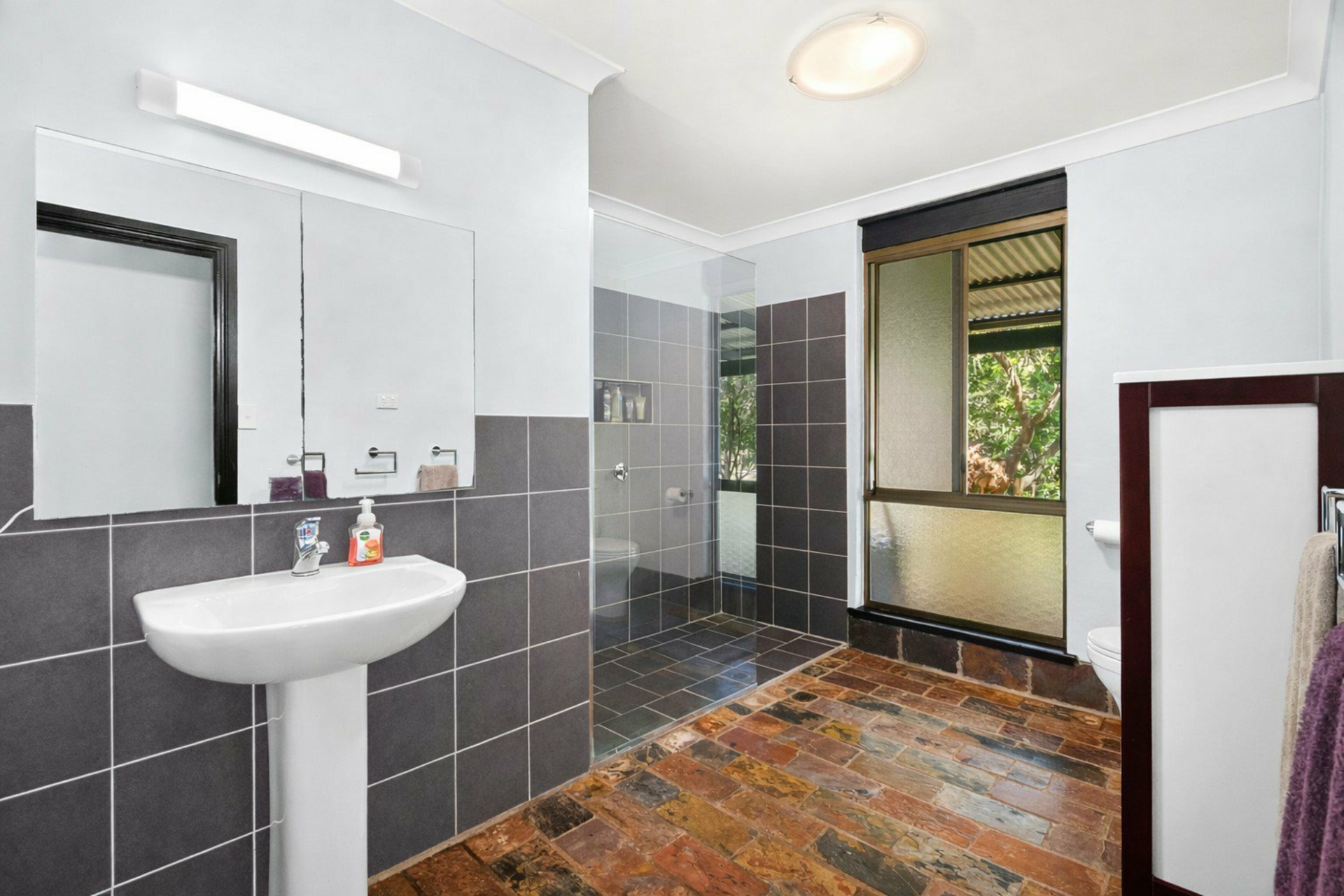 - Bathroom with a sleek pedestal basin, large walk-in shower with built-in niche, rich slate floor tiles and charcoal wall tiles, complete with toilet