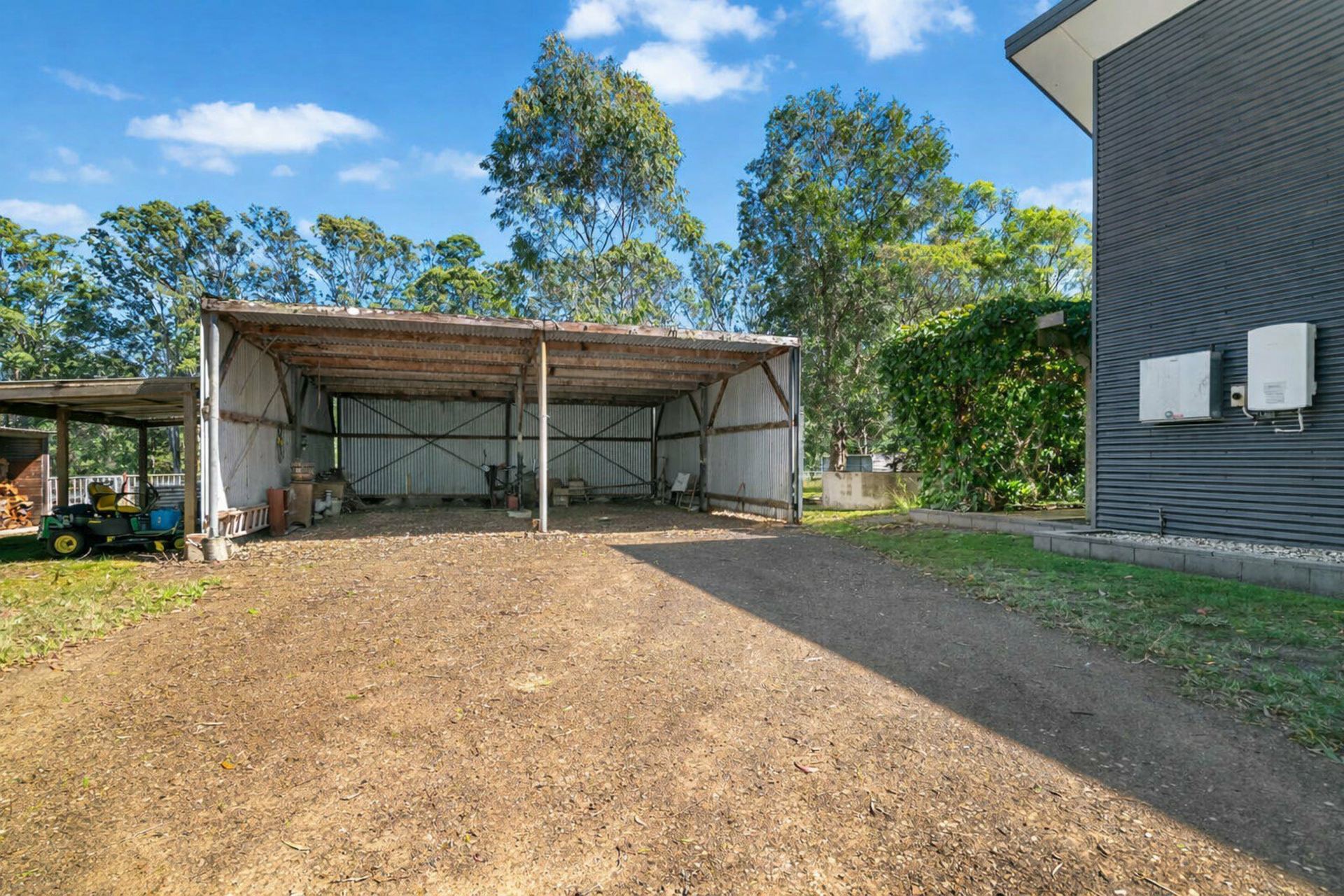 - Practical double carport with a sturdy corrugated roof and enclosed side walls, providing excellent all-weather parking for multiple vehicles. Adjacent to the carport is a handy storage bay ideal for tools, firewood or outdoor equipment, keeping the property organised and functional